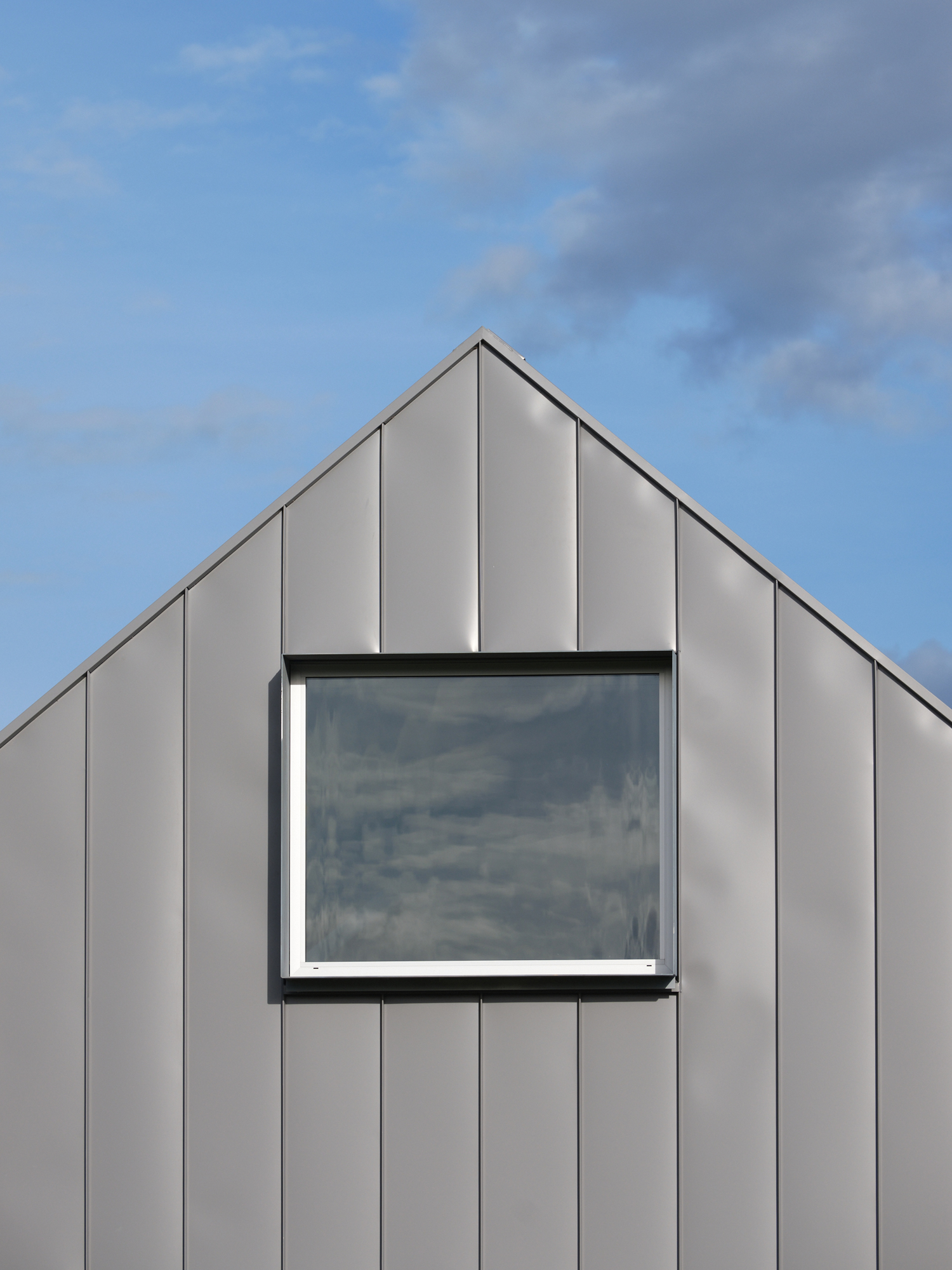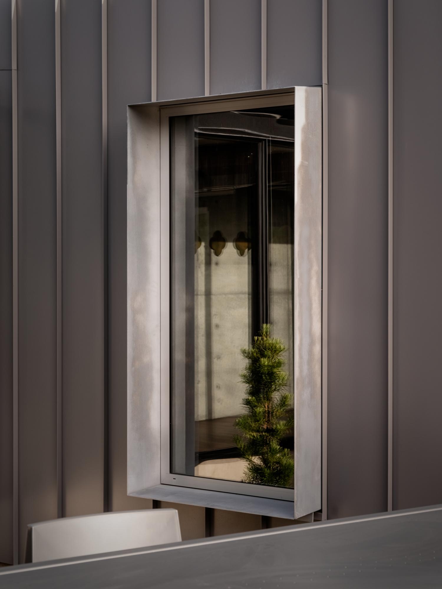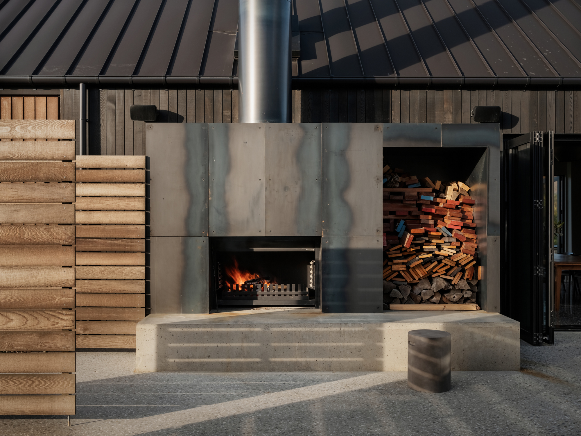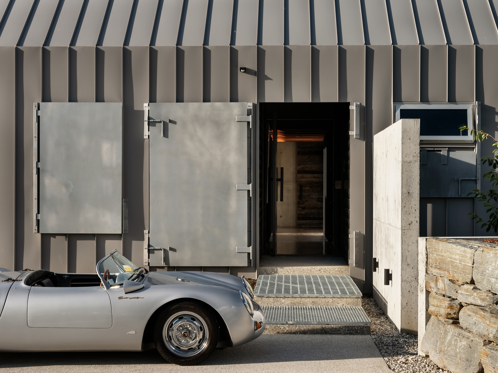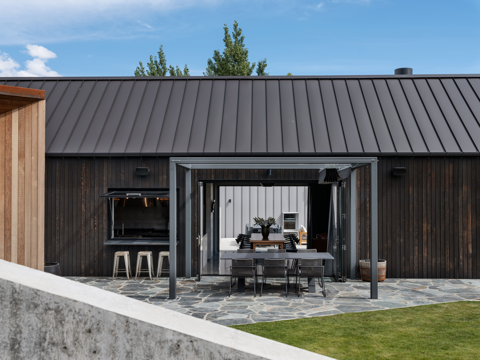 The bathrooms’ barn doors are made of frosted white glass rather than heavy timbers. The black steel hardware is sleek or sometimes jagged but always well proportioned. This is a respectful interpretation of the ‘rural’, of the countryside and its cultural signifiers. Nowhere is this ode to the farm more obvious than on the third, and final, structure — a building that, if personified, would be a sheep shearer who scrubs up well. Shiny corrugated, galvanised steel with a vertical profile, woolshed in form, materiality, and utilitarianism, it encompasses the garage and guest rooms and is built to be almost monolithic: a solid volume with hidden gutter details, no recesses, yet carefully articulated pop-out windows to create a variation in the otherwise continuous rhythm. The main door is a galvanised steel one that looks as if it belongs on a commercial fridge.