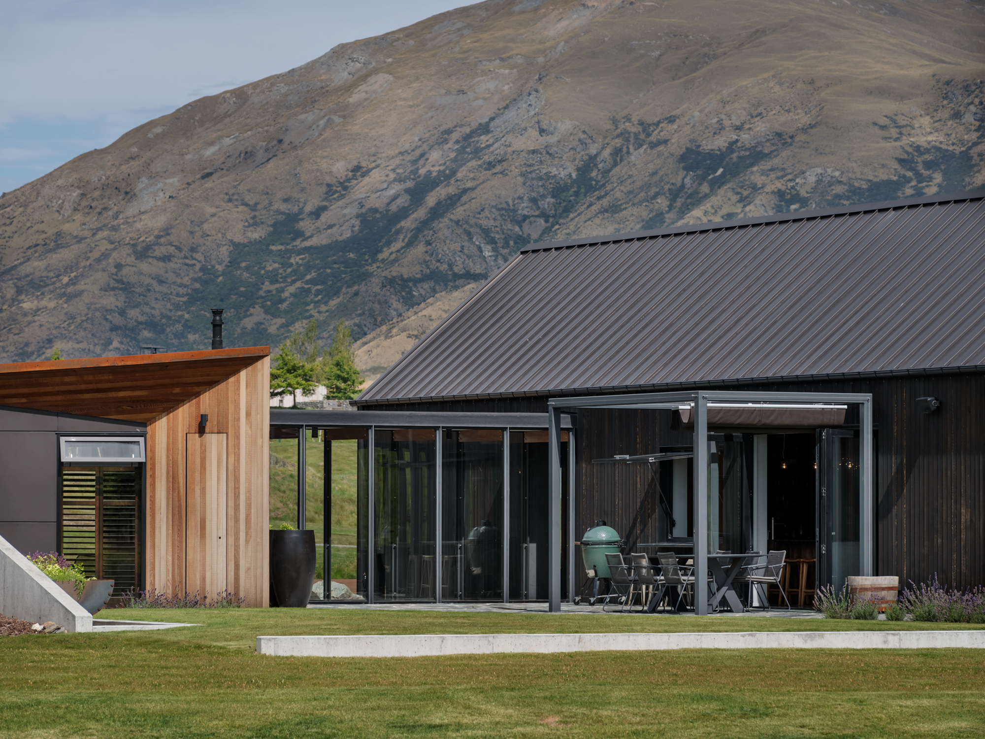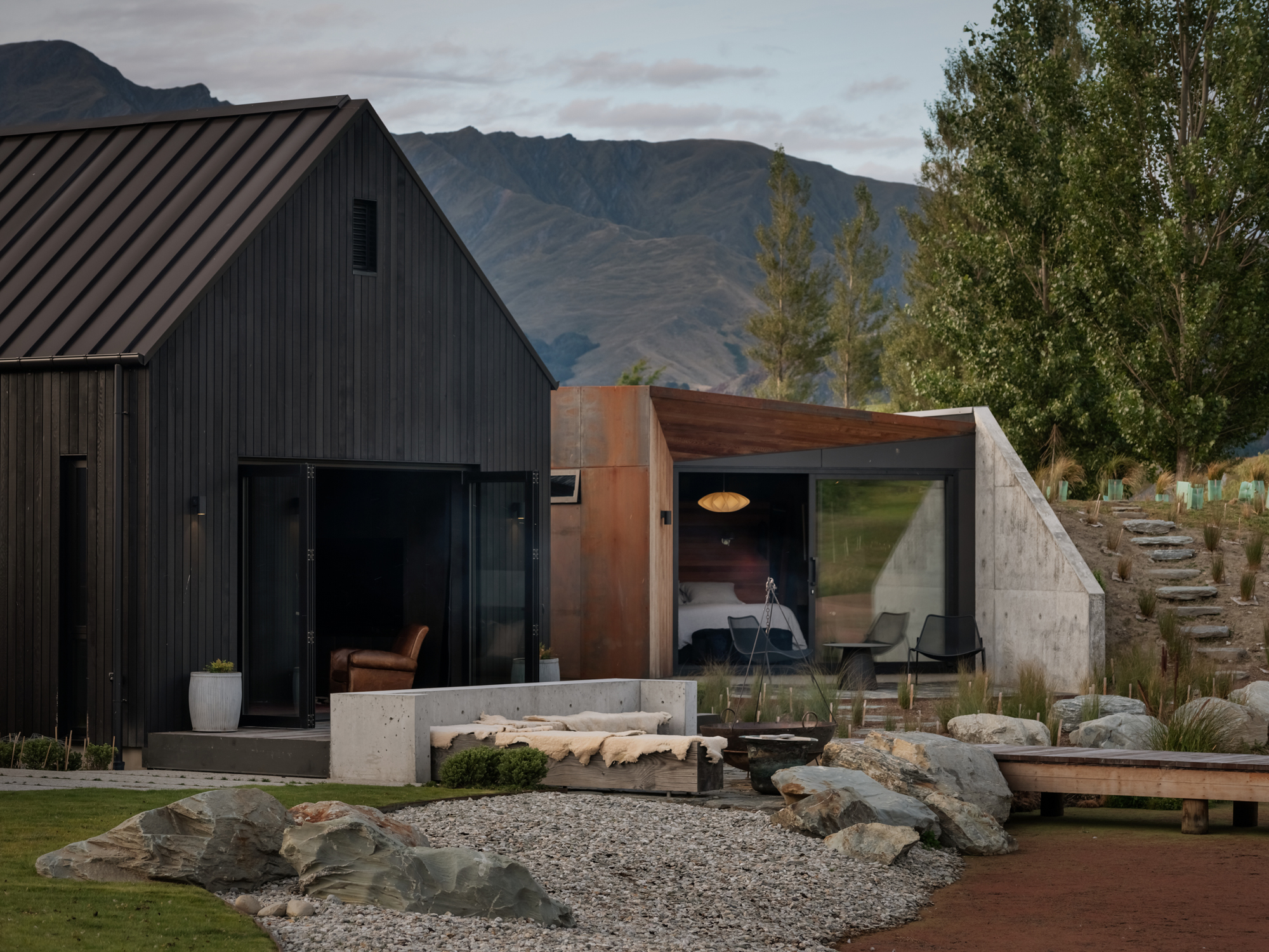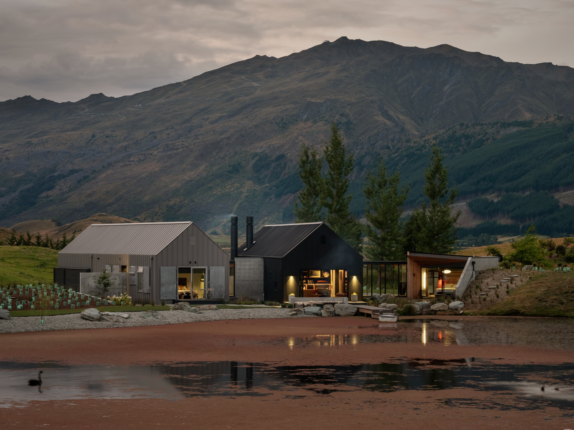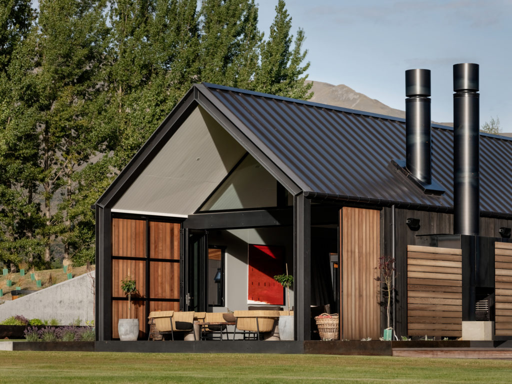This is a house made up of three, separate structures gathered at the pond’s edge as if to gaze upon a swaying dinghy or the land beyond. Out there are the roche moutonnées: craggy, hummocky, grass-covered undulations formed eons ago by the weight of passing glaciers pushing and shaping the underlying bedrock into asymmetrical mounds. Past that, of course, are those bigger ‘mounds’ in the distance: the Remarkables and Coronet Peak.
