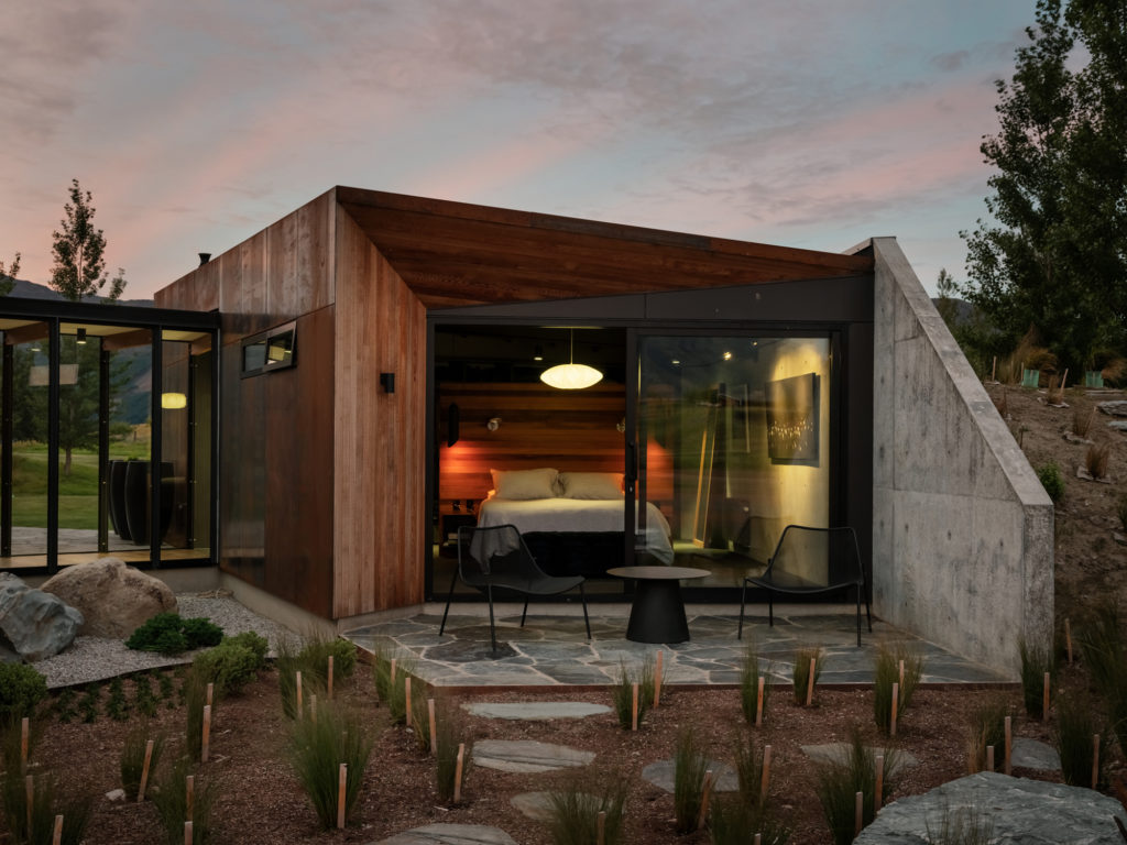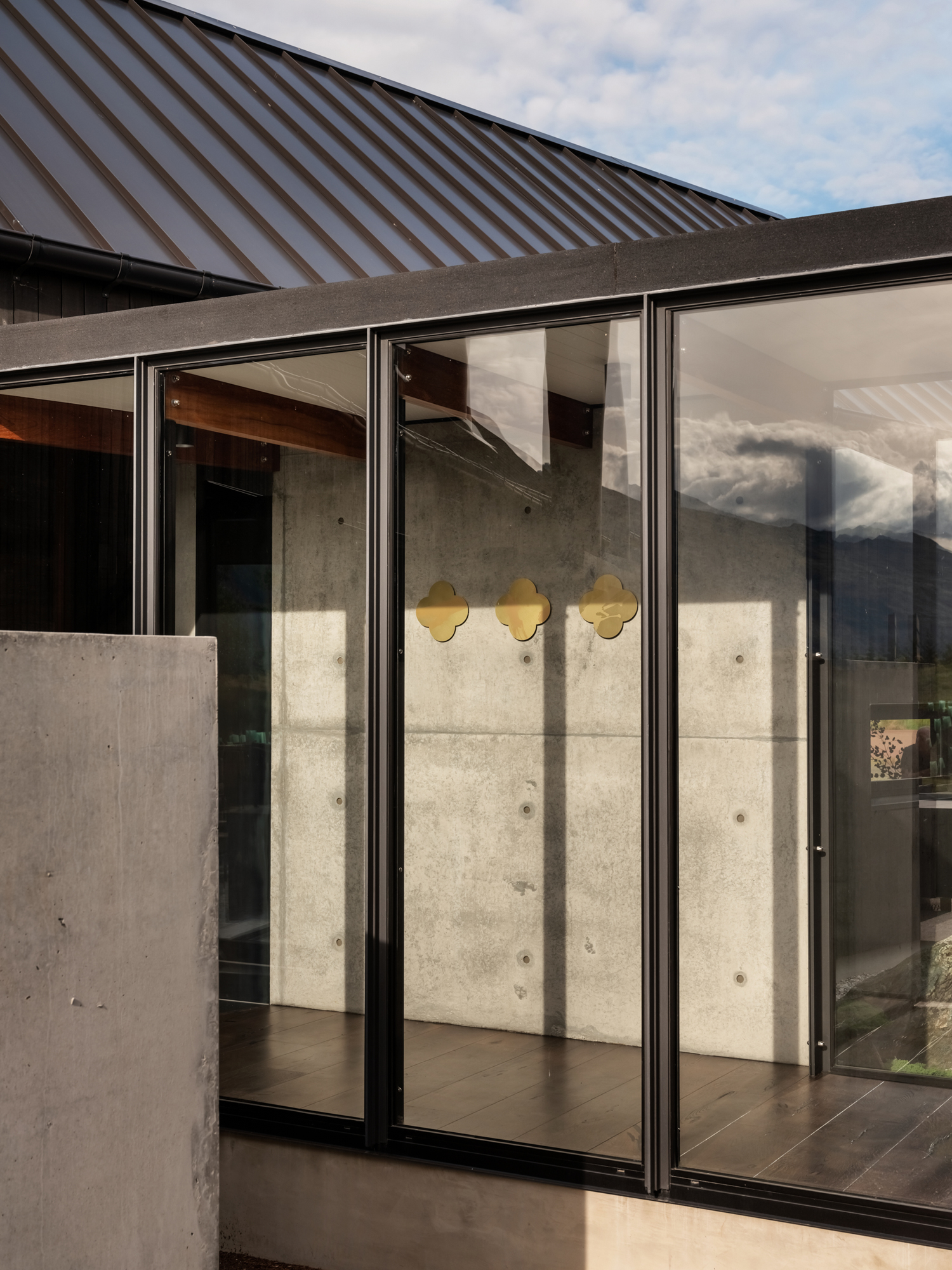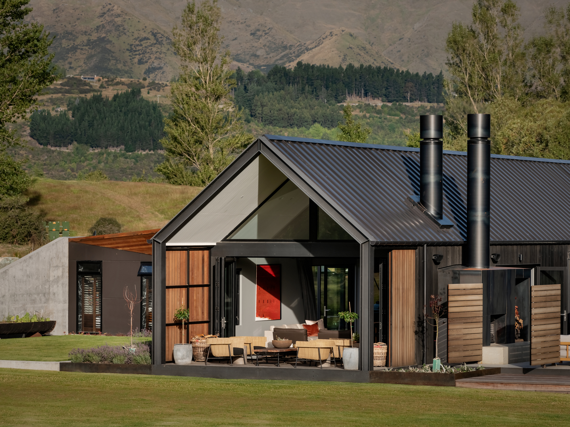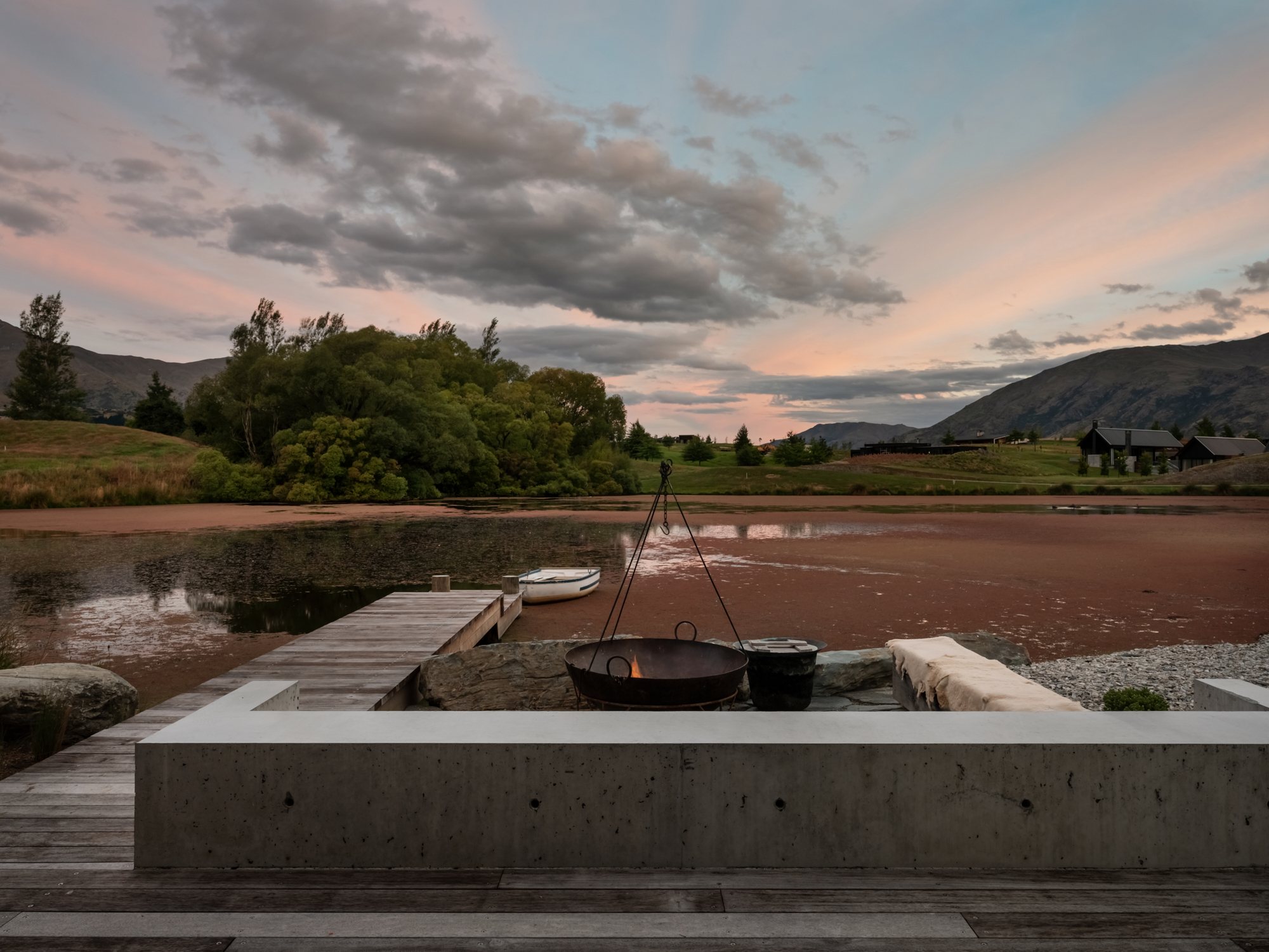 This is a house made up of three, separate structures gathered at the pond’s edge as if to gaze upon a swaying dinghy or the land beyond. Out there are the roche moutonnées: craggy, hummocky, grass-covered undulations formed eons ago by the weight of passing glaciers pushing and shaping the underlying bedrock into asymmetrical mounds. Past that, of course, are those bigger ‘mounds’ in the distance: the Remarkables and Coronet Peak.