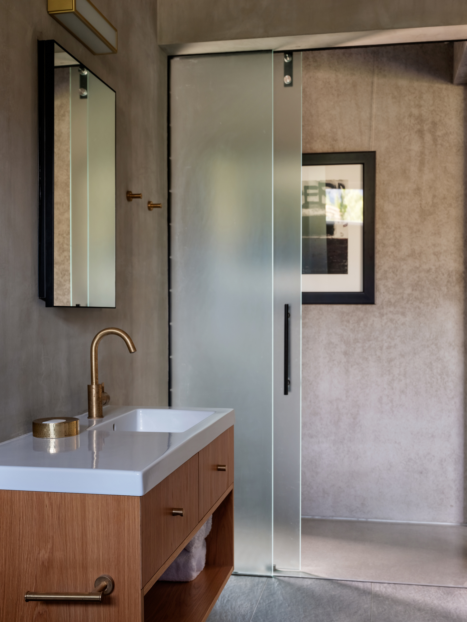 The arrival through the front door — in the garage/guest structure — leads the eye to a concrete wall at the far end. This material forms a sort of circulation motif, a spine connecting the three structures and acting as the main, grounding material which stitches the trio into a subtle whole.