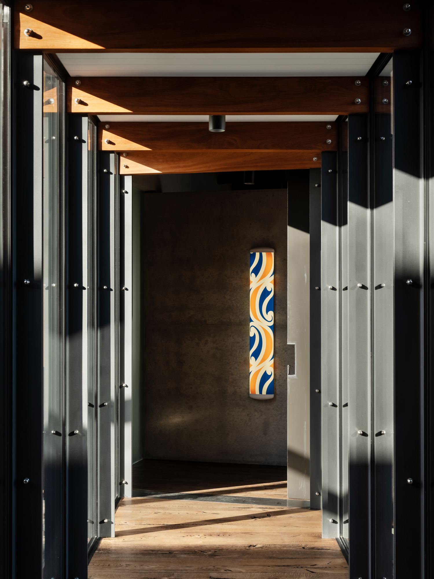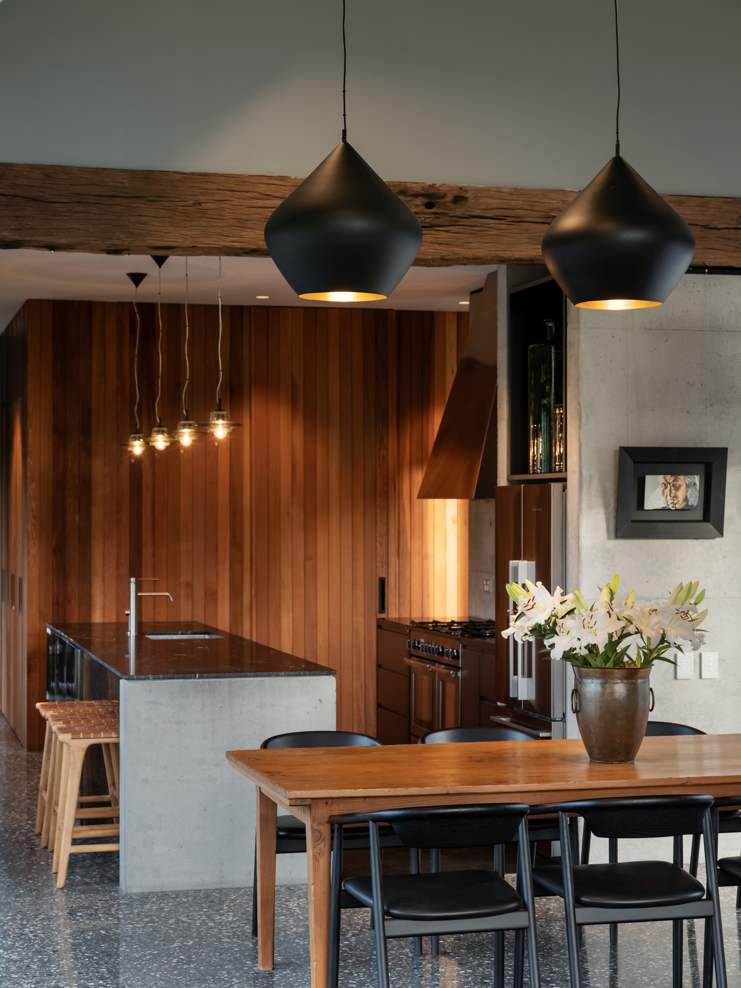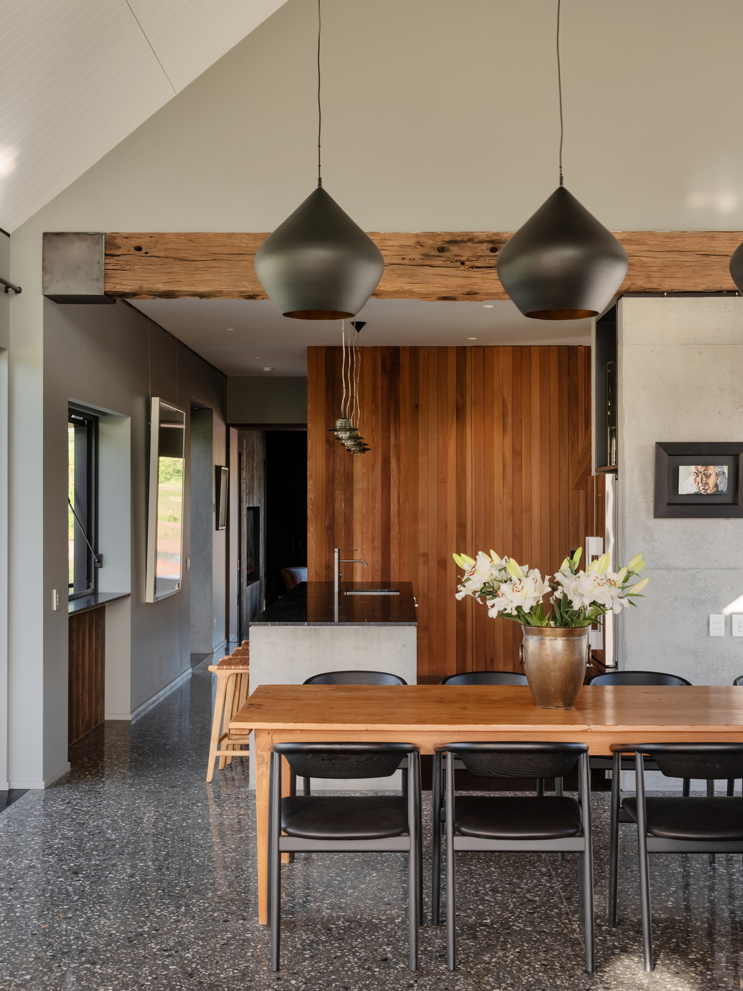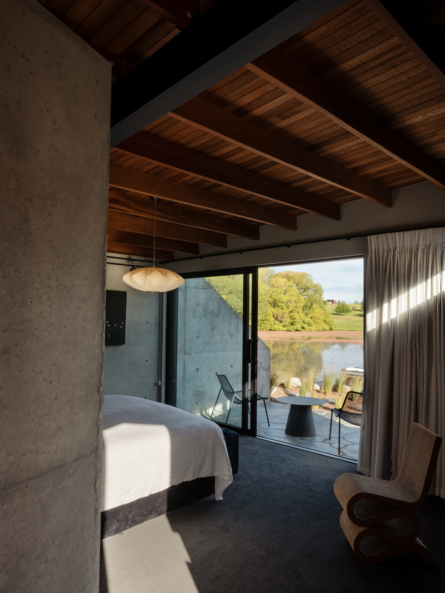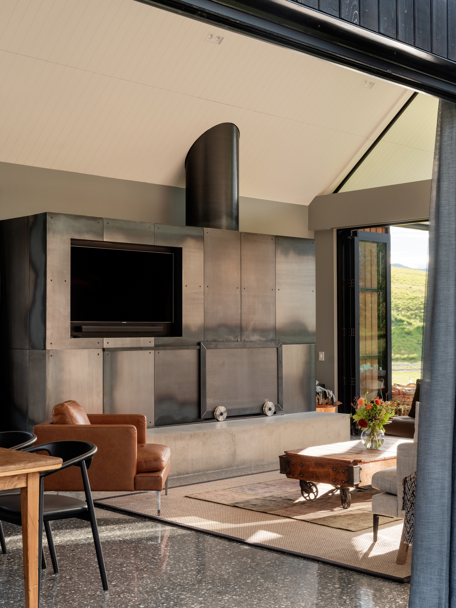 The interior design — a collaboration between one of the owners and Kay Gray — is strongest here. Fitting seamlessly within the rural theme, the rusticity of the timber emulates old, South Island farm rafters or lintels. These chunky, tactile pieces, when combined with the bespoke steel hardware on barn-style hanging doors and on brackets, and the rhythmic patterns of the steel bracing in the walkways, seem also to hint at United States’ architect Olson Kundig’s railroad design–inspired detailing. Andrew agrees with the reference.