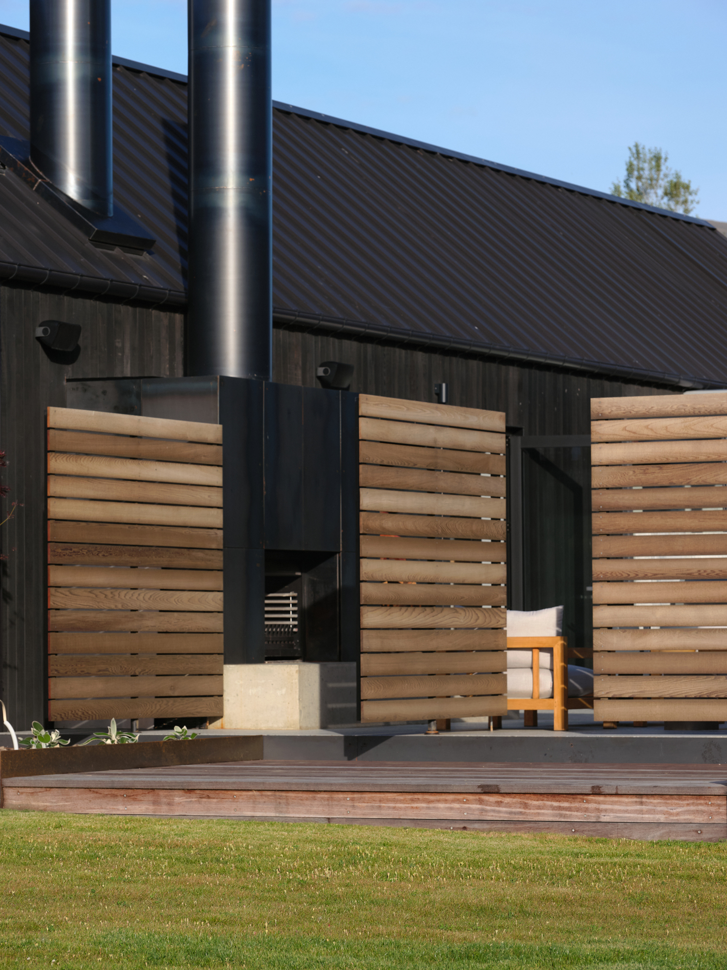“The stacked timber screens can pull right back. They are shutters that pivot off the centre and cantilever, allowing the central courtyard to be shut off. The wing detailing blocks out about 75 per cent of the prevailing wind,” according to Andrew.