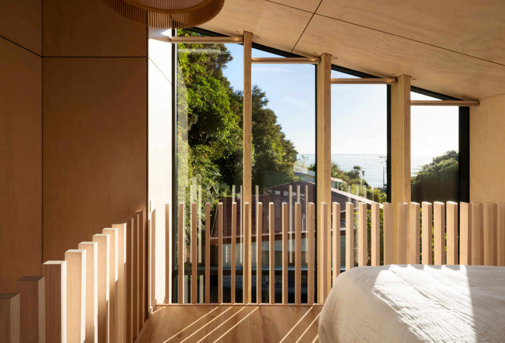 As this is a steep gully, daylight is brought inside through the punctuation of skylights and a large, north-facing window. Whitewashed radiata pine plywood walls lighten the interiors further and create a series of low-maintenance, warm, and cosy spaces.