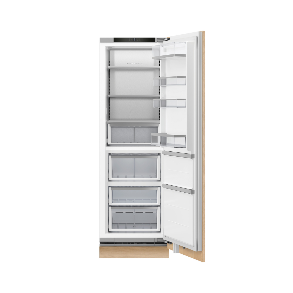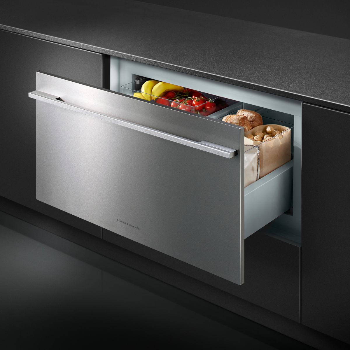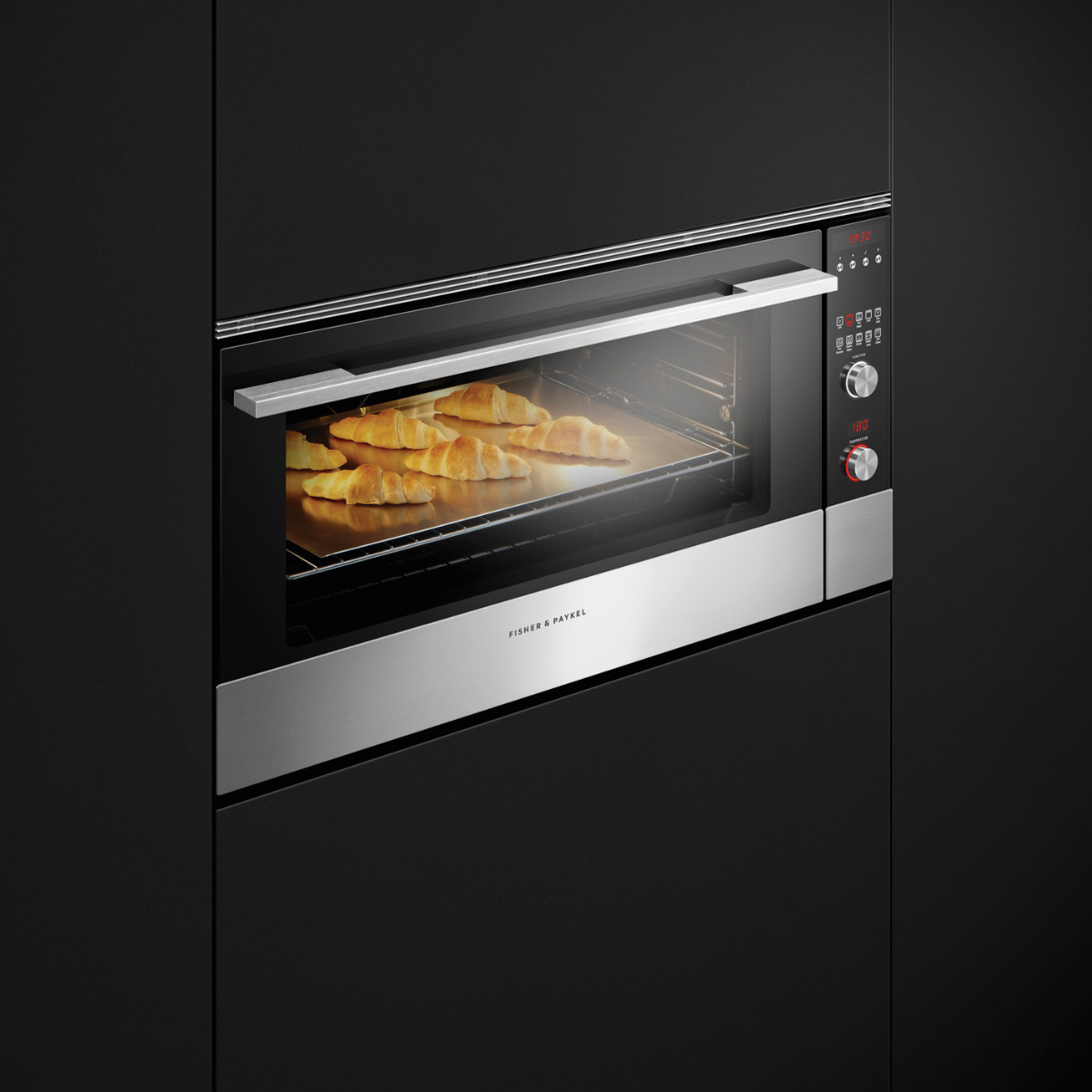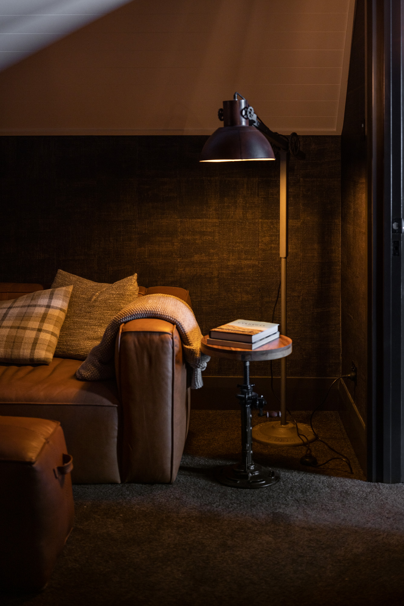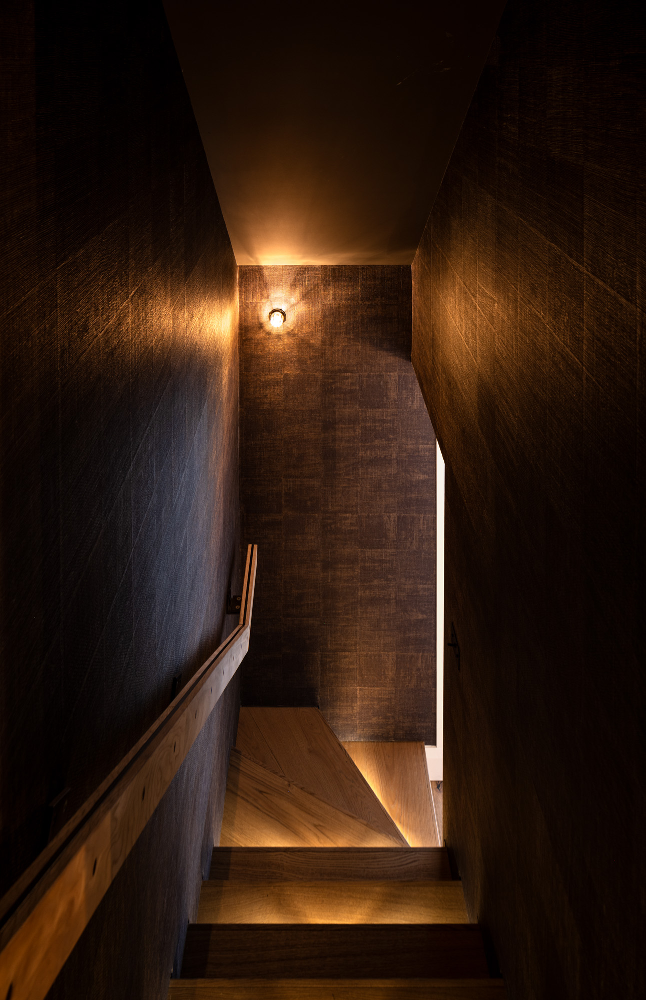 Here, highly textural wallpaper meets the warmth of timber, while intentionally muted tread illumination casts angled pools of light.