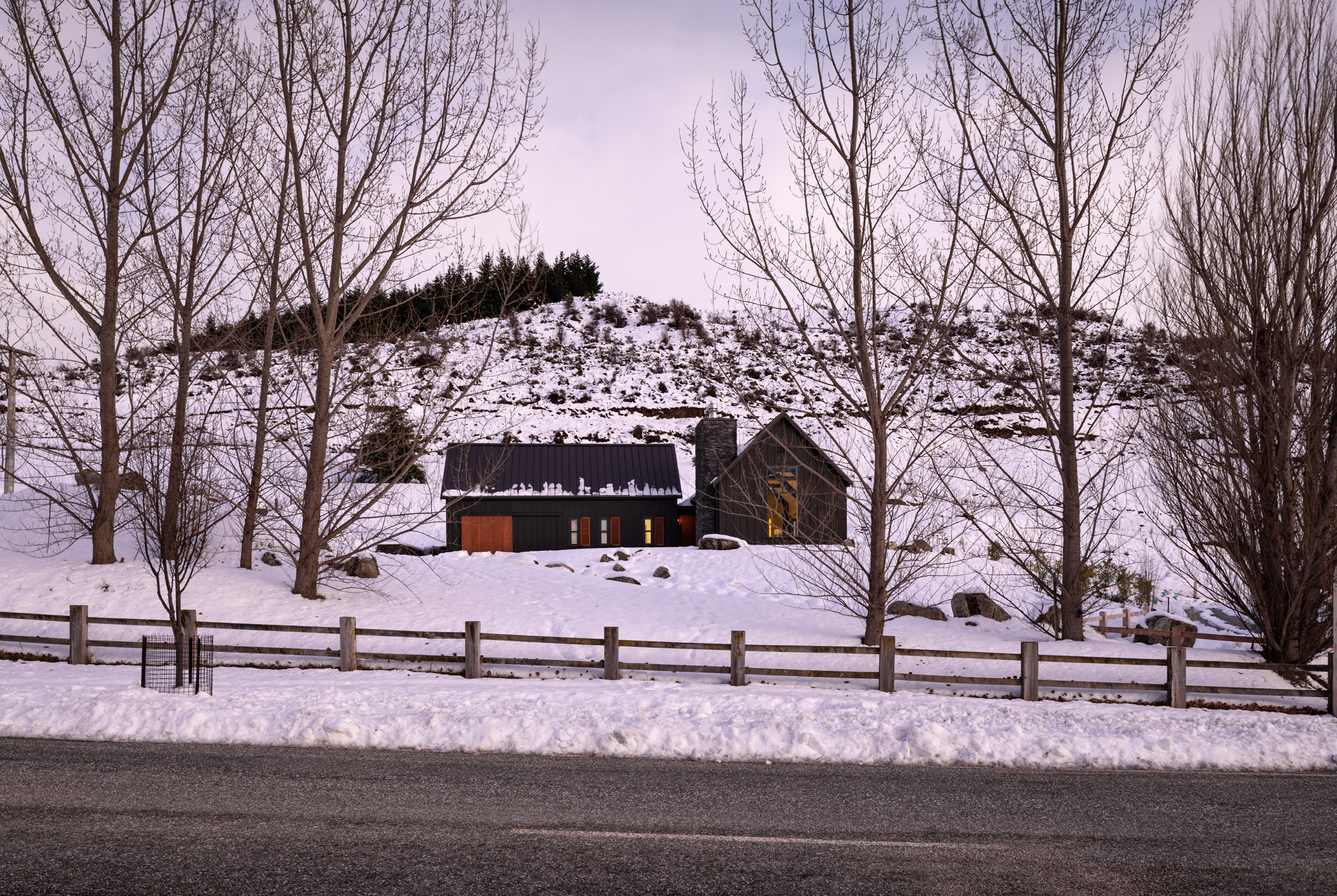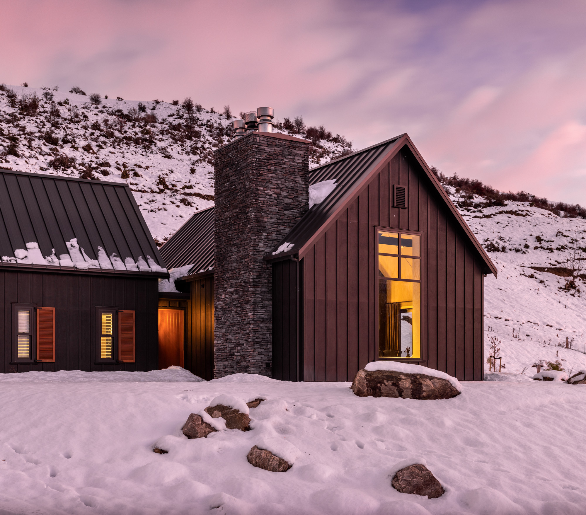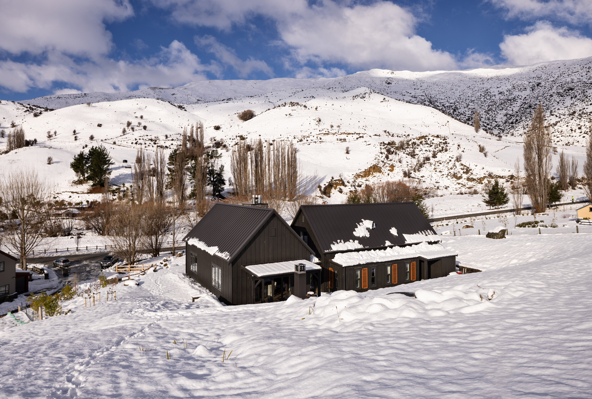 In winter, the landscape is often cloaked in snow — the simple gabled forms are sympathetic to the rural alpine environment. Beneath the snow, the owners have planted around 1000 tussocks, while rocks excavated to create the building platform form the boundaries of the driveway.