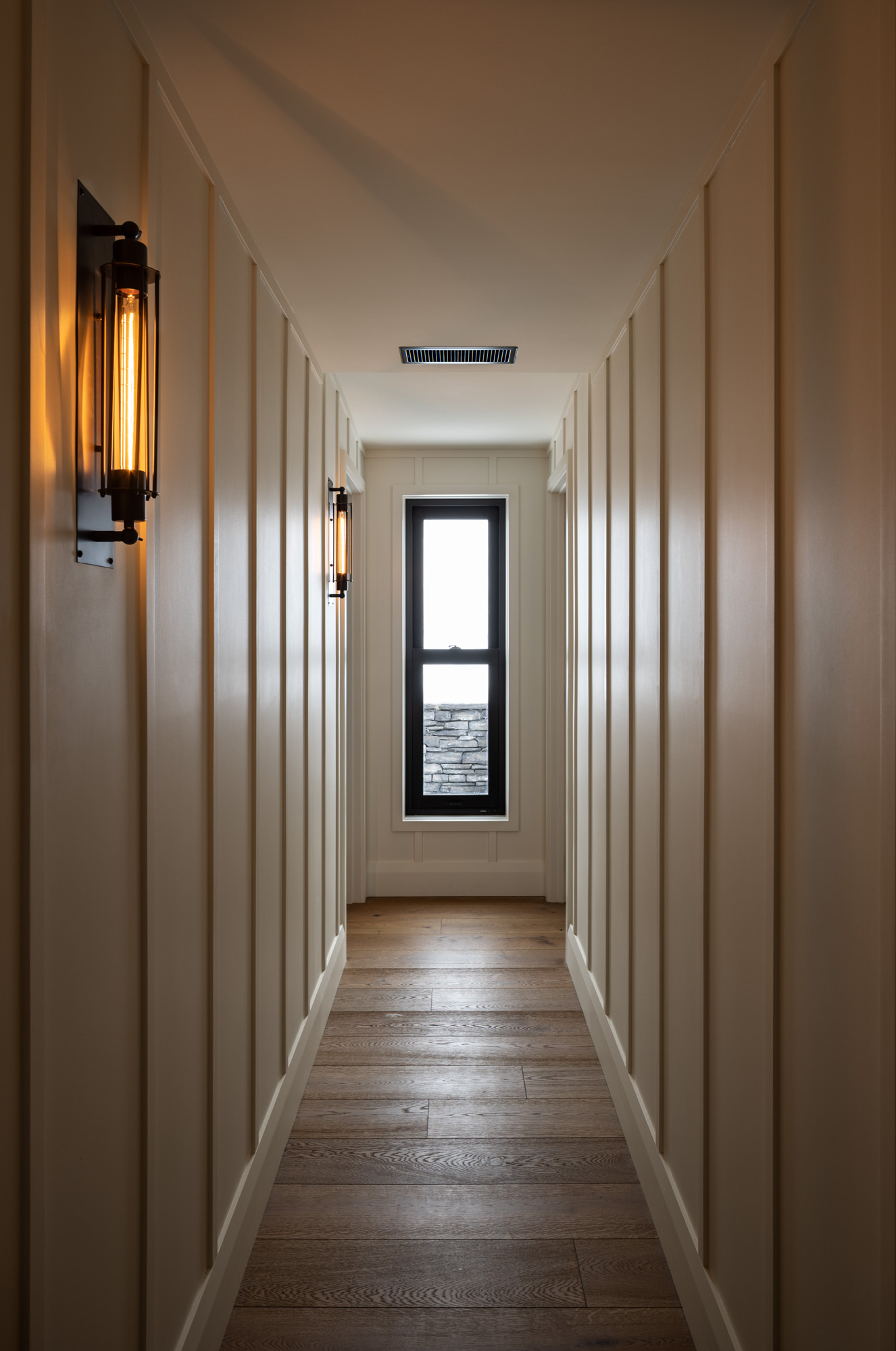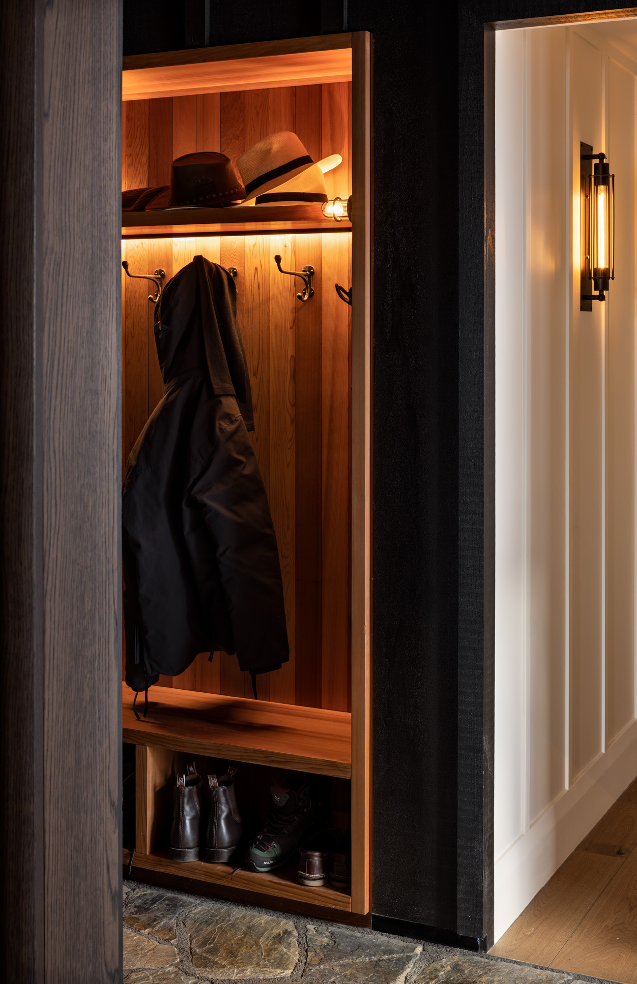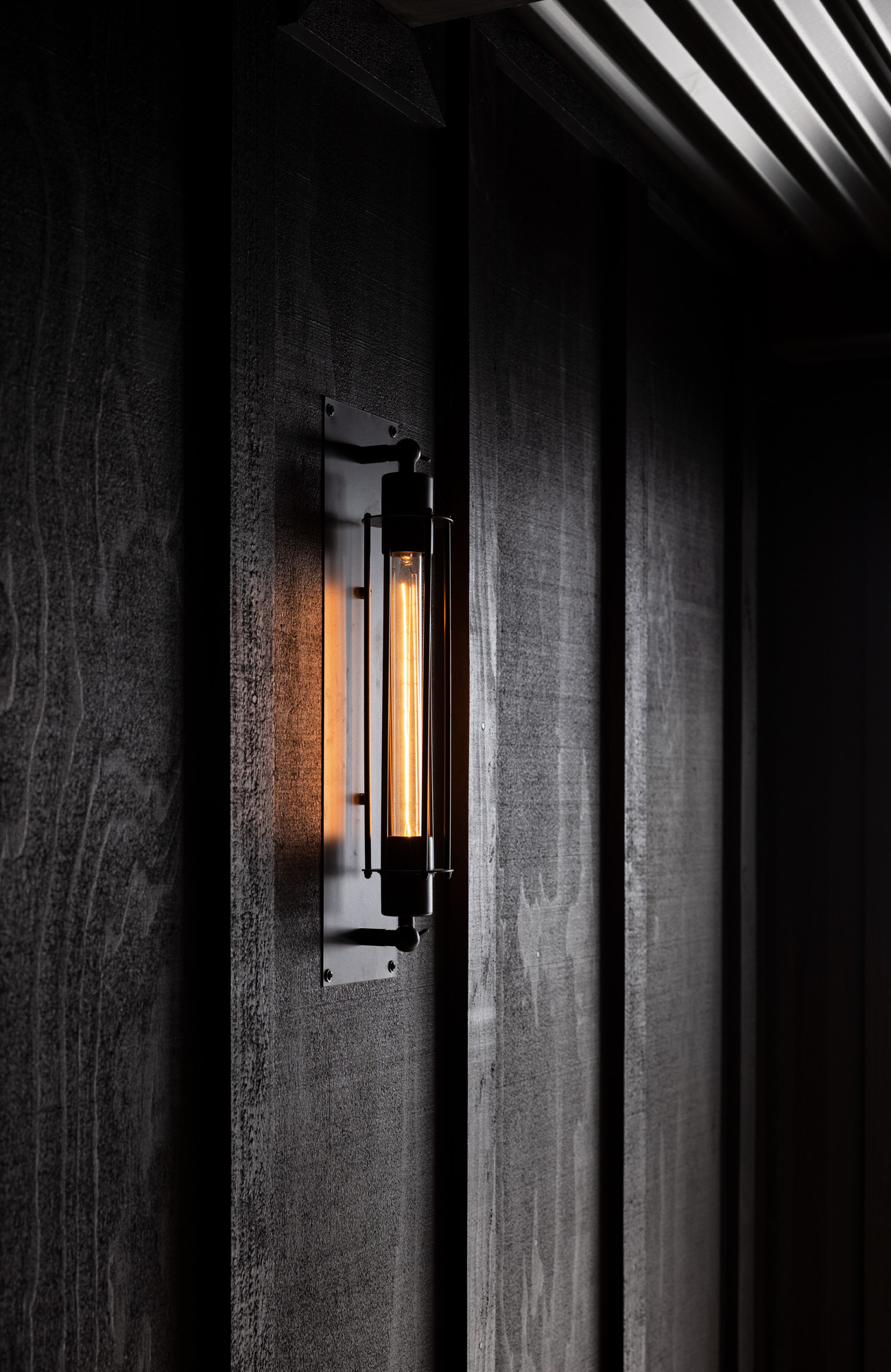 Careful placement of lighting between the board and batten detailing delivers a rustic charm.