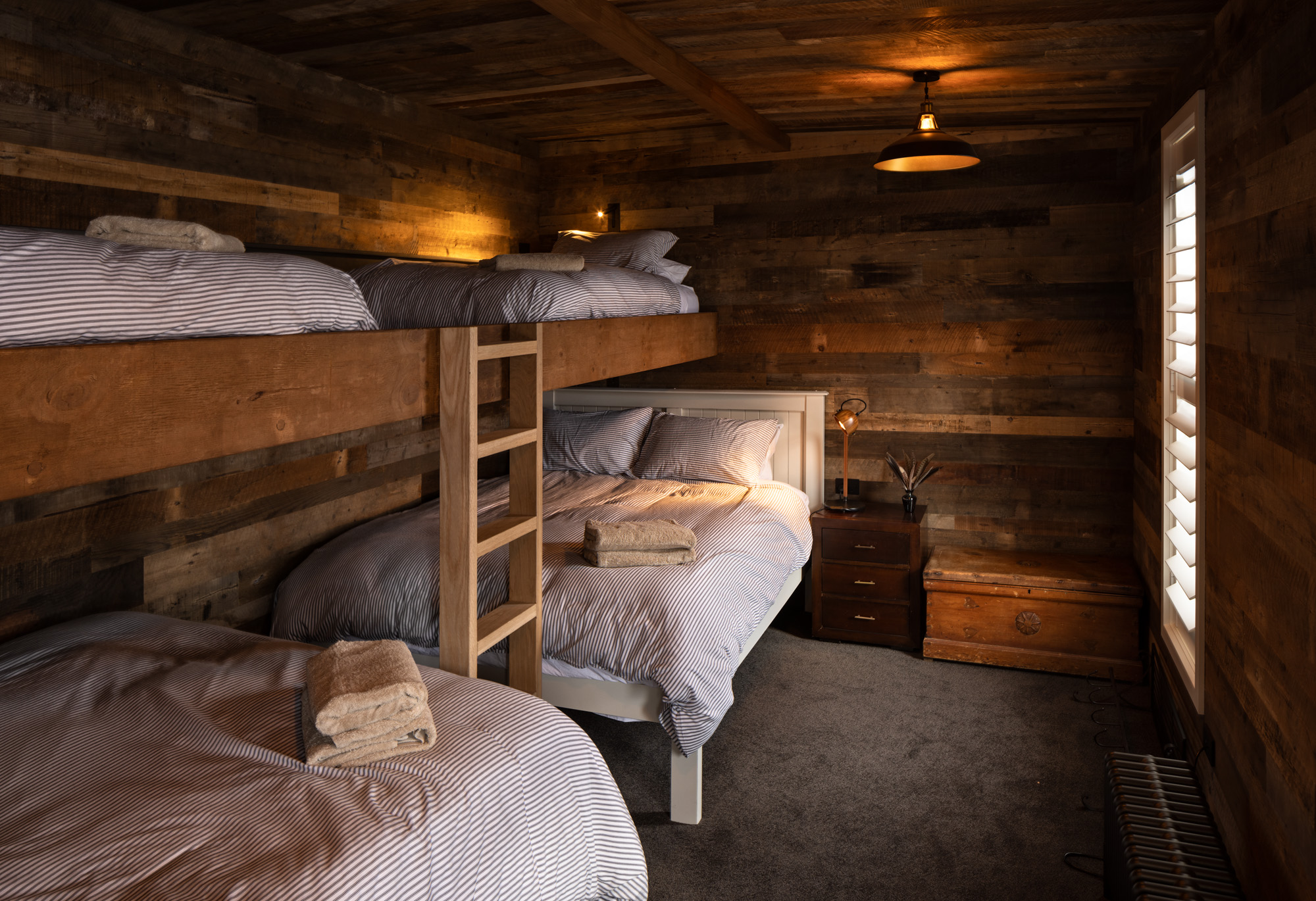 Lined in recycled timber, the bunk room has a textural, rustic charm.