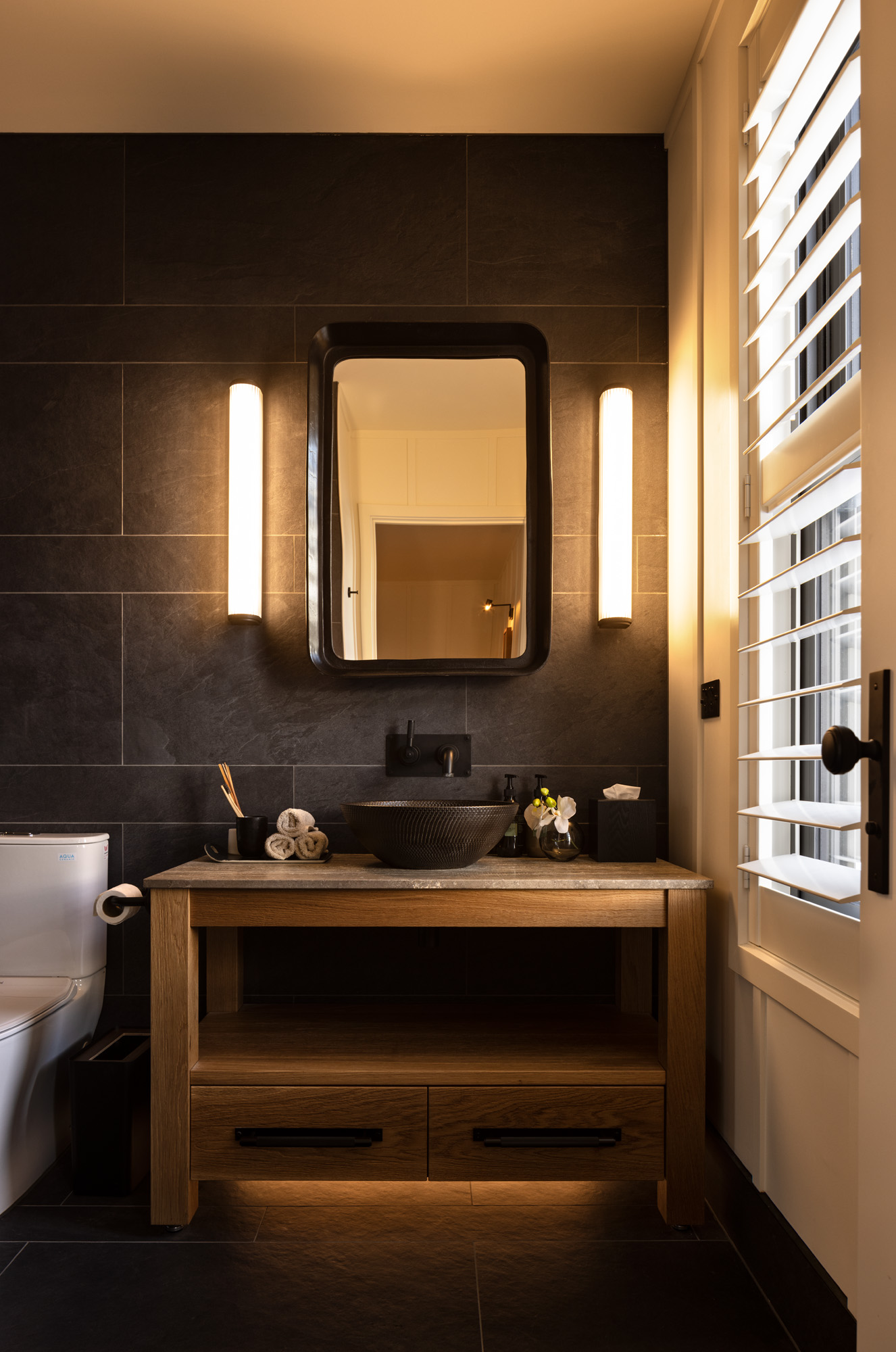 “The tapware we selected has a slightly industrial feel. We wanted it to be grunty, and to tie in with the kitchen tapware. Dark textured tiles line the walls while leathered titanium vanity tops meet bronzed bowls.