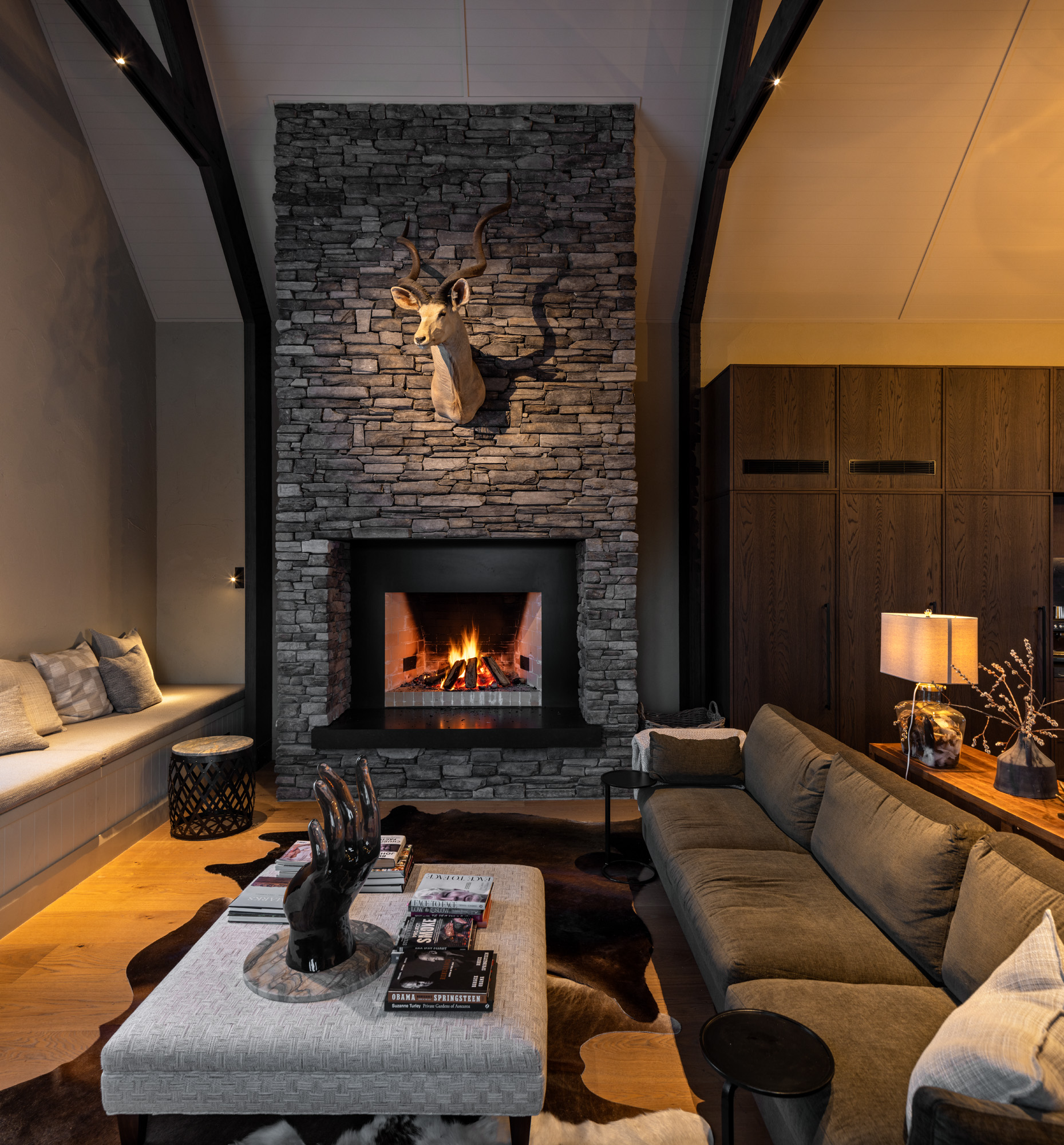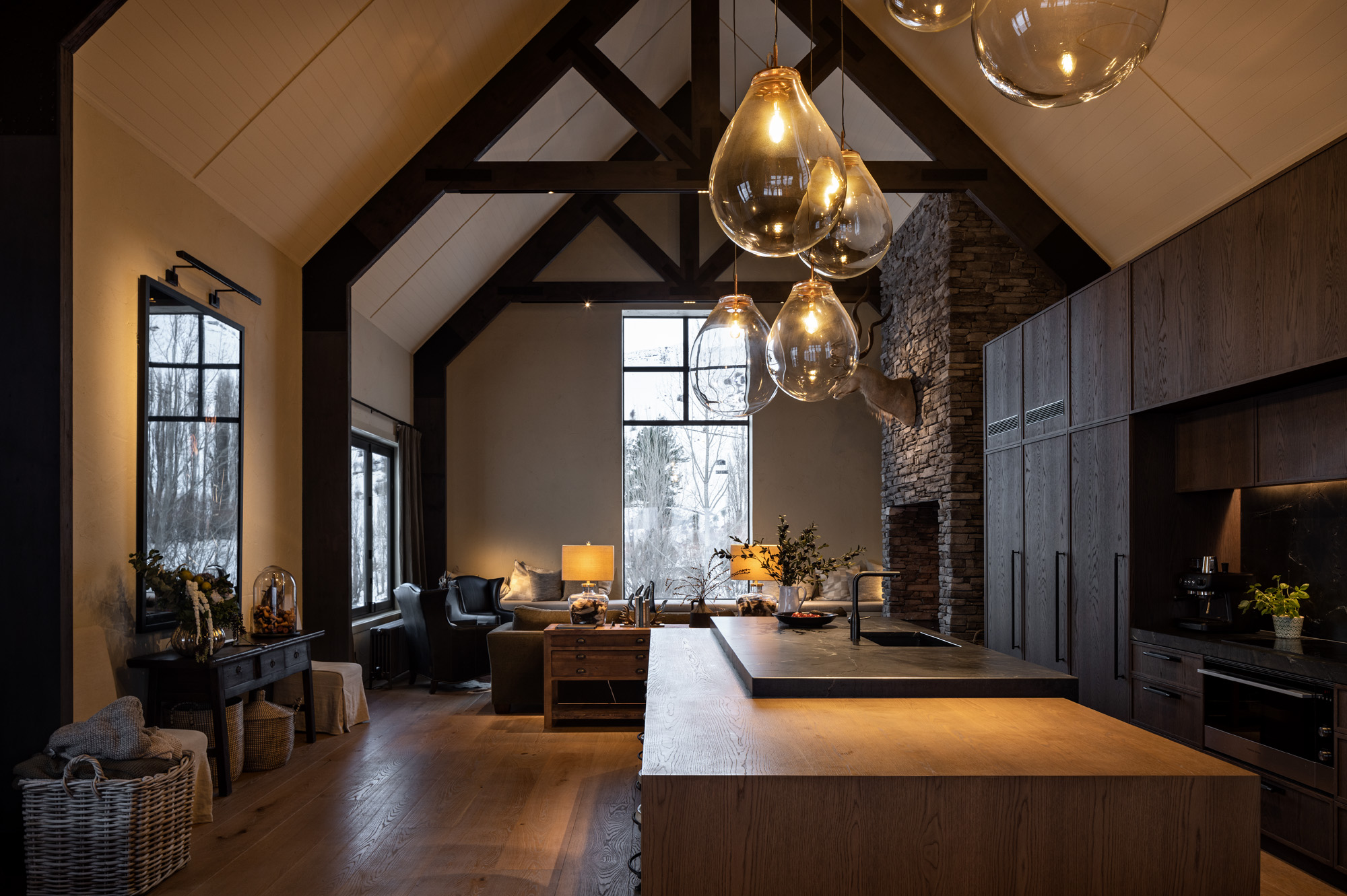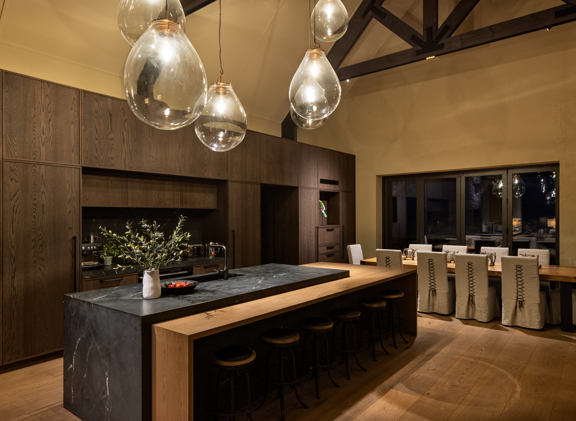 Referencing the textures and tones prevalent in the valley, the internal material palette is a rich and often sumptuous tapestry of texture and colour. In the kitchen, a leathered Negresco stone benchtop meets stained oak cabinetry. Adjacent, a stone fireplace is a sculptural centrepiece. Fumed oak floors continue indoors the golden hues of the exterior Clutha quarry stone. Rendered plaster walls offer a textural finish; hand-blown glass pendants hang from the 7m-high raked ceiling, while concealed track lighting in the exposed beams allows for targeted illumination.