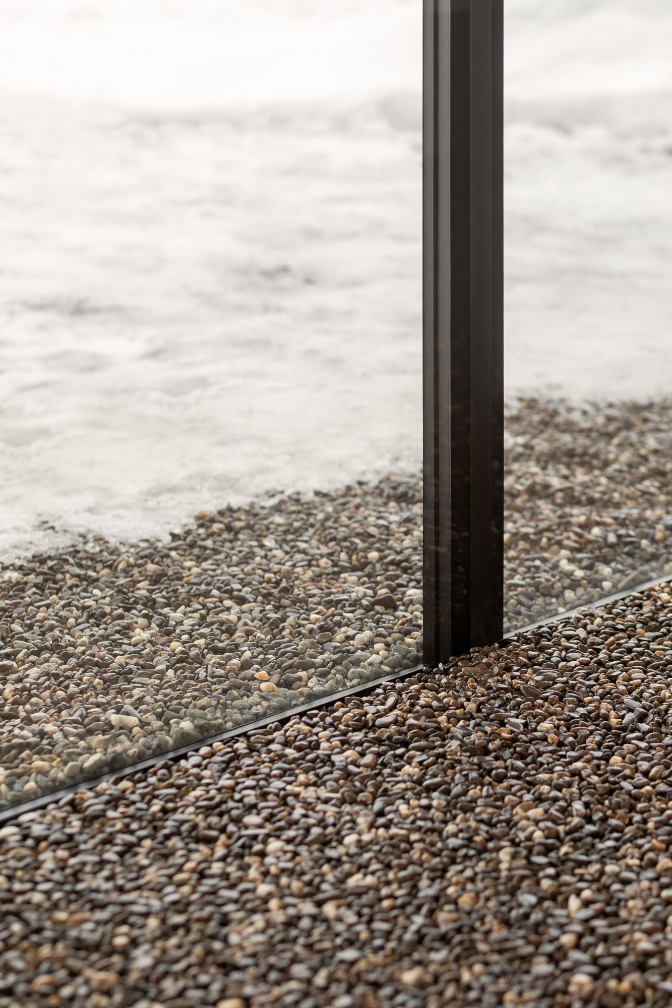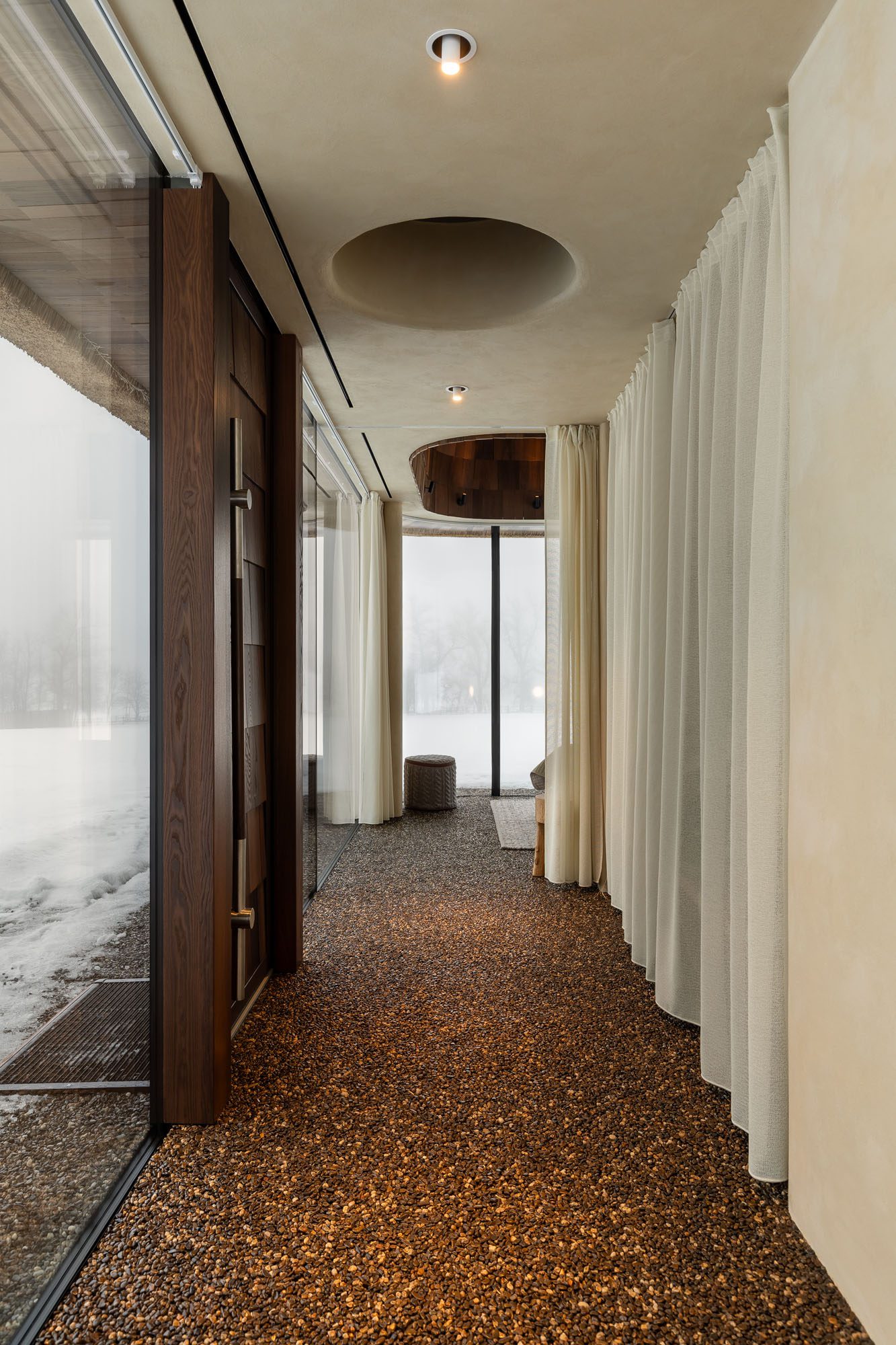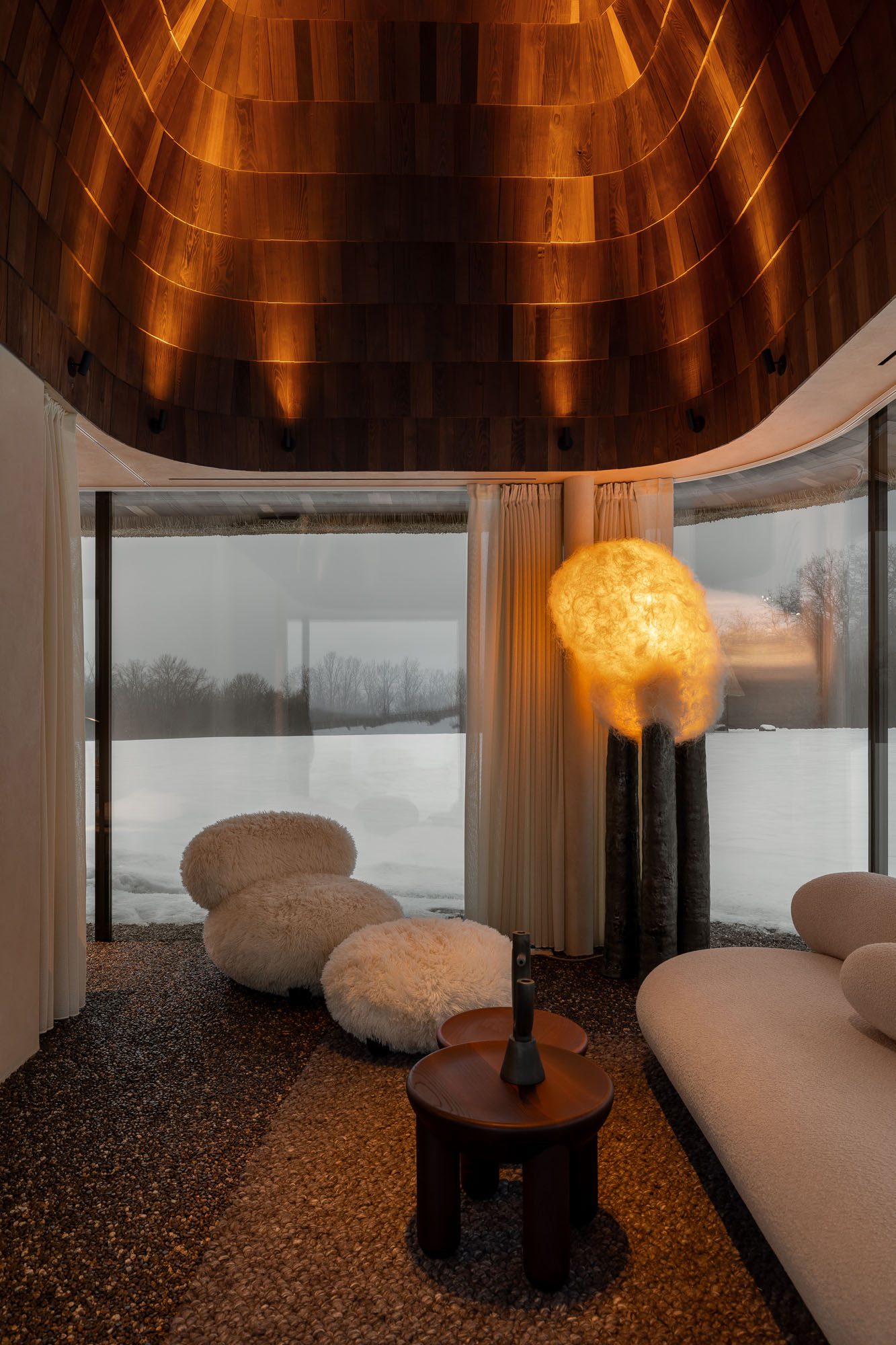Notably, there is no television. Instead, the circular opening of the fireplace frames the flicker of flame, encouraging guests to disconnect from screens and reconnect with the surrounding environment. Continuous glazing reinforces this immersion, while automated curtains can be drawn for privacy when needed.