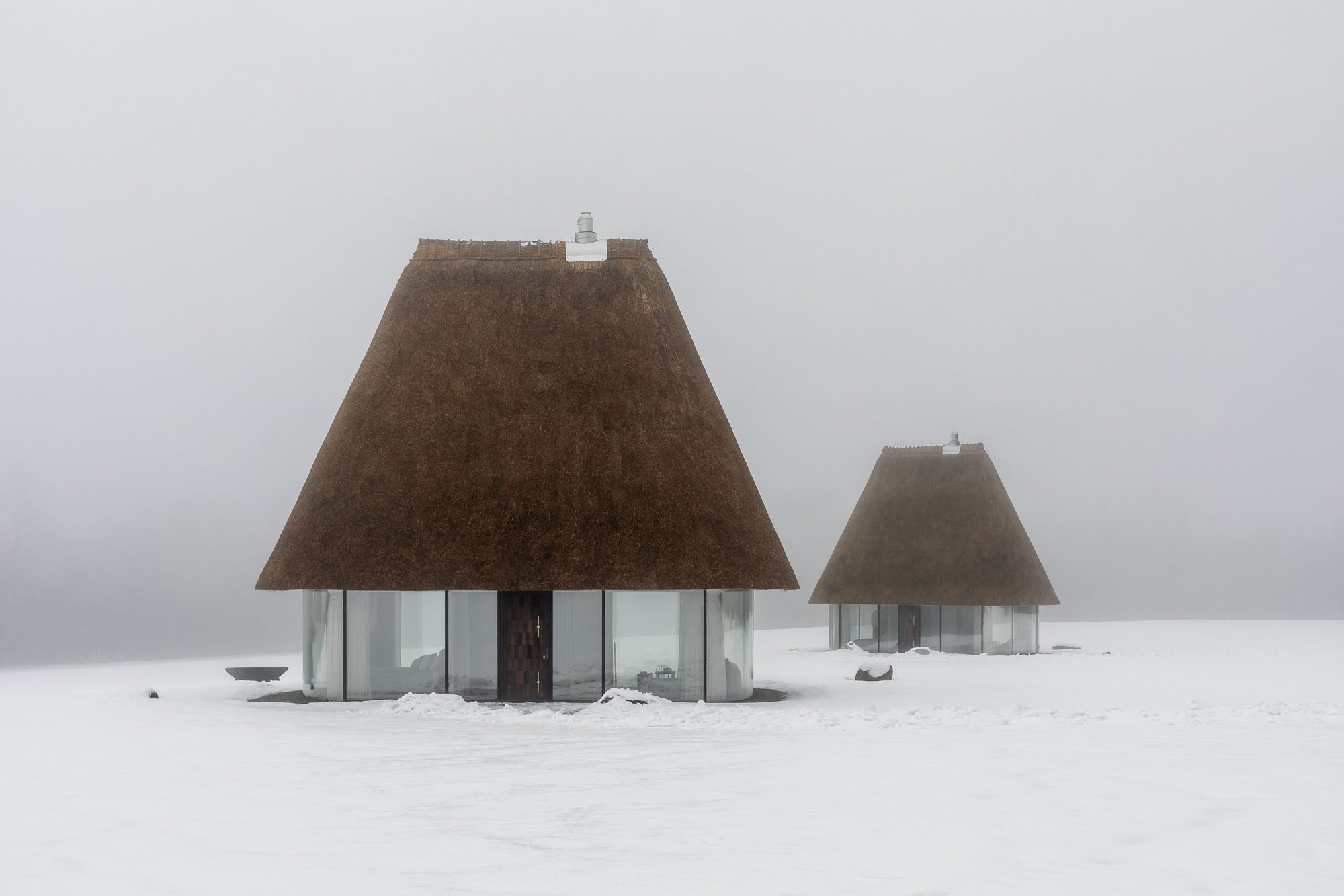 In this contemporary reading of the mazanka, the idea of lightness and clarity found in traditional whitewashed walls is translated into fully glazed façades. During the day, the transparent envelope dissolves into the surrounding landscape, making the substantial thatched roof appear to float above the ground.