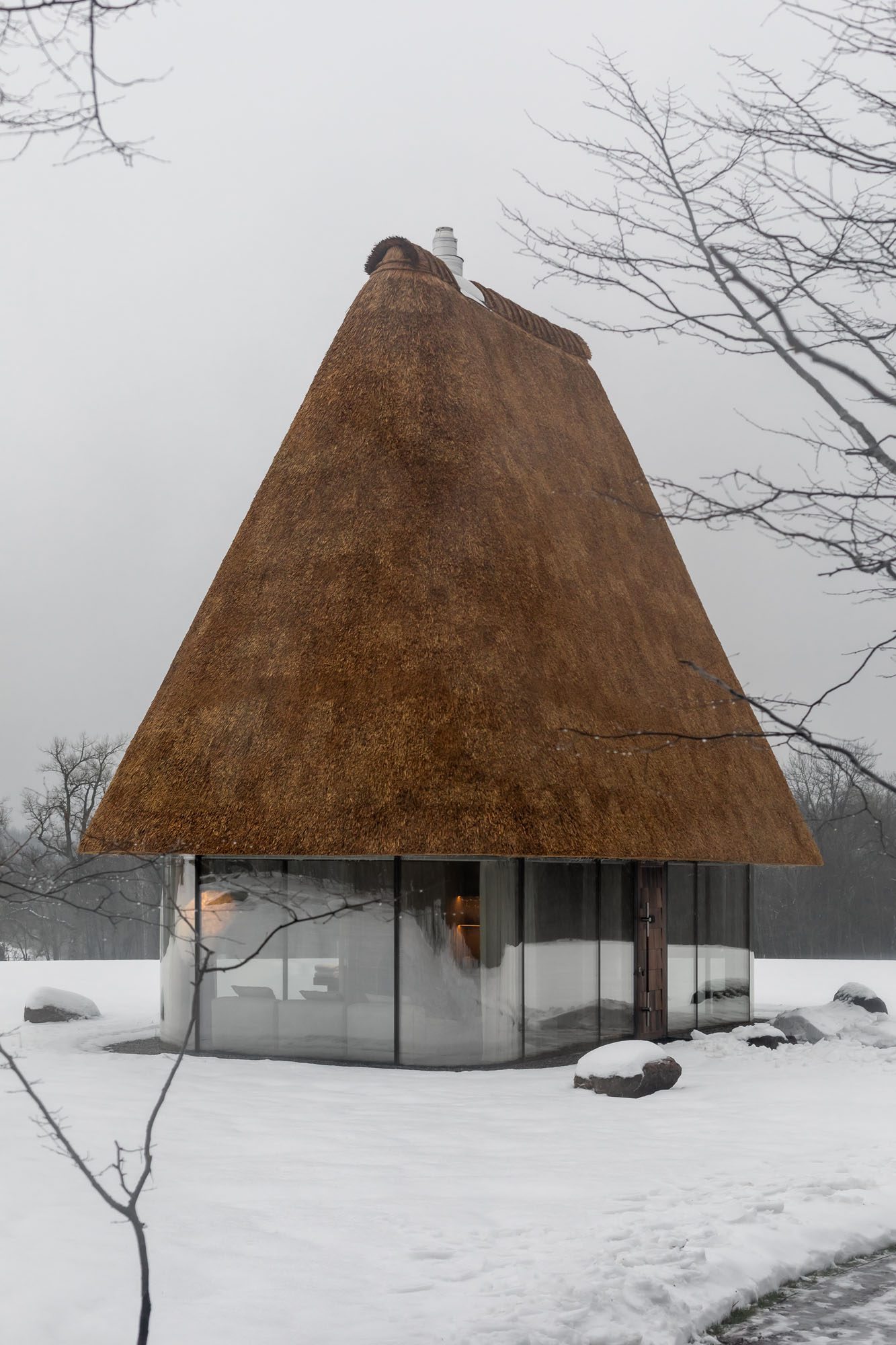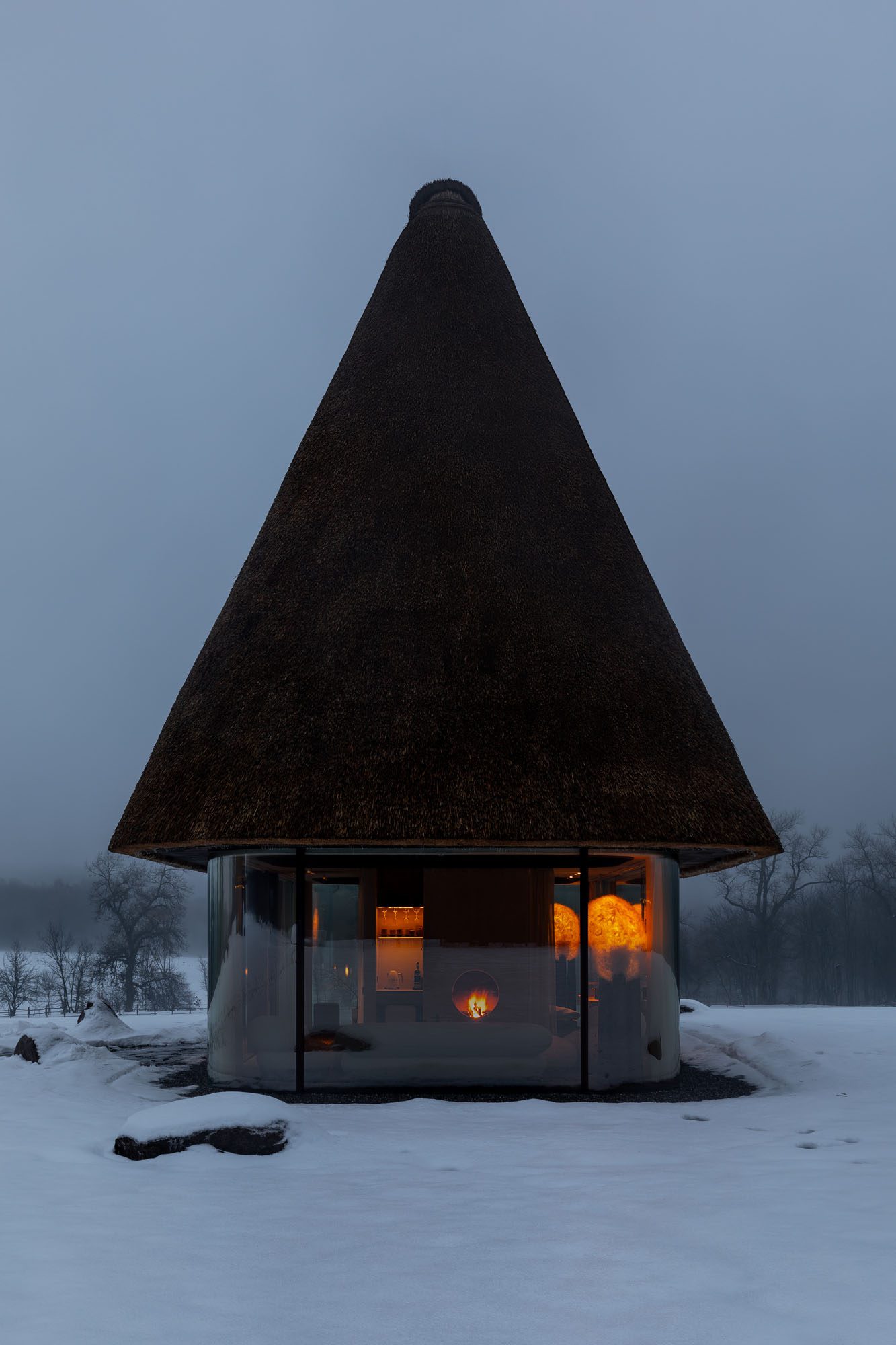 Rather than replicating tradition, the architects sought to reinterpret its essential qualities. The most striking gesture is the dramatically oversized thatched roof, which forms a sculptural dome above the small glass structure below. Its distinctive silhouette — somewhere between a traditional Ukrainian sheepskin hat and a mushroom rising from the landscape — creates an instantly recognisable architectural presence.