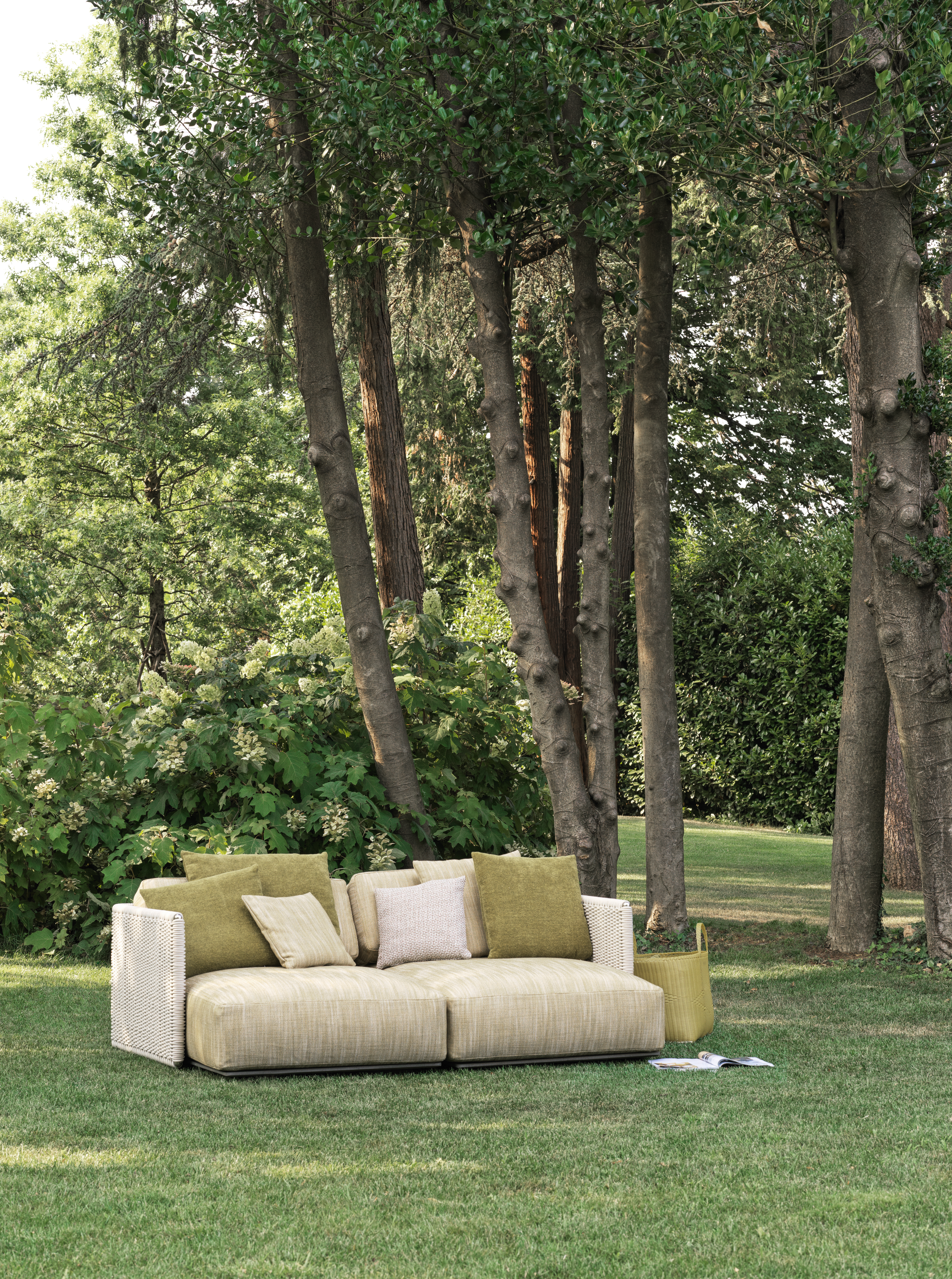 Eddy is a seating system by Flexform designed for decorating terraces, decks, porches, and patios with elegance. Composed of austenitic stainless steel and hand-woven fibres, it is available in a sophisticated colour palette ranging from earth tones to Bordeaux and olive green. The visual lightness of the woven structure contrasts delightfully with the generously padded seat and cushions.
