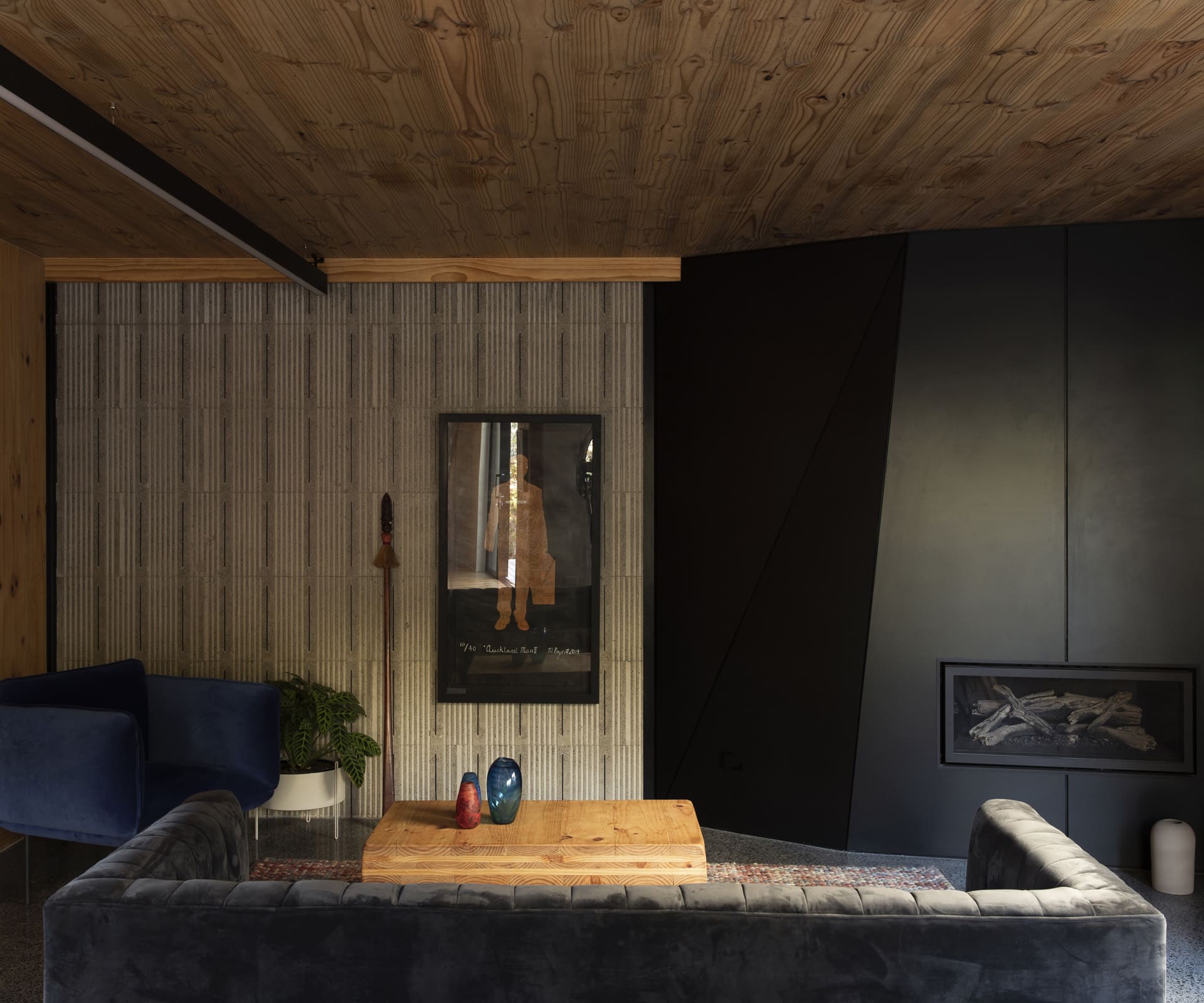 Inside, the honeycomb tones are a warming counterpoint to the strength of the steel. There are other elemental parts to the design, too. A concrete-block wall shows the bubbled patterning of its polystyrene formwork. Fractured forms on the hearth and island bench, bathrooms wrapped in dark stone tiles, and angular geometry to the ceilings are a subtle homage to the fire gods. In the main bedroom on the upper level, there are only two 90-degree angles to be found. Walls slope this way and that and the door to the en suite appears to be on a slant.