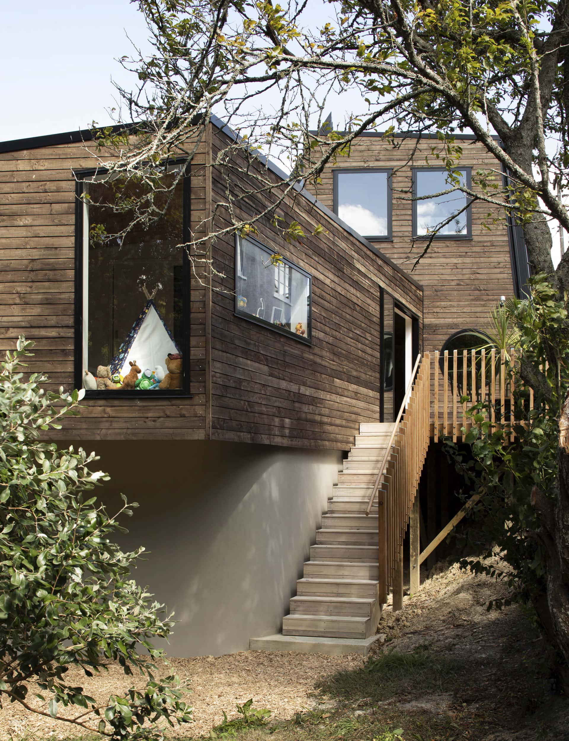 Something else that pushed the boundaries: the rough-sawn Douglas fir cladding with a coating of iron vitriol instead of stain. “The chemical reacts with tannins in the timber to create a protective layer. It has been used in Scandinavia for hundreds of years,” says Craig. A steel roof with a tray profile is a cost-effective feature that waterfalls down to clad parts of the home.
