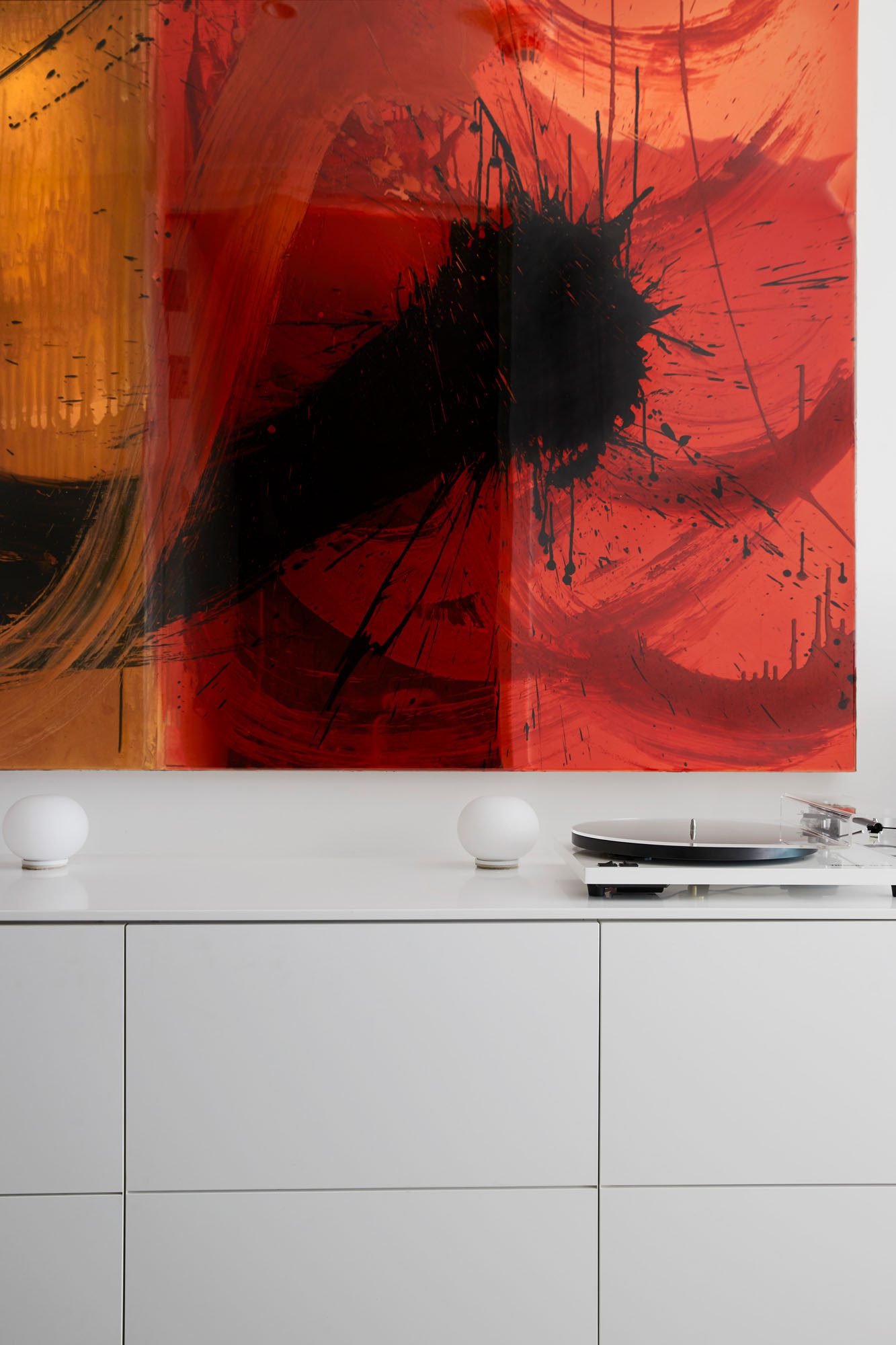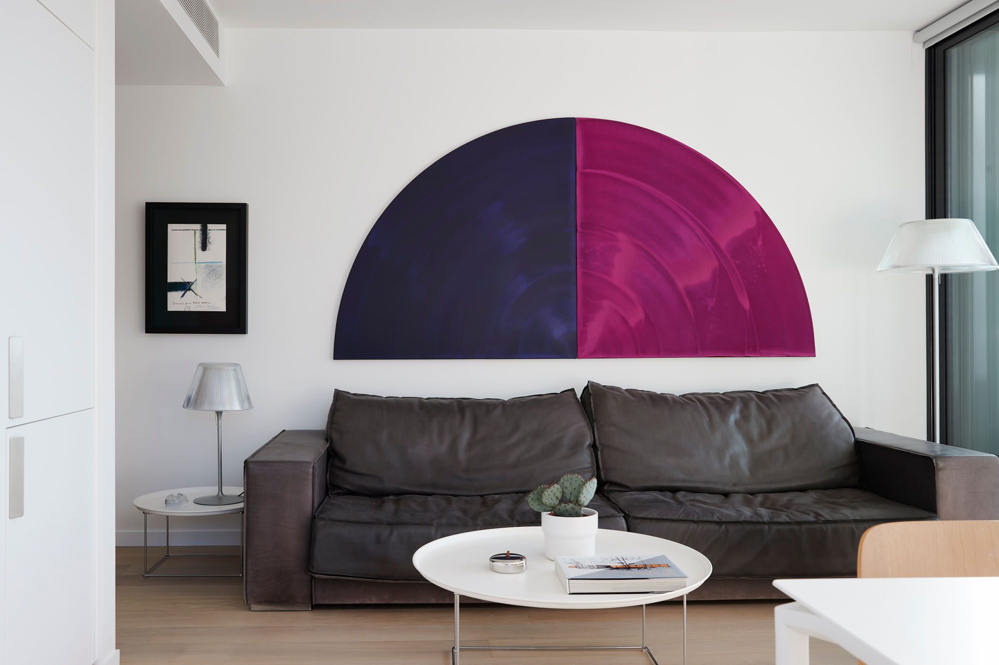 The apartment’s windows were left untouched, as they are part of the building’s permanent structure. The long wall from the front door to the glass sliders at the balcony was dedicated to the clients’ artwork.
