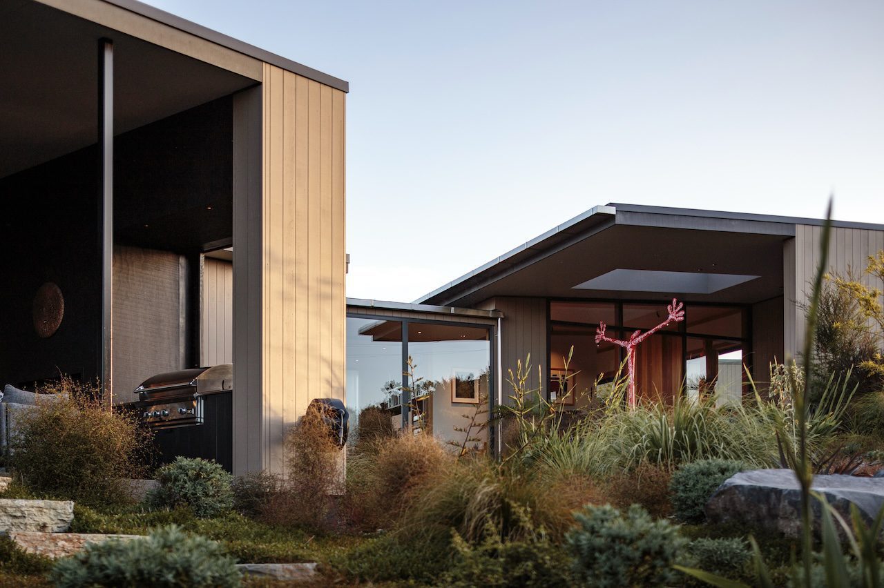 This house incorporates the primary bedroom suite at the centre of the house adjacent to the kitchen and living area, while three guest suites and a bunk-room are housed in a separate wing, allowing only parts of the house to be used when guests aren’t visiting.