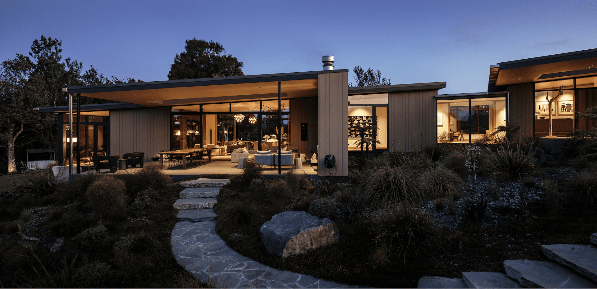 The native trees are uplit, extending the perimeter under the cover of darkness. Another glass roof draws light into the kitchen and dining area, which is separated from a sitting room by a double-sided internal wall housing a fire and bookshelves.