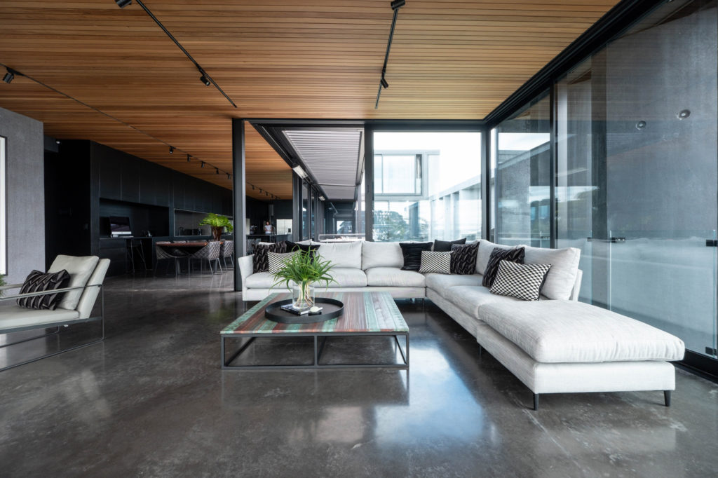 The main living and kitchen area is a moody, open plan space oriented to the view.