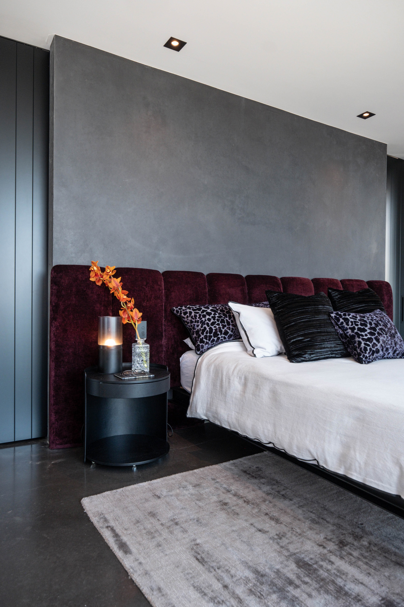 Velvet features in both the master bedroom and a second lounge, and deep tones are used throughout — the master bedroom, for example, features a custom-designed, wall-to-wall upholstered headboard in aubergine. In the main lounge, graphic prints were used to contrast with a palette of leather and steel, and in the bathrooms concrete-look tiles were sourced from Italy.
