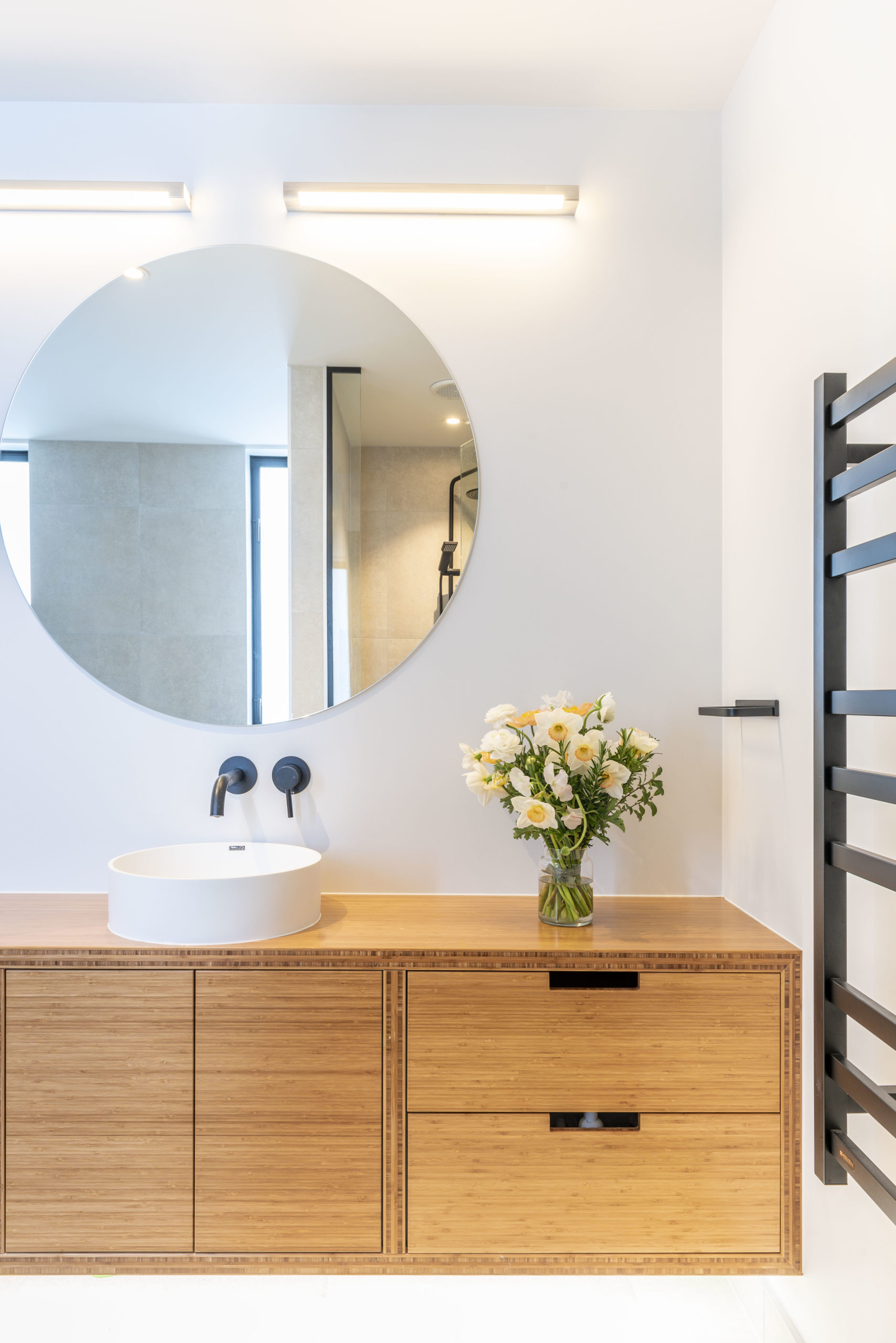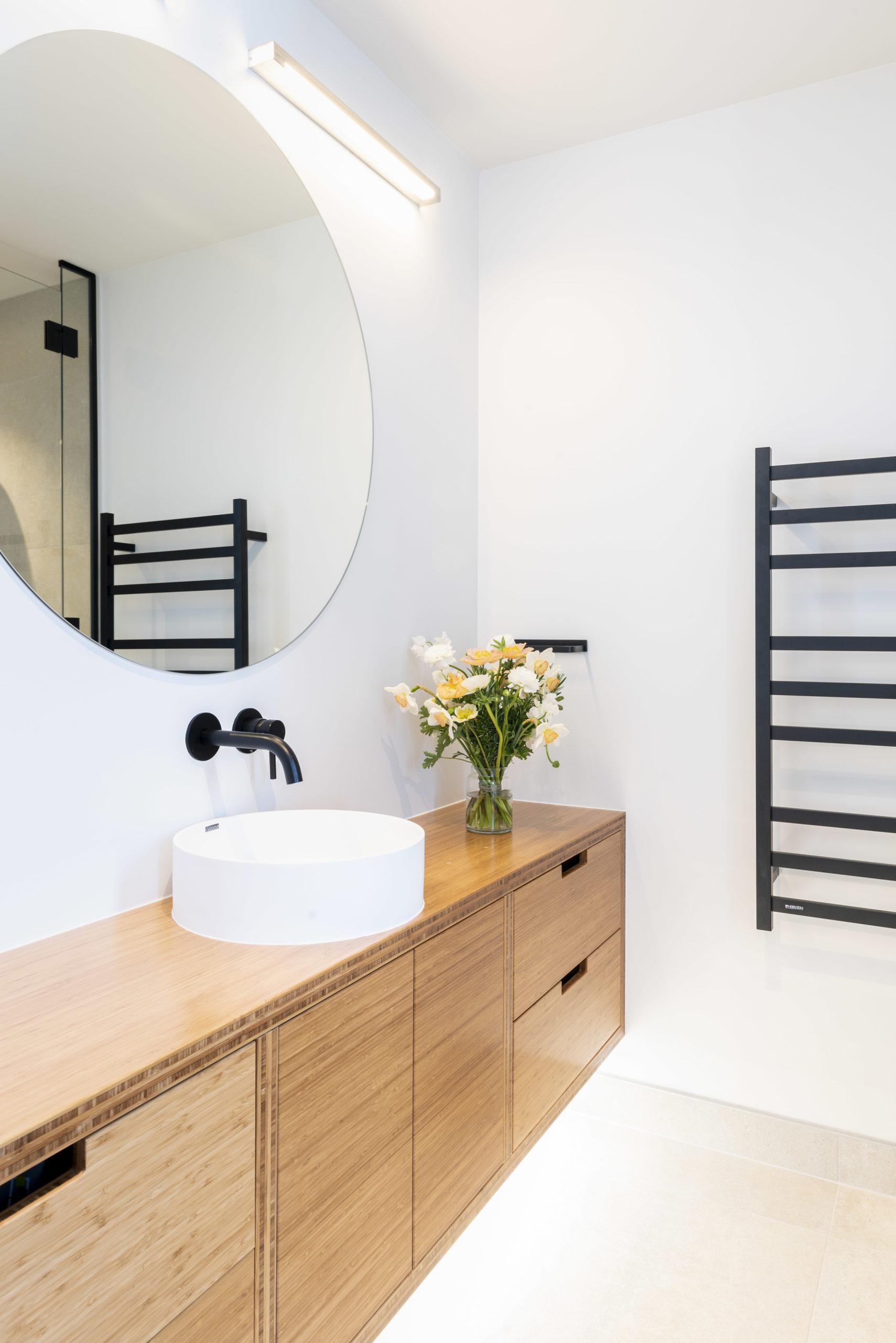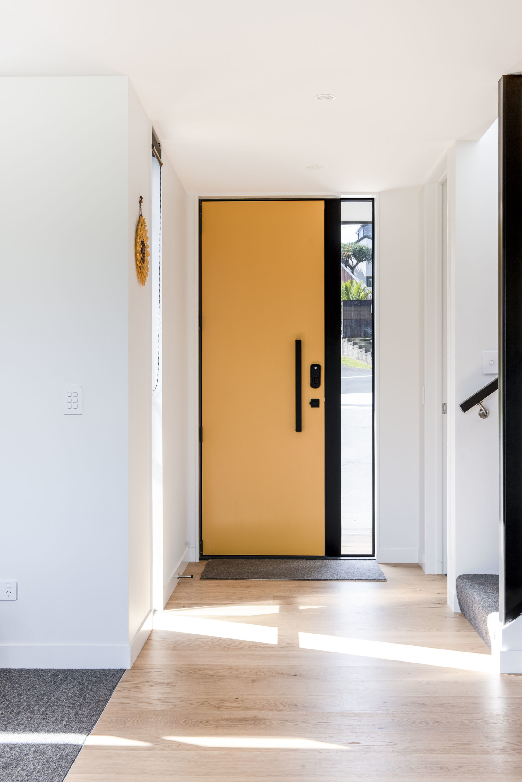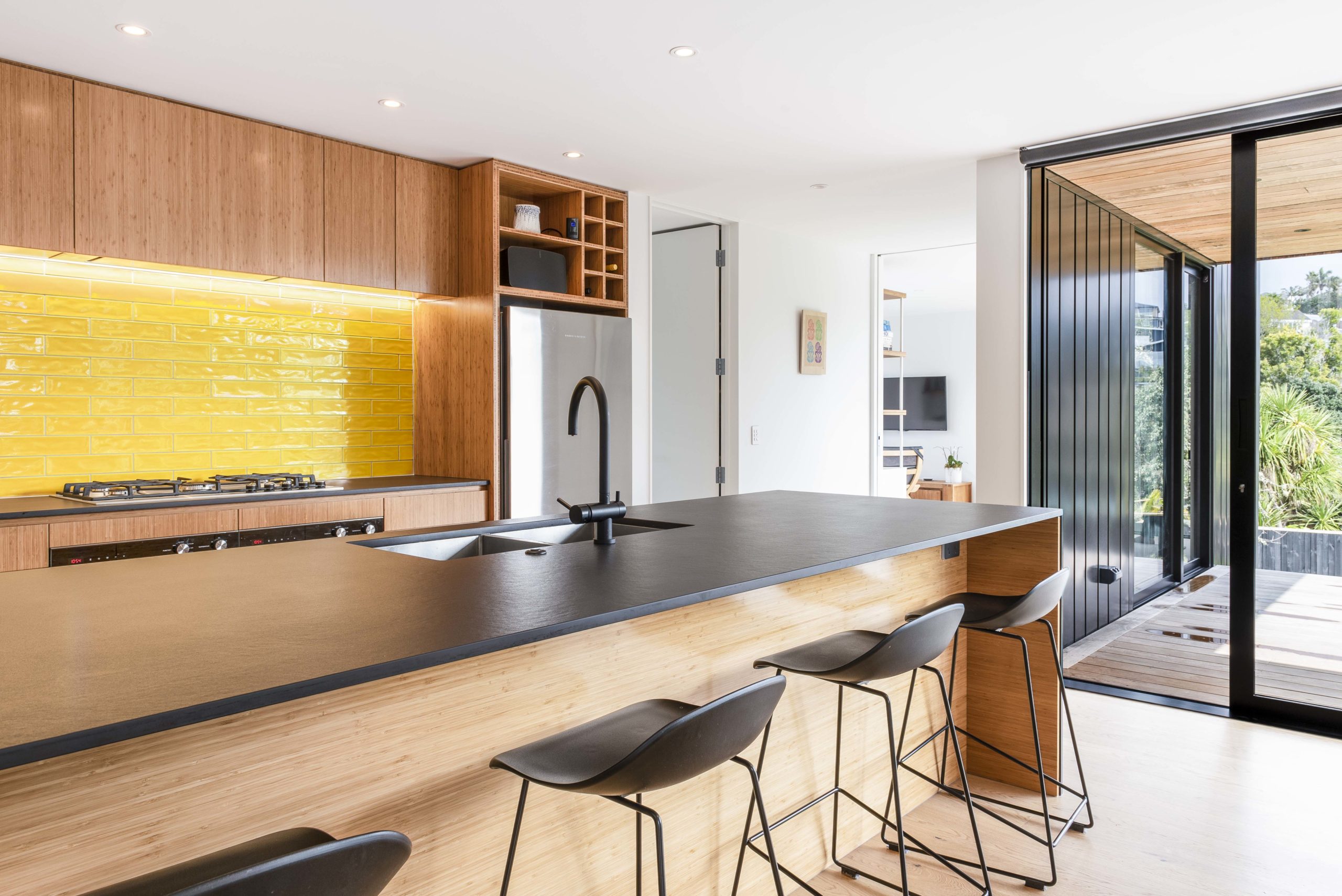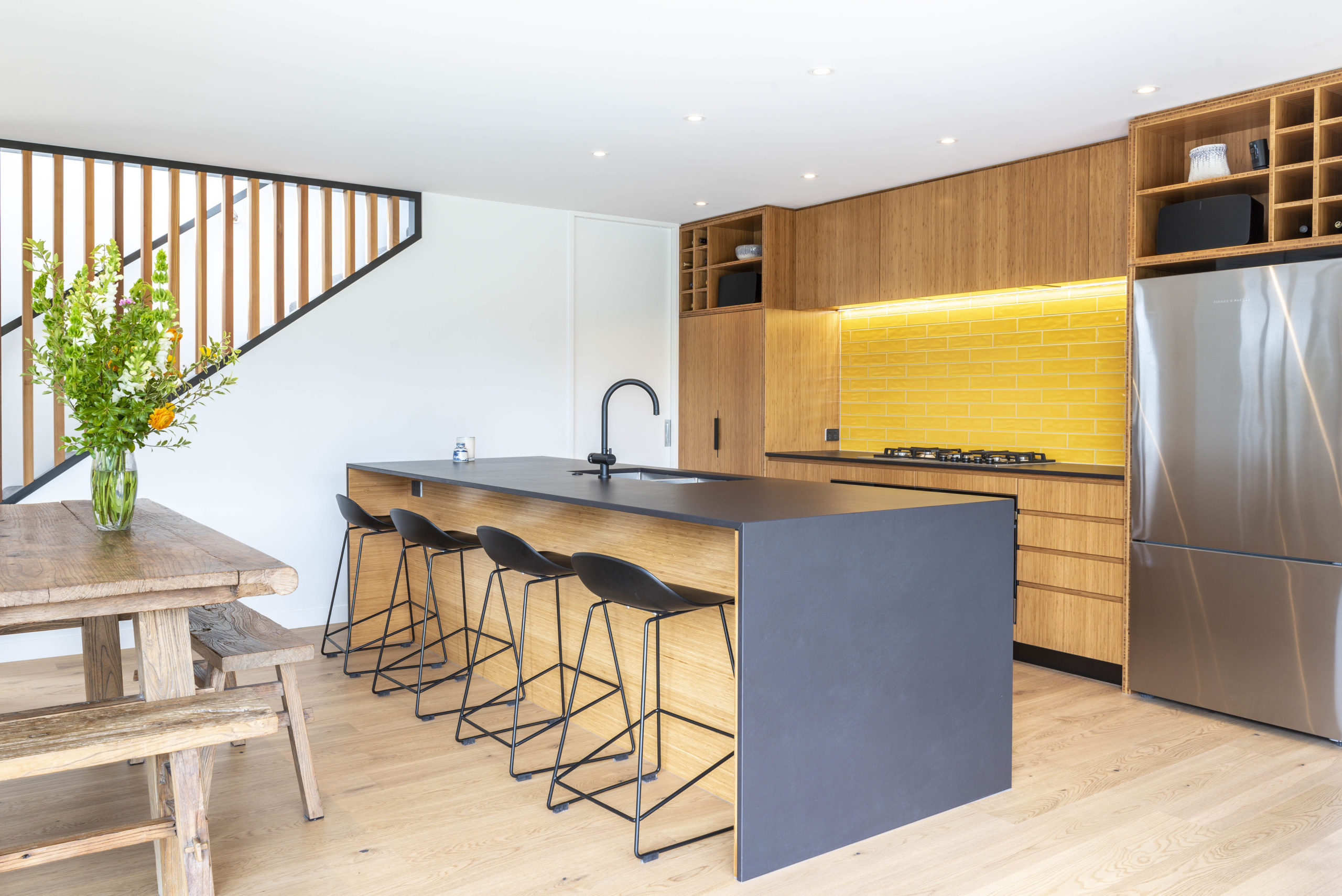 The bamboo plywood cabinetry material was a practical choice to the kitchen and bathrooms, as other materials could show up messy fingerprints. Warm yellow tiles to the kitchen splashback match the sunshine shade of the coloured front door. The coordinating yellow mailbox has become a talking point in the neighbourhood. “Everyone in our suburb identifies us as belonging to the house with the yellow door and mailbox,” says Luisa.