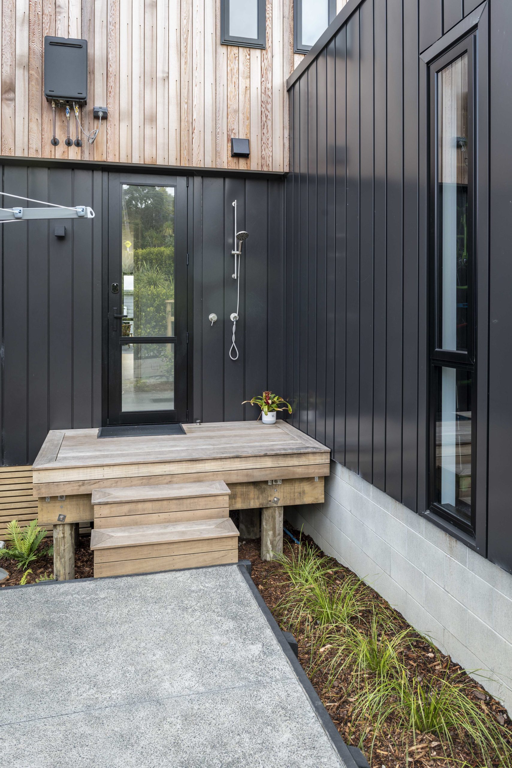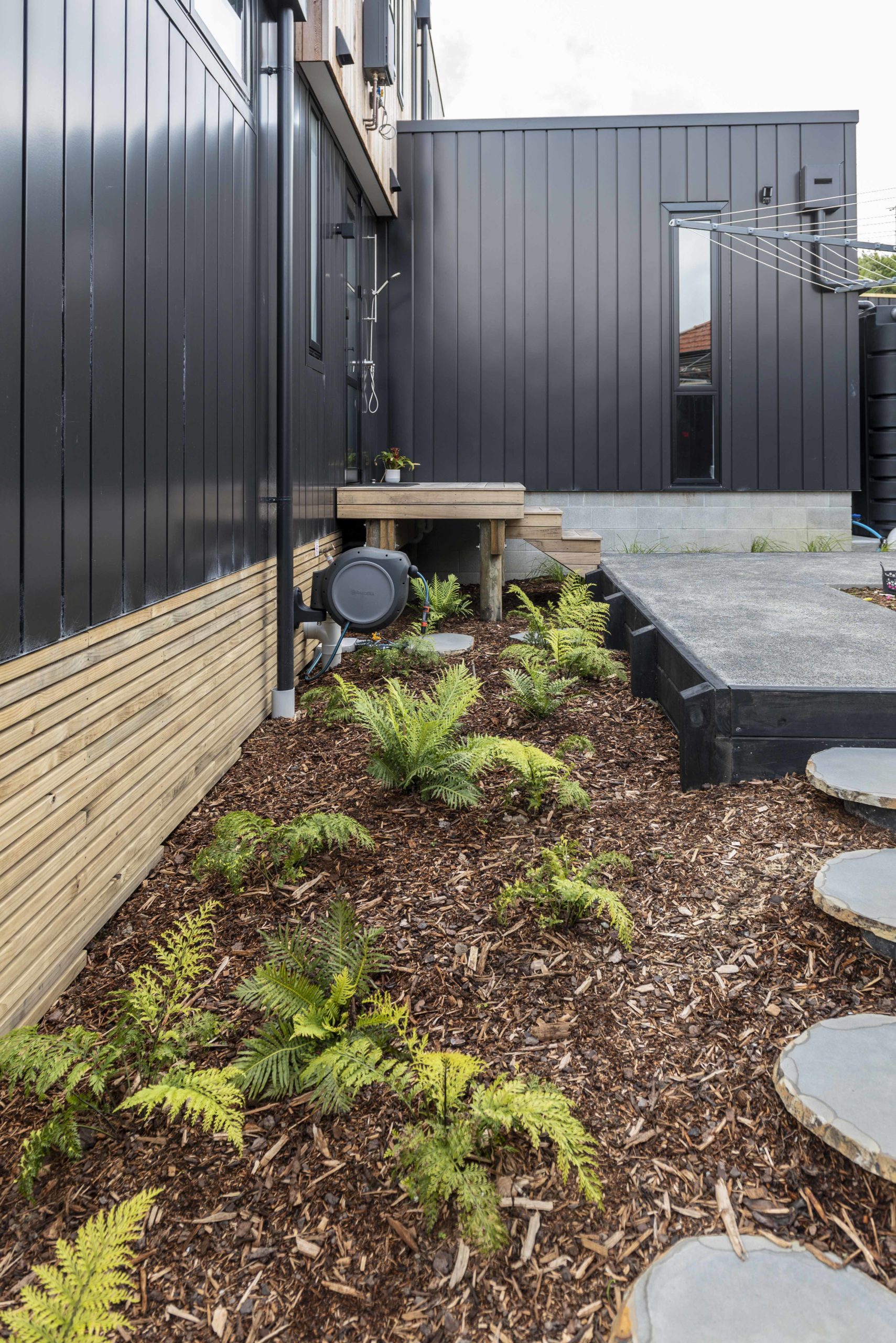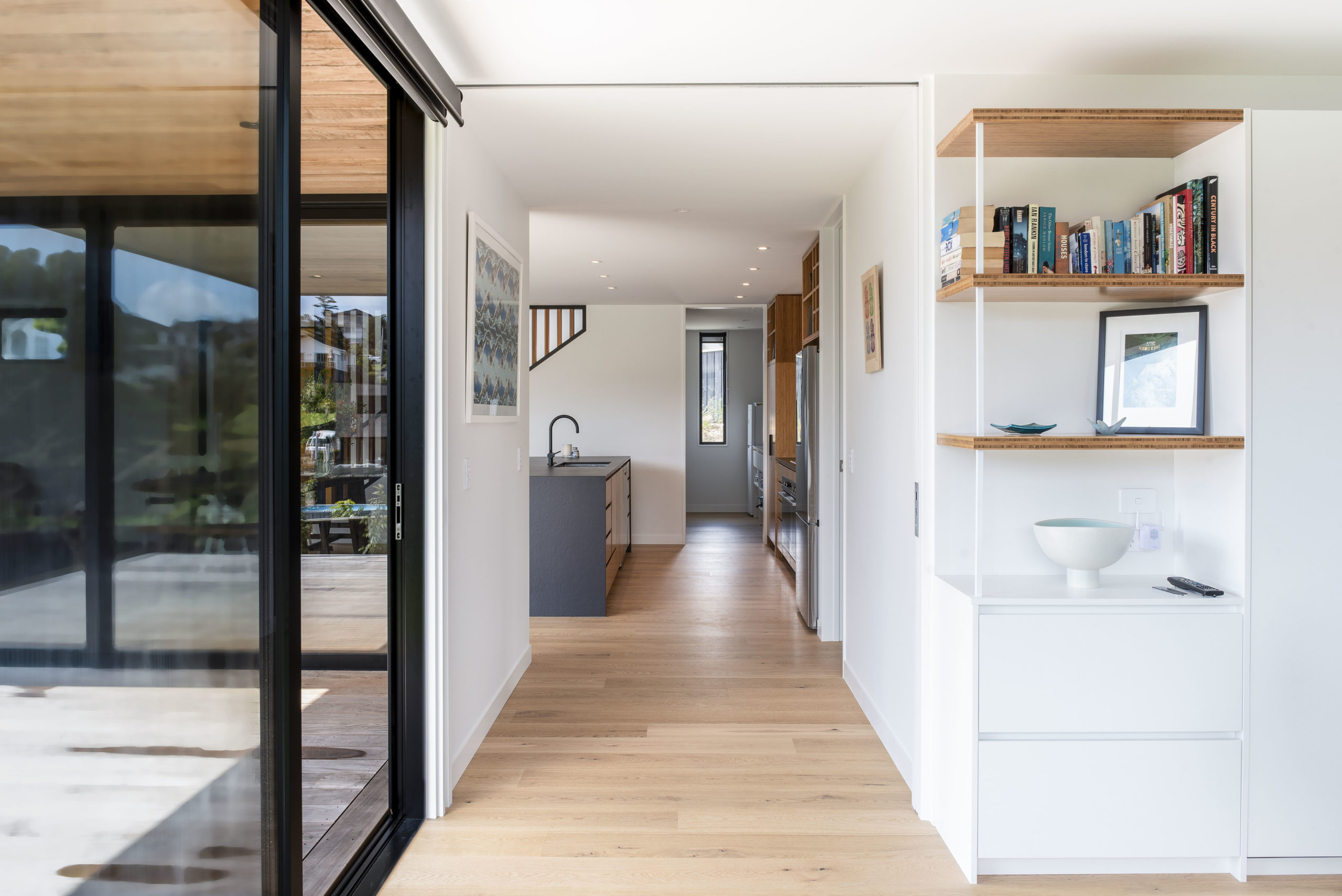 Box™ design manager Tony Borland-Lye and design lead Tim Hogarth set about crafting a home that was oriented for sun and fun on the gently sloping land. The only challenge was an overland flow path. “In a storm the collected rain flows across the site, so we had to maintain a minimum floor level above the natural ground. We also gently sloped the driveway to channel any water away from the house,” says Tim.