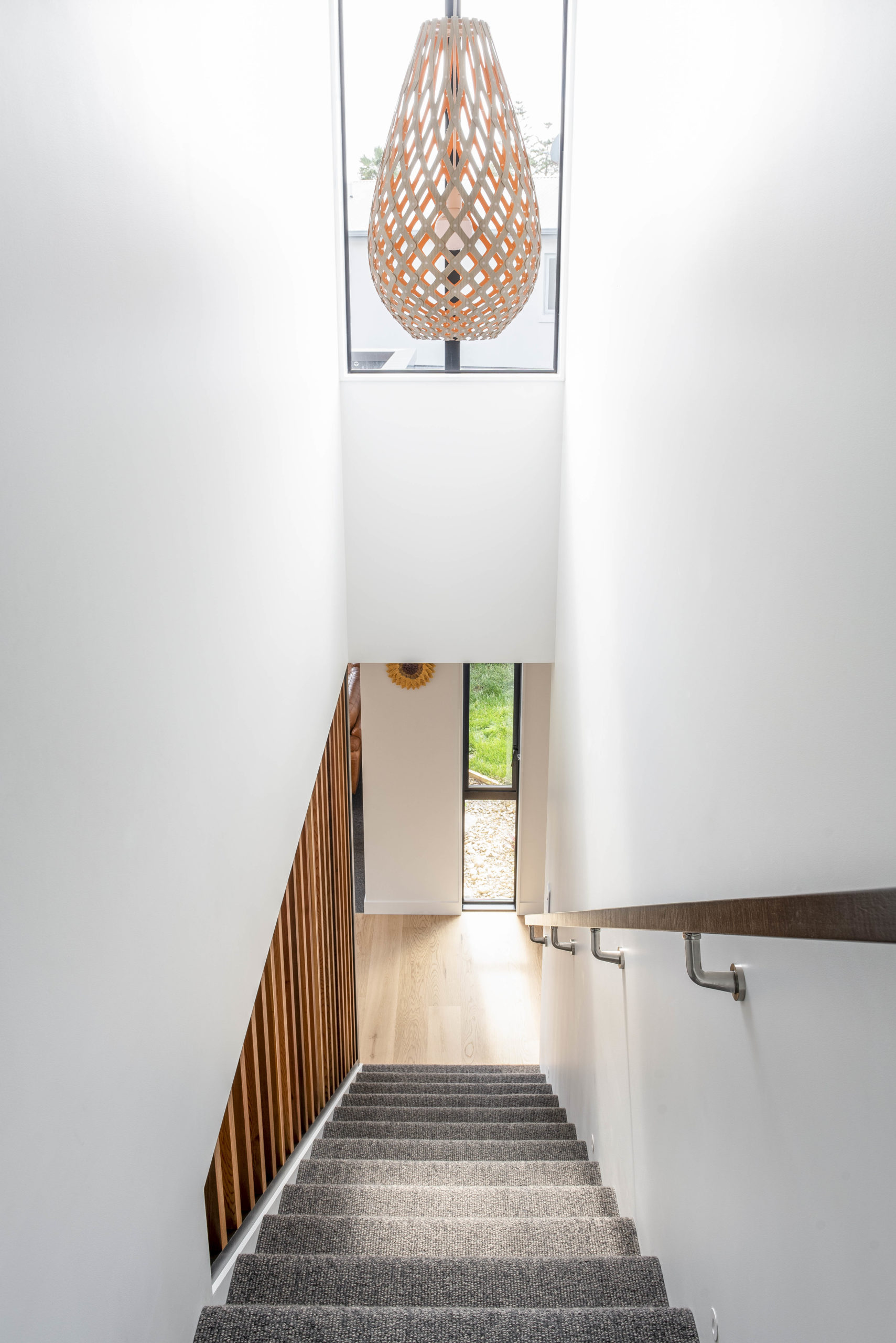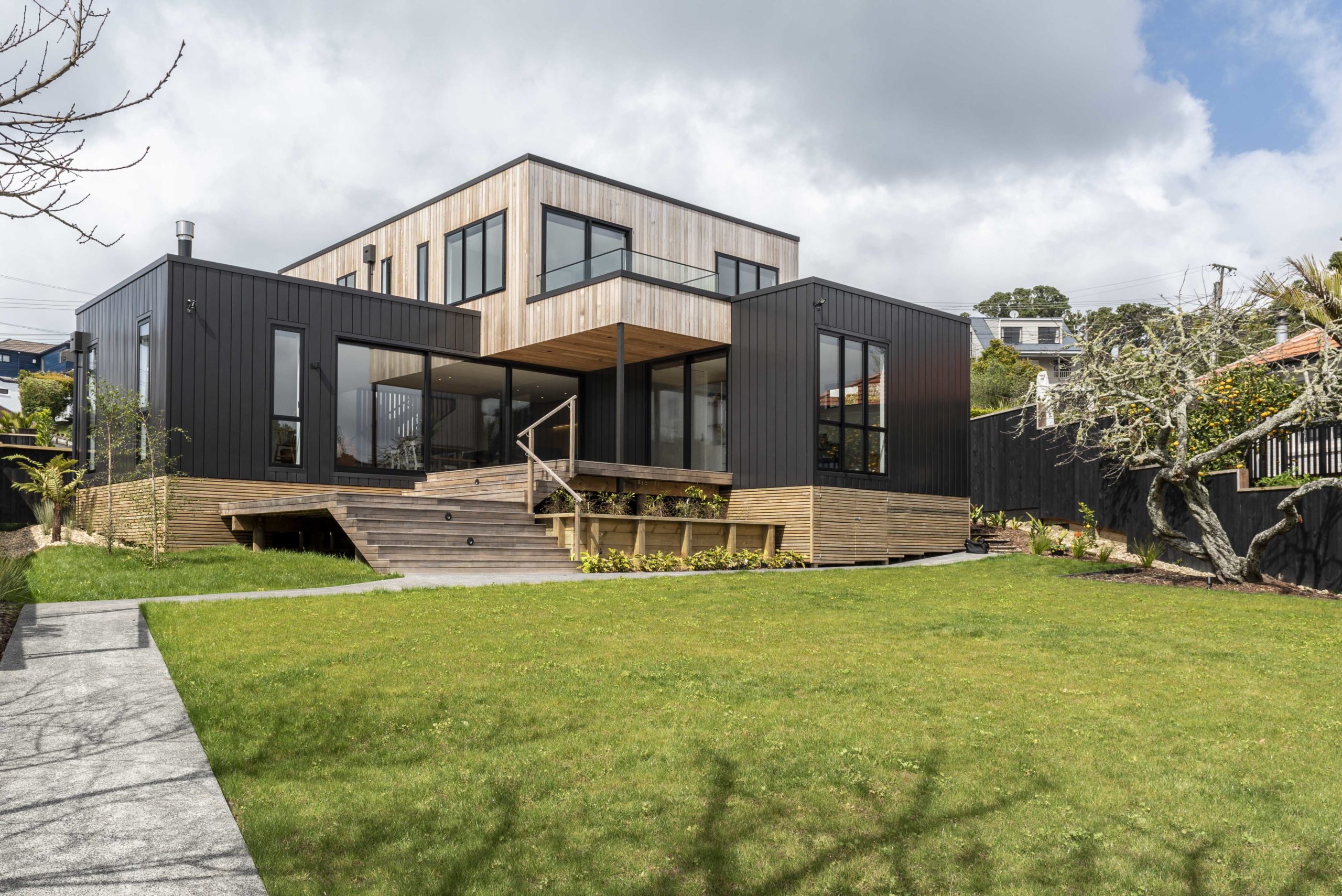 The ground floor, clad in interlocking zinc metal sheets, contains all the living zones. Upstairs the cedar box has three bedrooms and a master suite, with a balcony that overlooks a reserve path. A giant 6m-wide glass sliding door opens from the living/kitchen zone to a covered deck created by the floor above, with wide stairs lead down to a backyard where the grass is certainly greener.