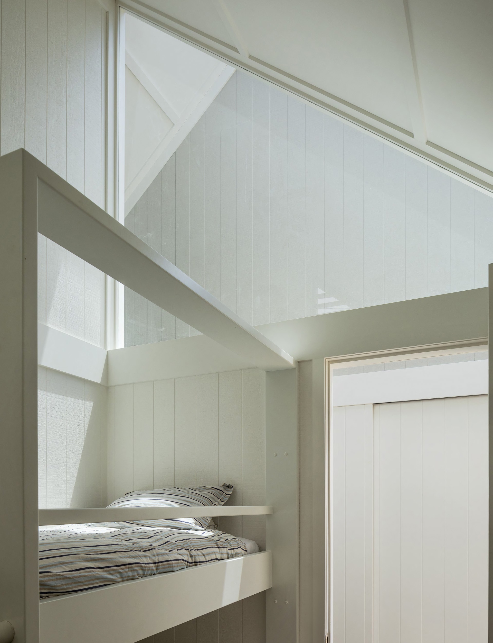 I am mildly obsessed with creating bunkrooms in beach houses; it’s the one room that’s hanging onto its Kiwi-bach roots. I really like the bunkroom at this place. It’s tucked away in a direction that doesn’t really get sun, but we’ve done a big skylight over the hallway access and a big window to the bunkroom. It’s flooded in light in a way that I really like. All beach houses must have a bunkroom.