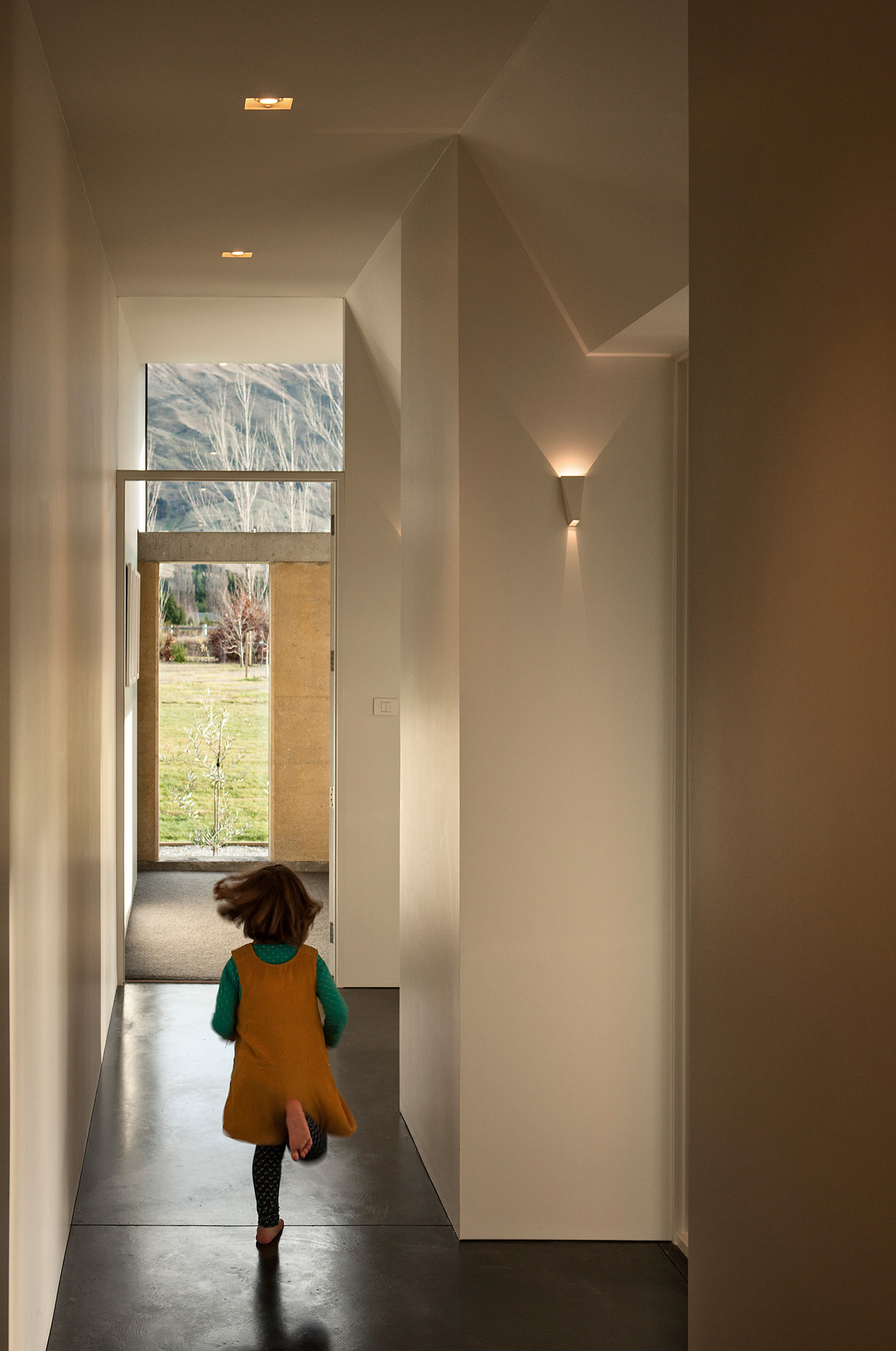 The pavilions are connected by a low-ceilinged entry and hallway that accentuates the drama of the loftier rooms beyond. “Circulation through a home is a pathway you’re walking constantly, so we made a conscious effort to have some tight, cave-like spaces and some high, lofty spaces,” Justin says. In the hallway of the sleeping pavilion, the walls neatly facet towards the doorways of the children’s bedrooms. “Little circulation areas like that are often neglected,” Justin says, “but they’re often more important spaces than the bedrooms themselves.”