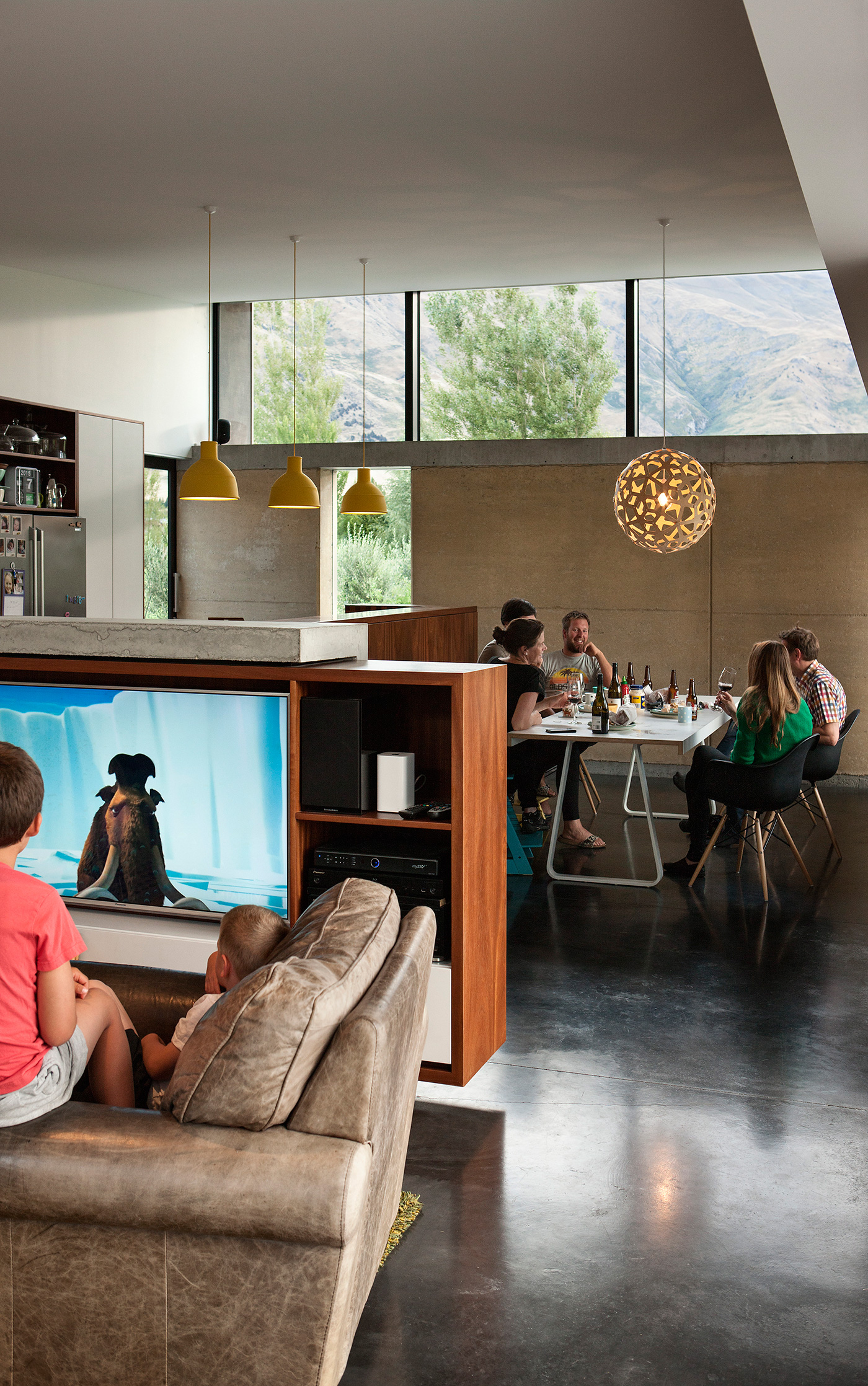 Stuart and Melanie wanted to keep the living pavilion open-plan – it makes it easier to keep an eye on their kids that way – but were also mindful of the need conceal any mess and gently separate various functions. A high back on the kitchen island shields the kitchen bench from view, making dishes and food preparation invisible from the dining table. In the dining area, a deep, north-facing window seat provides a gorgeous mountain outlook and also contains big drawers in which kids’ toys can be easily stashed at the end of the day.