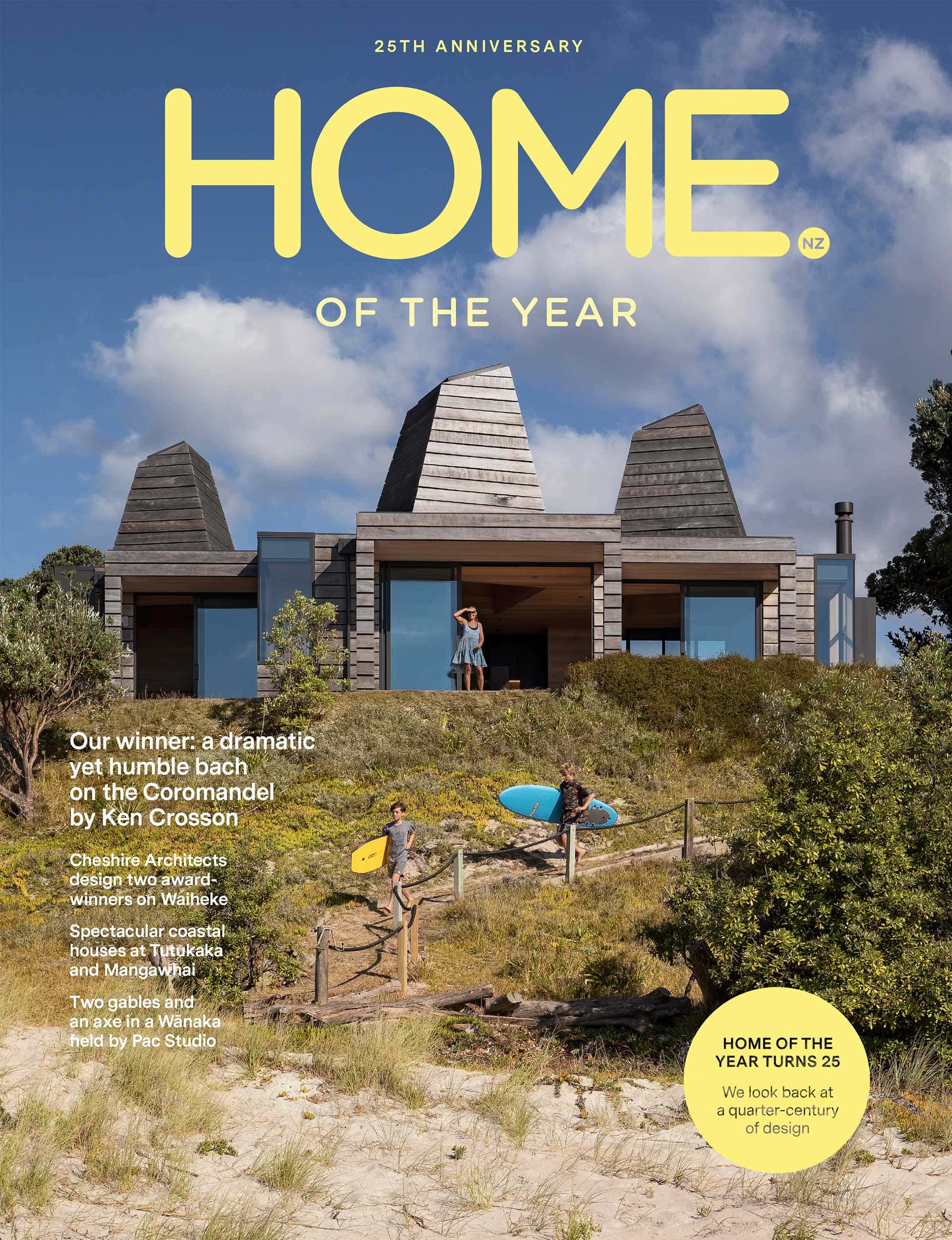 “It’s a masterclass in detail and colour,” says HOME editor Simon Farrell-Green. The design has an intriguing, late-modernist feel with graduated weatherboards reaching up to a razor-thin roof edge, with accents of mustard and green against timber.