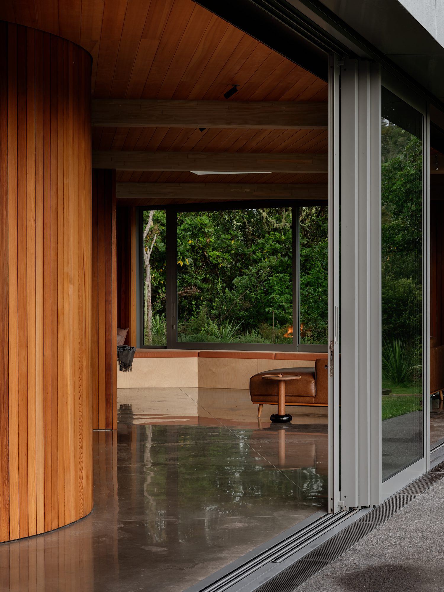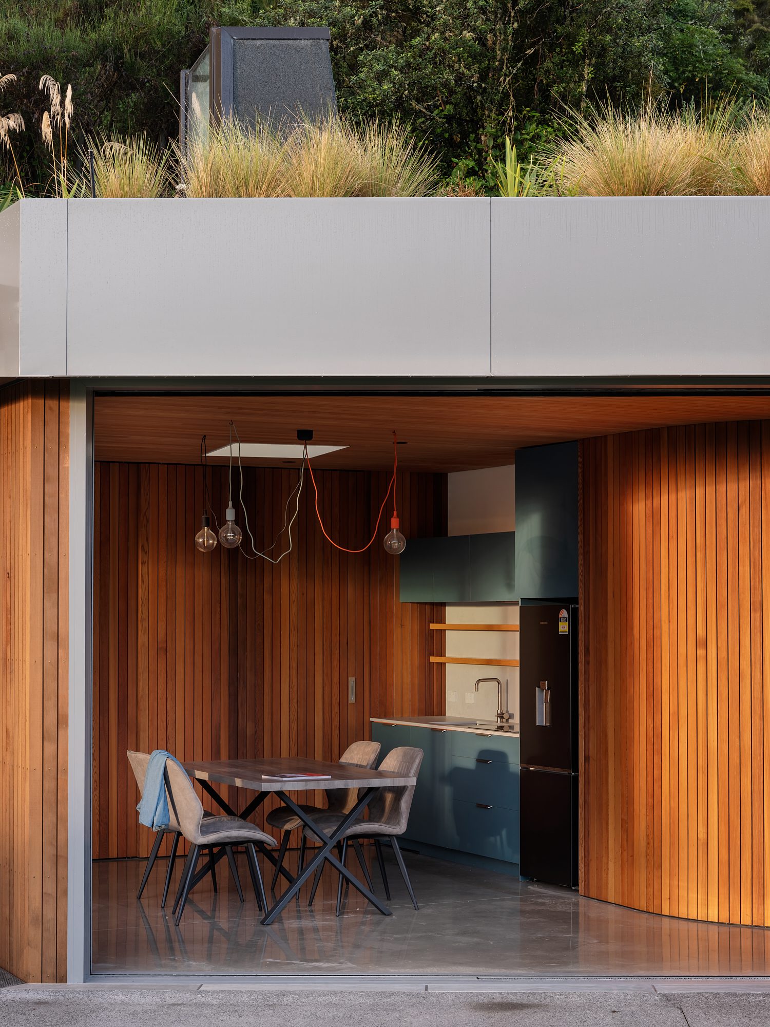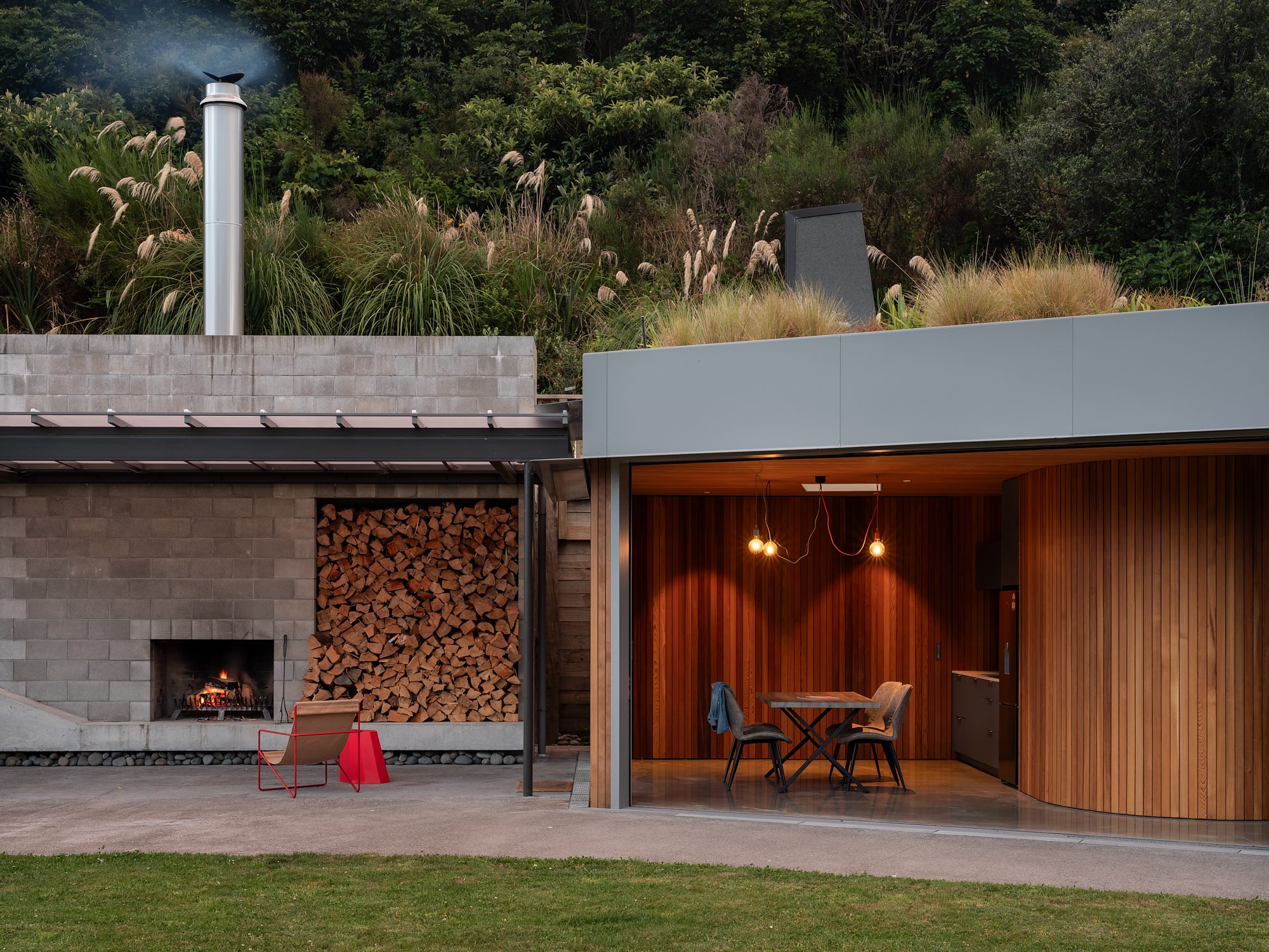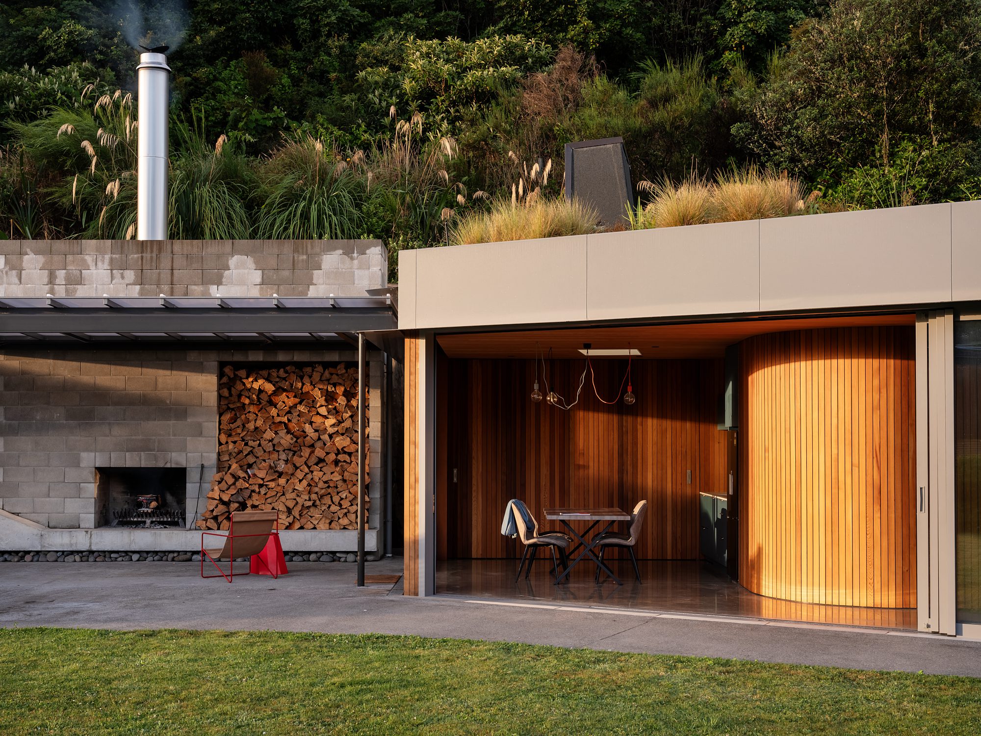 Originally designed as a sleepout — a first move towards a larger build — the project quietly became the main event. “As it progressed, they realised this was enough.” A trio of curved, timber-lined walls and a concrete fireplace at the eastern edge bring softness and solidity in equal measure, while a light-grey aluminium eyebrow shades the front: a subtle architectural lift.