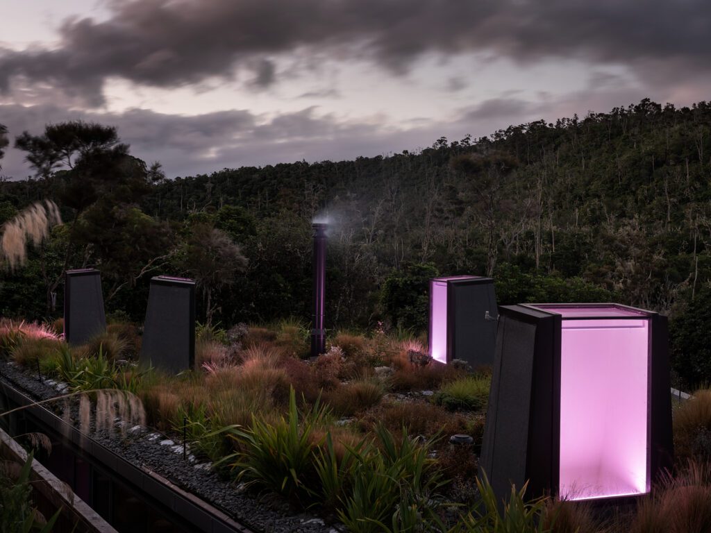 From above, these light stalks are surreal, sculptural and strangely beautiful. It’s a kind of architectural bioluminescence — and a concept Bossley Architects has investigated for some years across various projects, perhaps the most joyful of which is Arruba Bach (2014) at Orua Bay on the Manukau Harbour, where green stalks rise into the trees from a floating pōhutukawa-red form.