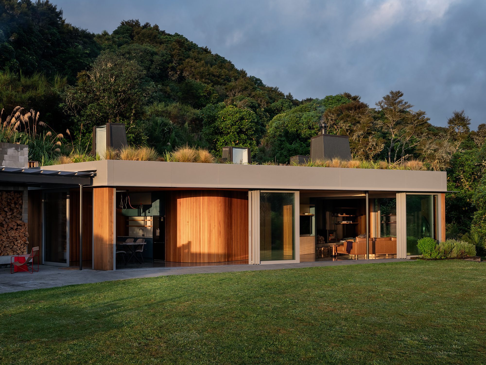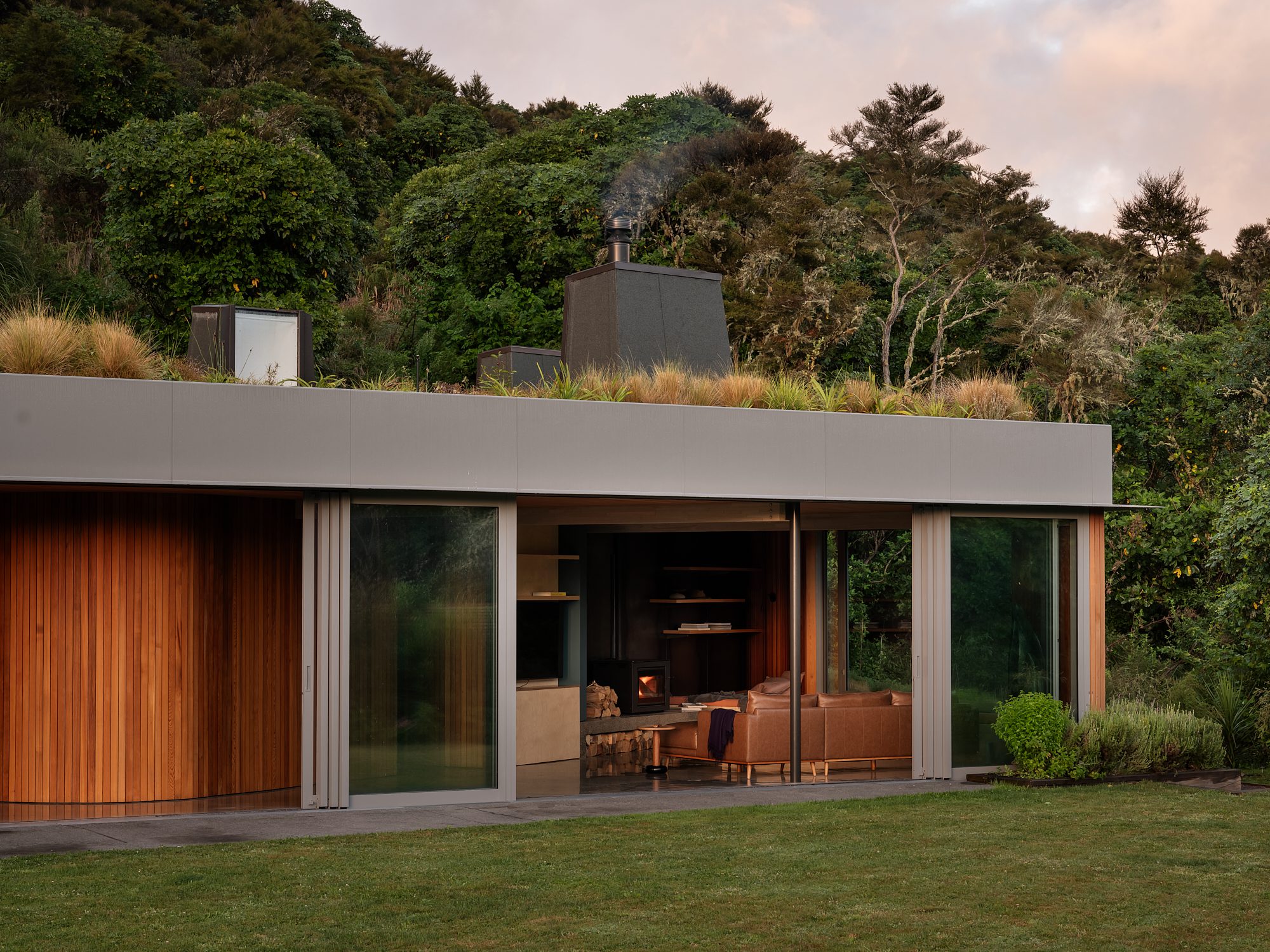 A triangular form bedded into the hillside. A place to enjoy a slower pace of life. A warm home; a living roof, soft timbers, light stalks. An inconspicuous little triumph for long summer days and intimate wintry get-togethers nestled into the head of a native bush-clad valley.