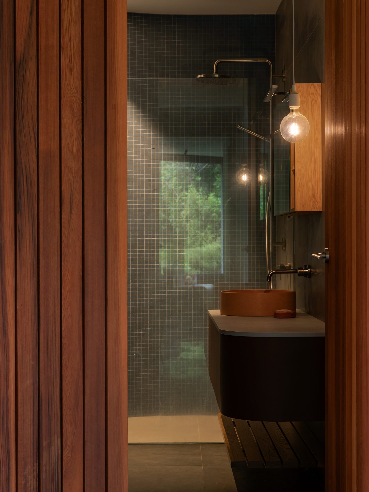 Though playful in nature, they’re highly functional; at Whareroa, scooping light deep into the building’s core by day — without adding too much solar gain. “They’re skylights that reach upwards, adding intrigue to the roof — the fifth elevation,” architect Finn Scott explains. At night, their function reverses to gently illuminate the rooftop planting, glowing quietly above the bush like fireflies caught mid-flight. Playful and purposeful — they provide a duality that defines much of the home’s charm.