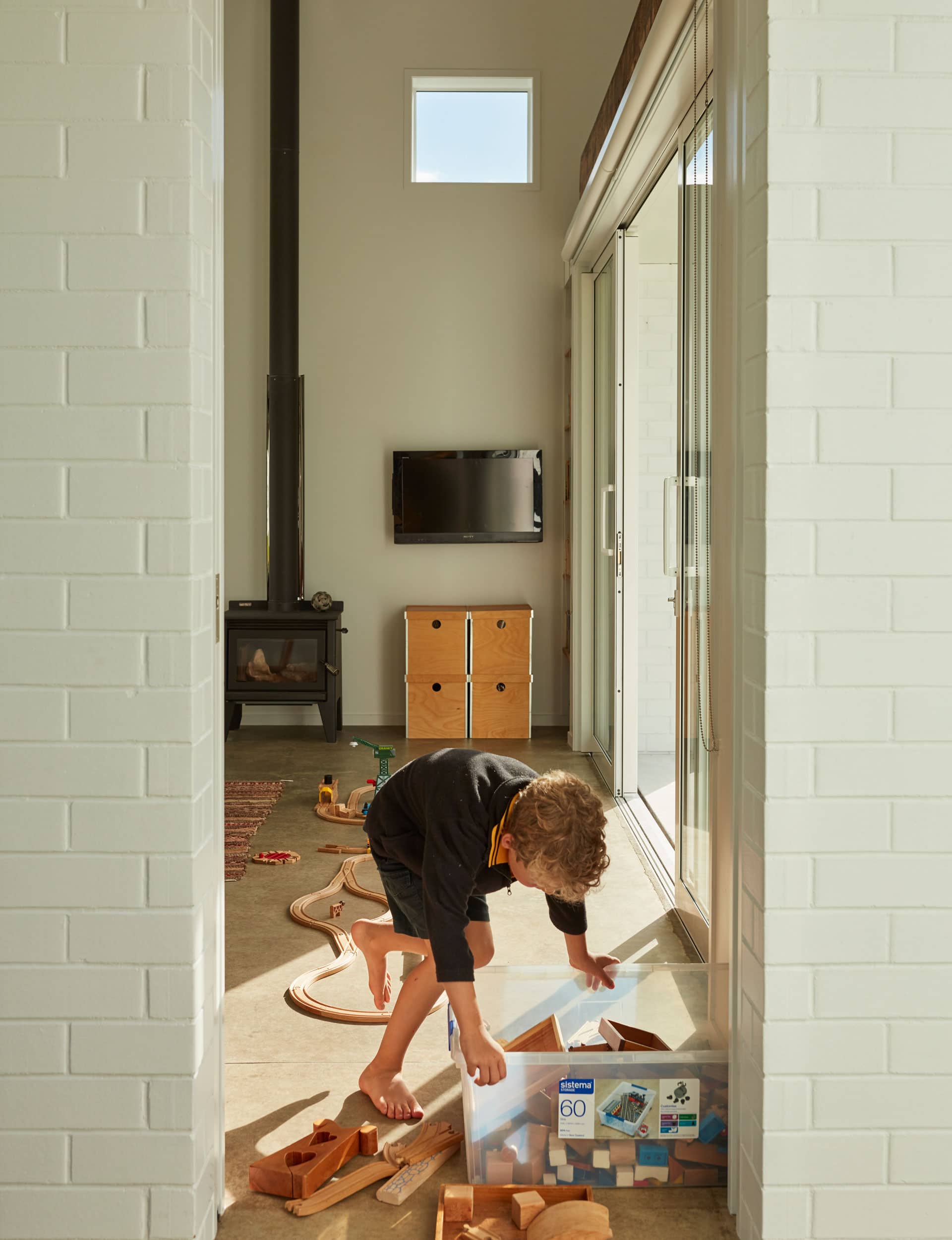 The house is simple – built from brick and white-painted plasterboard and ply, with floated and oiled concrete floors – yet artful. It’s long and thin, never more than 4.2m wide, and strung out in a line. The Hide-Baynes had a specific set of priorities around space: they wanted a separate living room with a fireplace, and a kitchen-dining space. They wanted their bedroom close to their young son Jack’s room, and they wanted a separate bedroom and studio space with its own bathroom for visitors – Hide-Bayne’s mother visits from Britain for up to six weeks at a time, and Bayne has older children from a previous relationship.