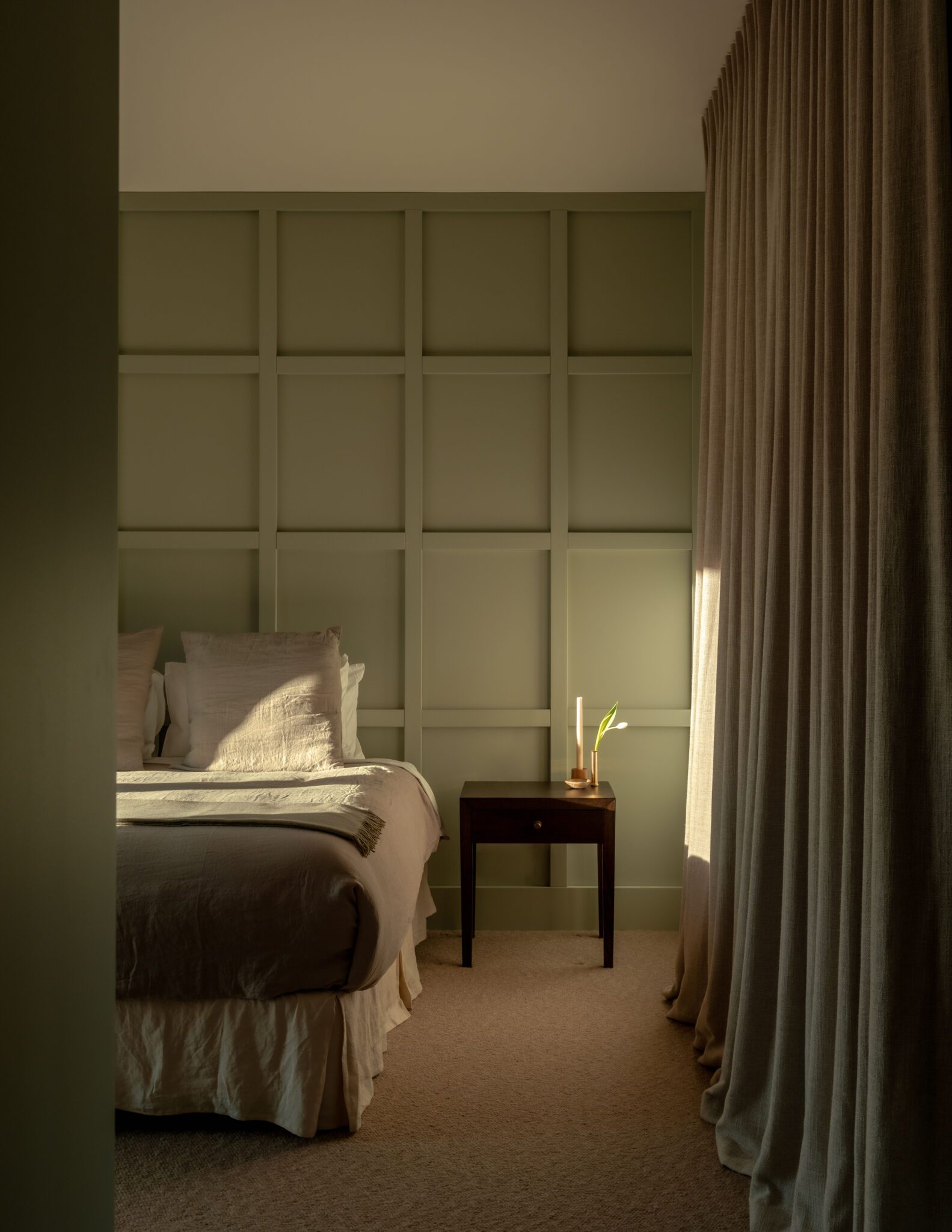 Bedrooms echo the natural tones, with headboard feature walls painted in a restful green, enveloping the essence of the site, while the ensuites incorporate the same granite as the kitchen.