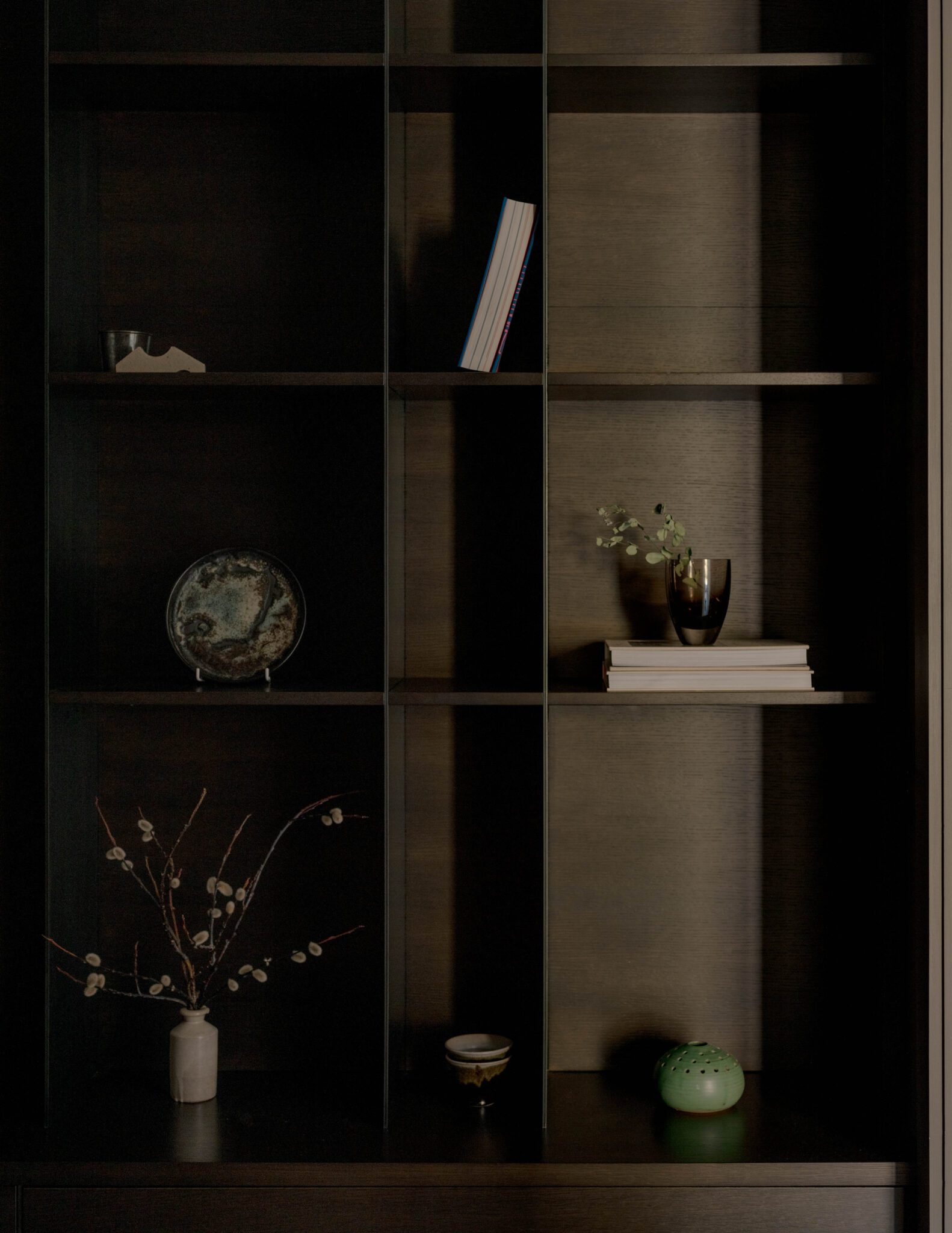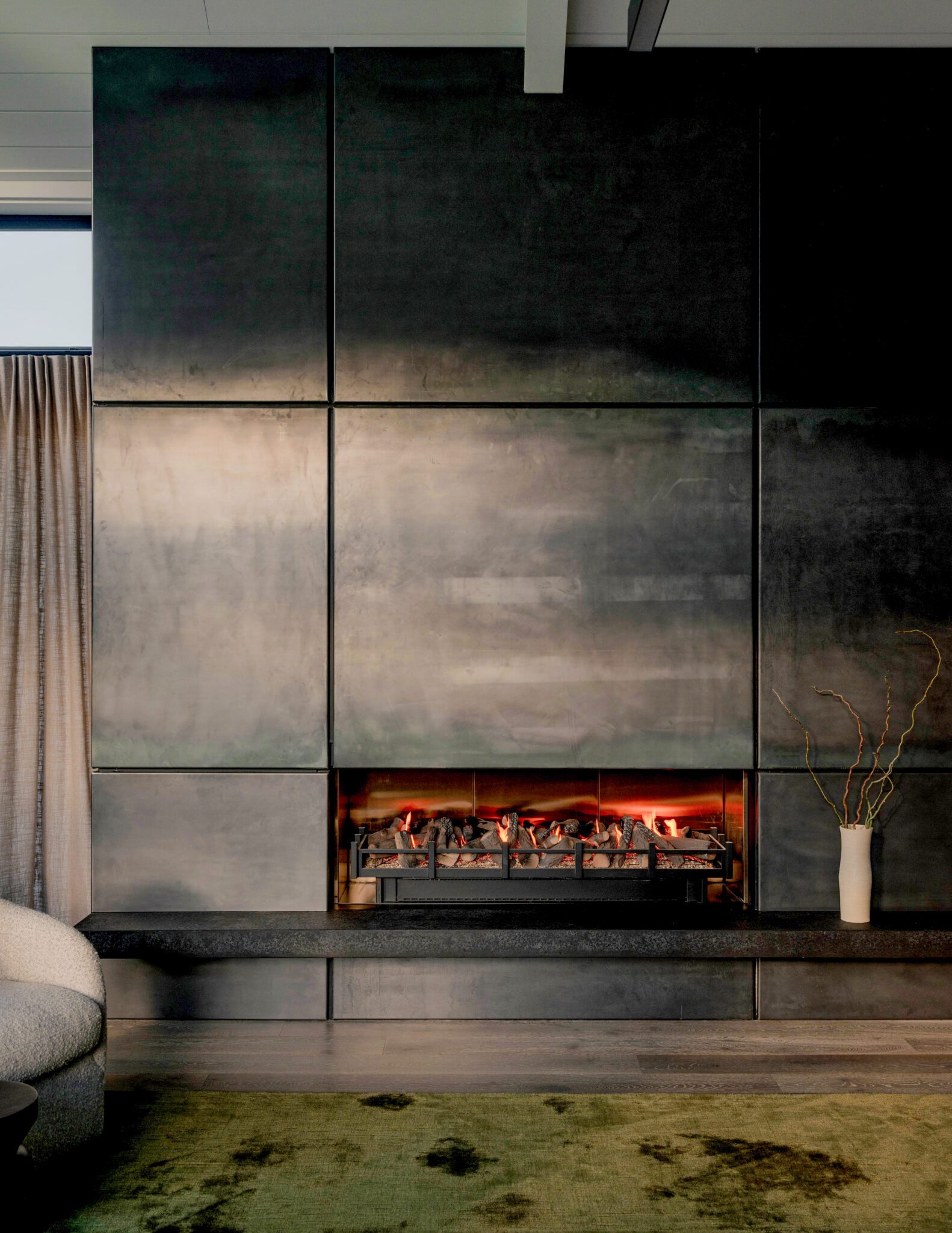 Elsewhere, the materiality continues; hot rolled steel is repeated on the fire surround, where negative details add to the dynamism. A coloured concrete hearth in PeterFell SuperBlack was poured on-site, designed as a casual seat as much as a visual feature. “Like the kitchen, there’s an intensity to it when it catches the light,” Lou says.