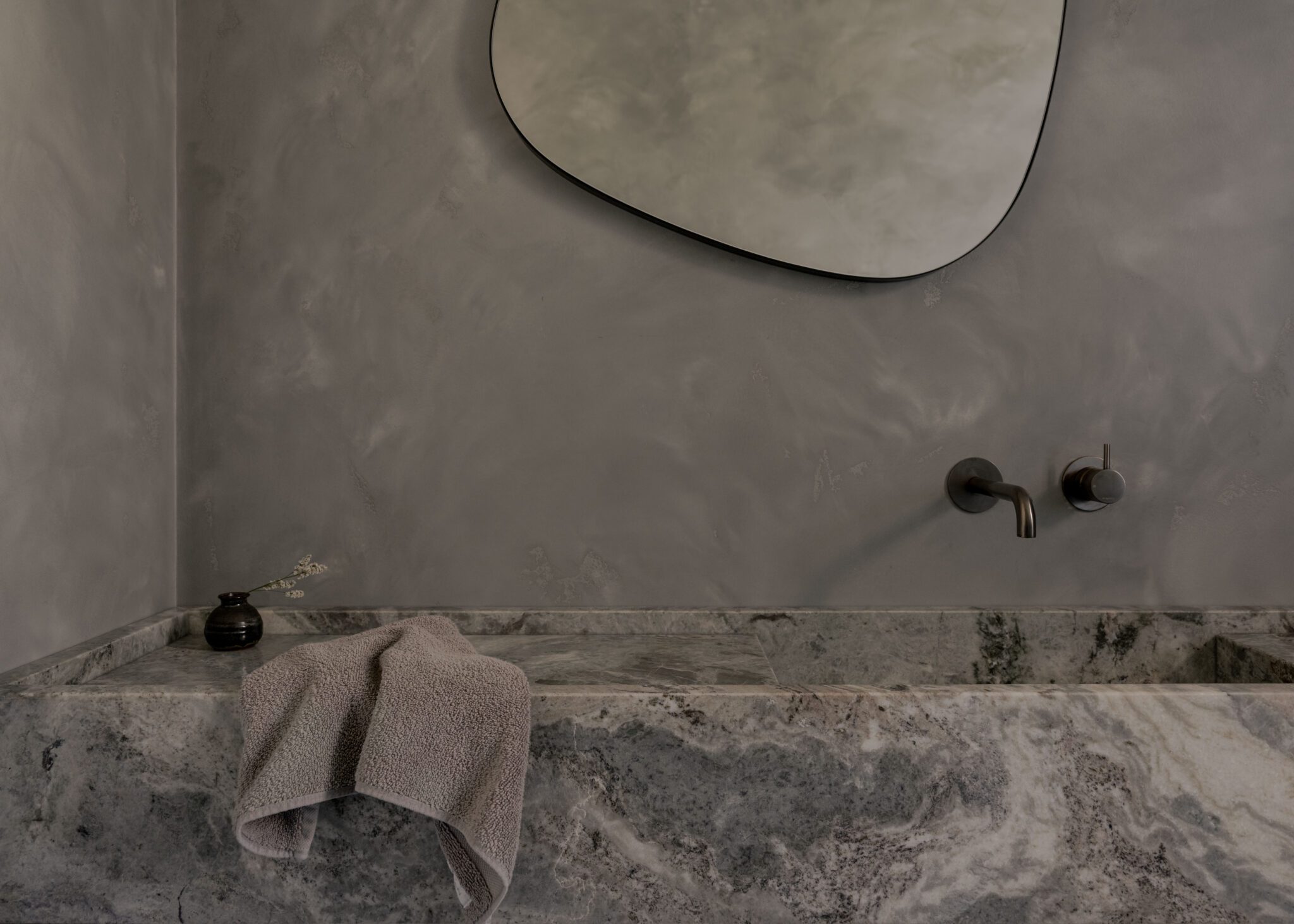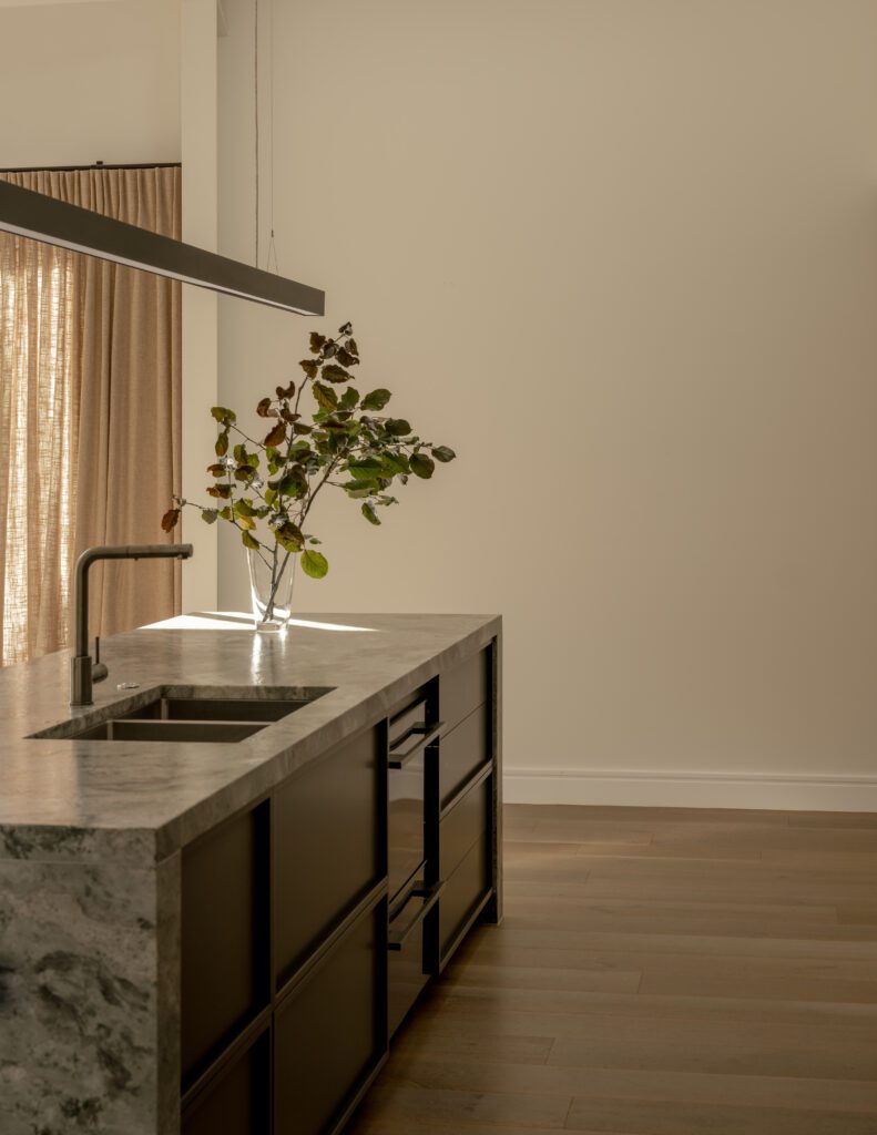 Buddy tapware in aged iron feels clean and contemporary in the bathrooms, while in the kitchen it feels darker and moodier against the layered material palette.