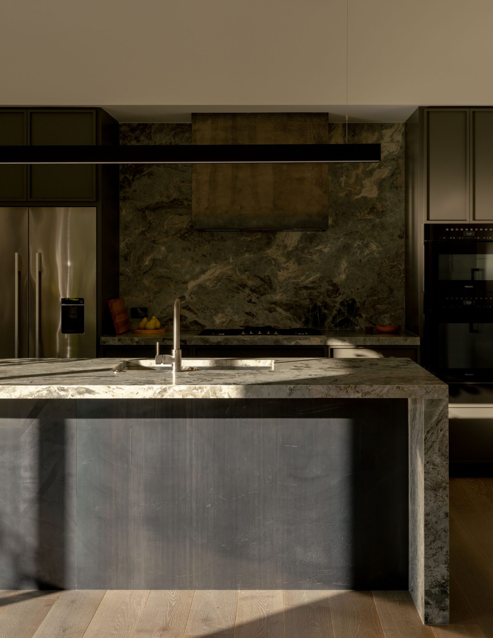 To further support this, the back of the island is clad in hot rolled blue steel, as is the range hood. “The clients wanted the house to feel relaxed but polished. It’s a home designed for fluctuating occupancy, so the interior materials had to support that with durability.”