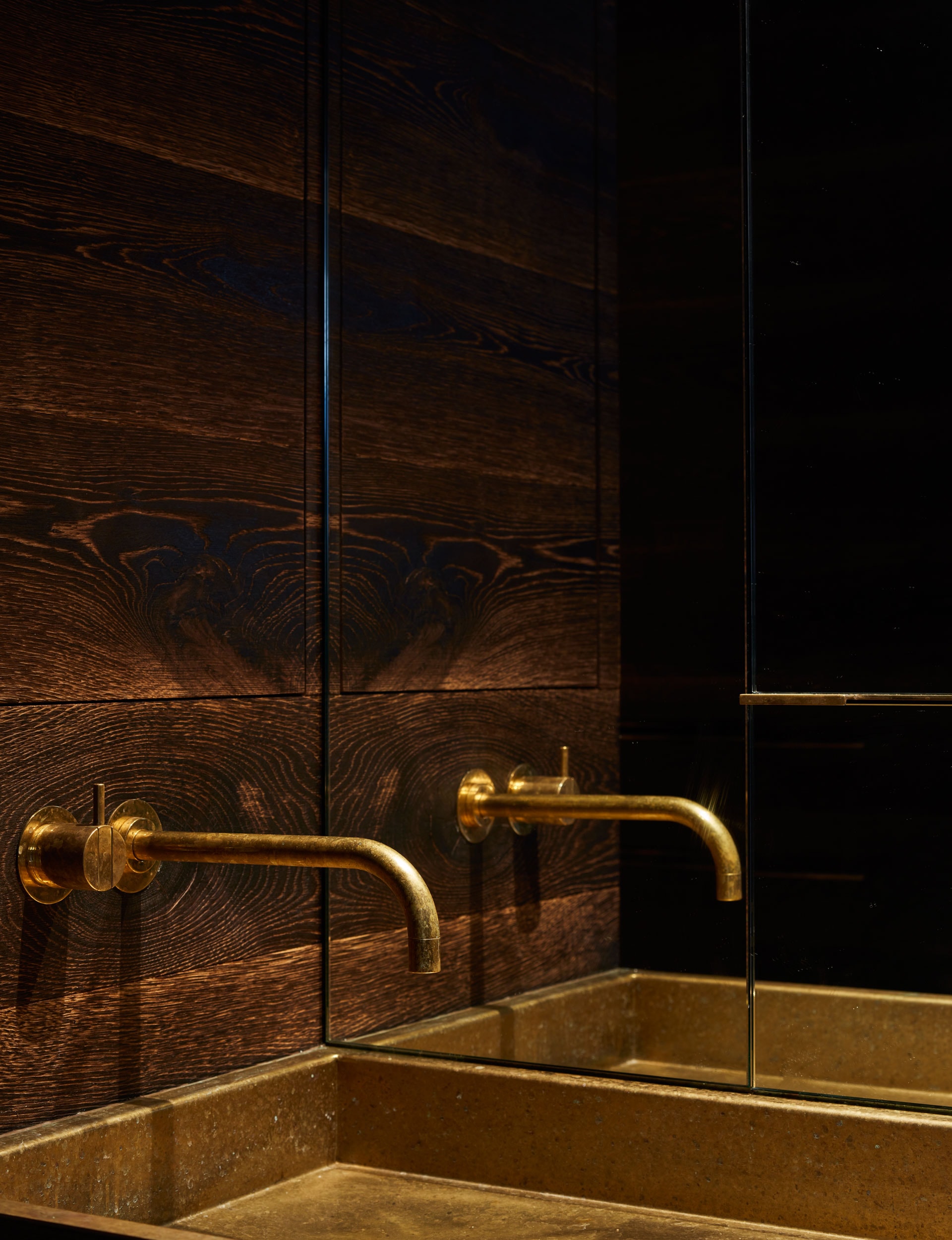 These are all materials with integrity, inducing of atmospheric softness. They come from the earth – albeit the zinc and copper in brass has been on a bit of a coital journey since then. They’re not synthetic, reflective, rejecting of sight or touch like the glossy whites and polished chrome of the antiseptic norm. Instead, they slowly accumulate the trace of our presence and are enriched by age. We are naked and vulnerable in our bathrooms. It seems right that their composition responds to this, not to bleach.