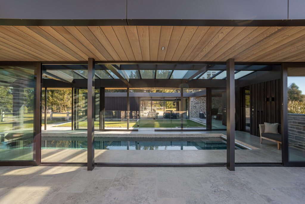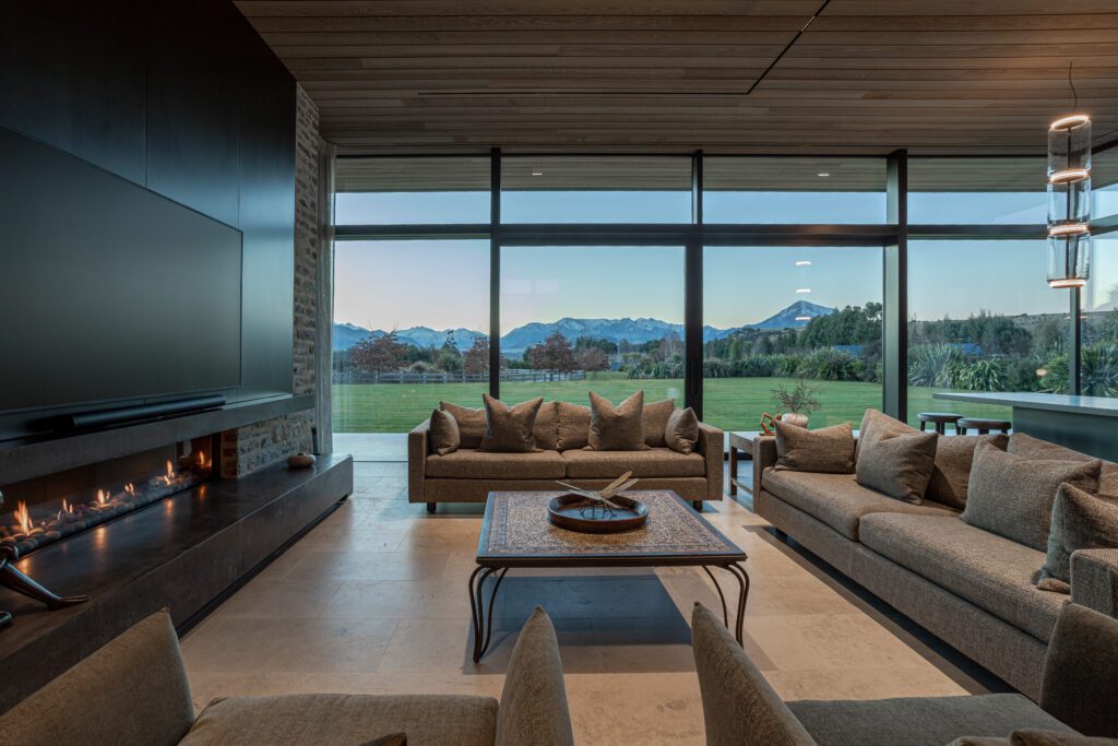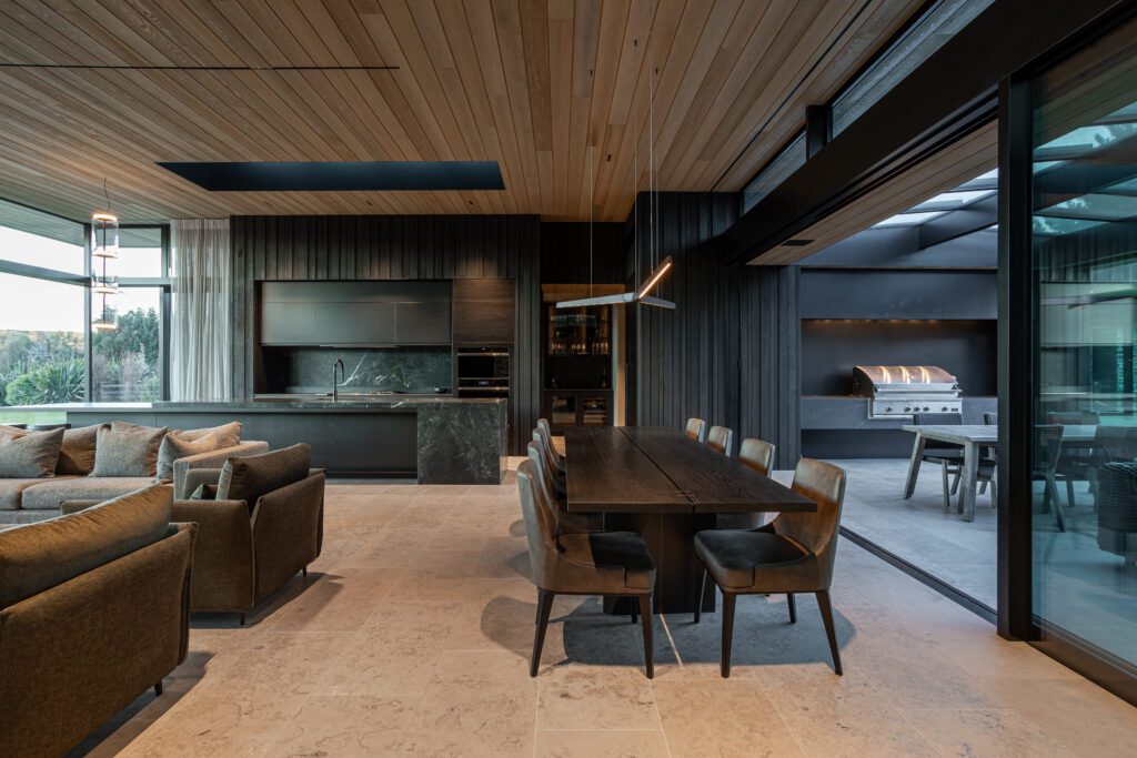 The exterior combines local schist, dark timber cladding, and finely detailed steel, establishing a tactile richness while maintaining a clean, timeless clarity. Inside, this material language continues through random profile cedar wall linings and exposed stone surfaces that visually anchor the floating roof planes to the ground, while expansive glazing draws light and views deep into the home.