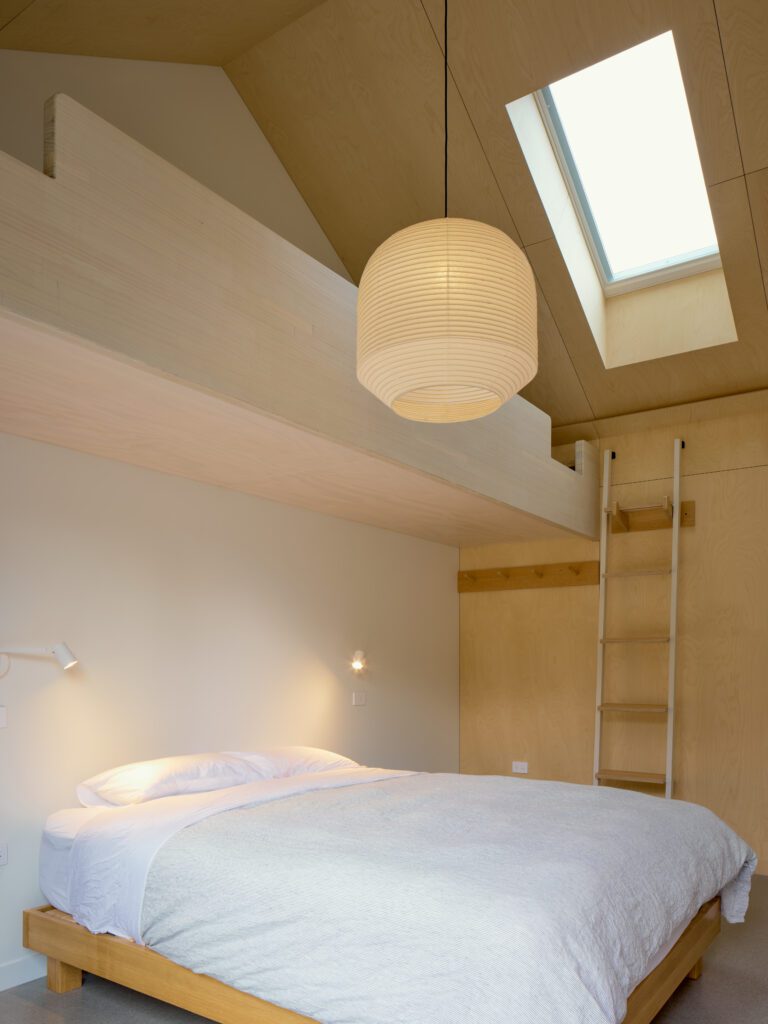 The sleeping pavilion has two ‘regular-sized’ bedrooms: a main bedroom, and a guest bedroom with a double bed and high cantilever, inbuilt bunk beds that can be accessed through two stepladders.