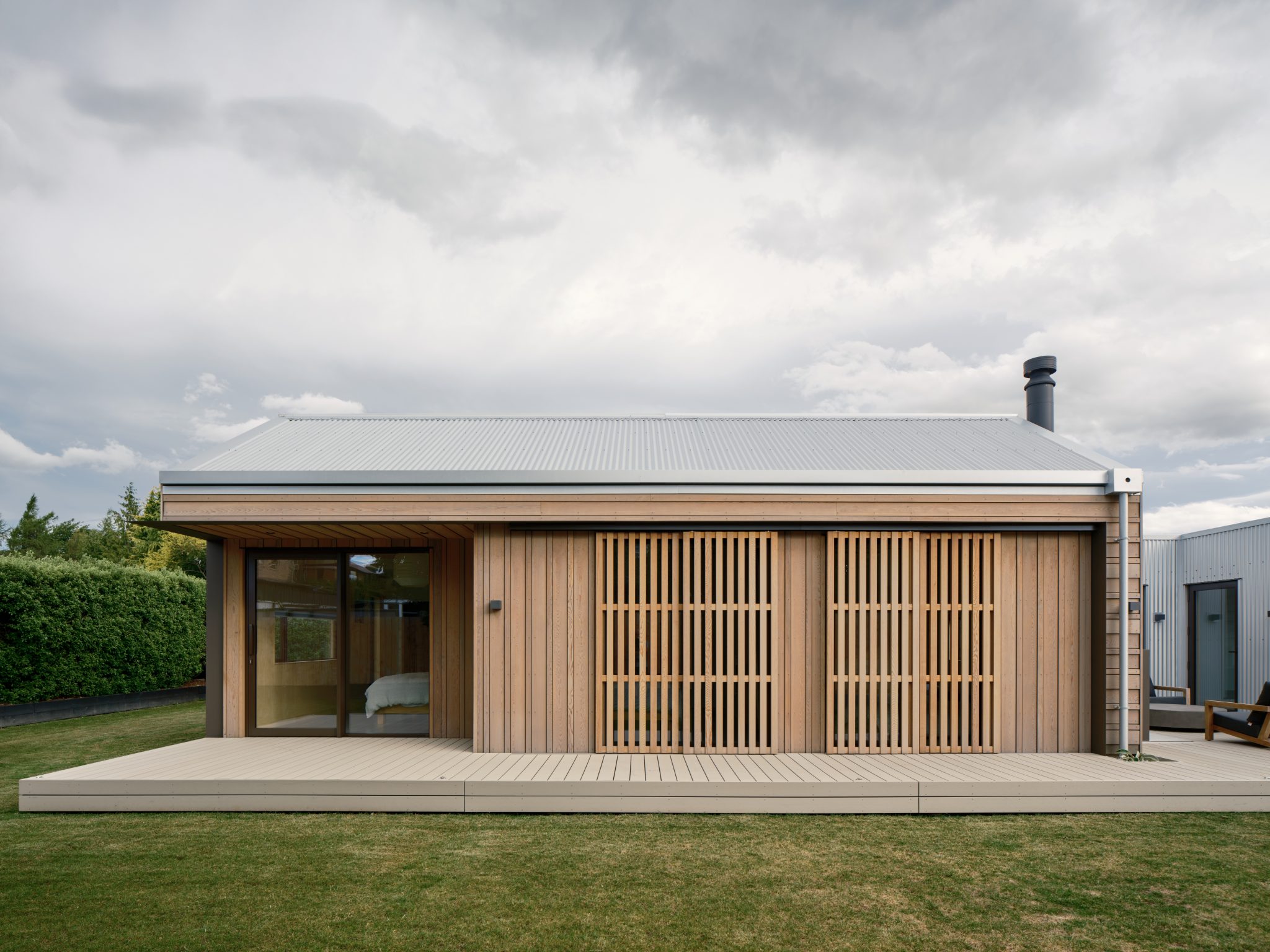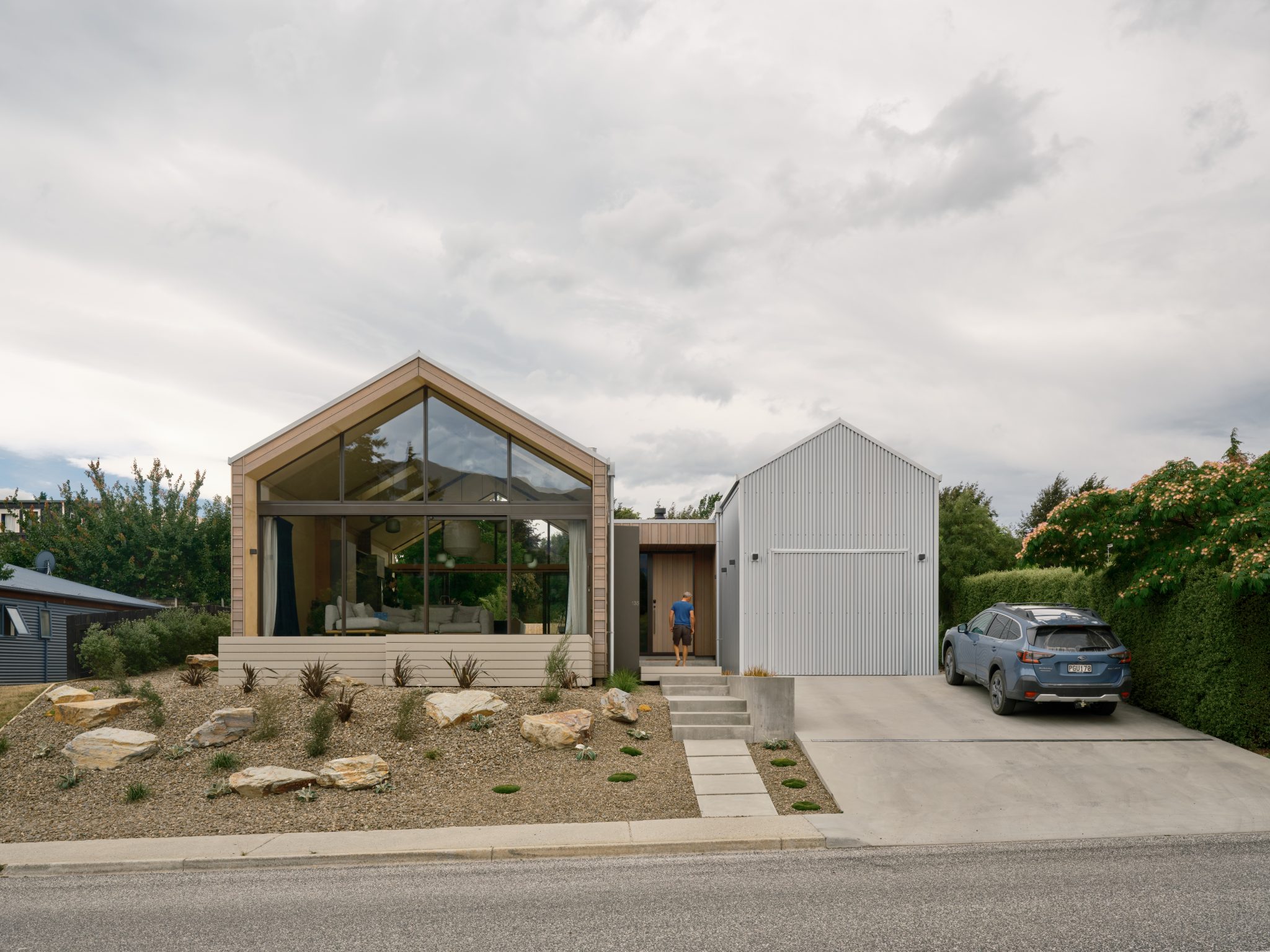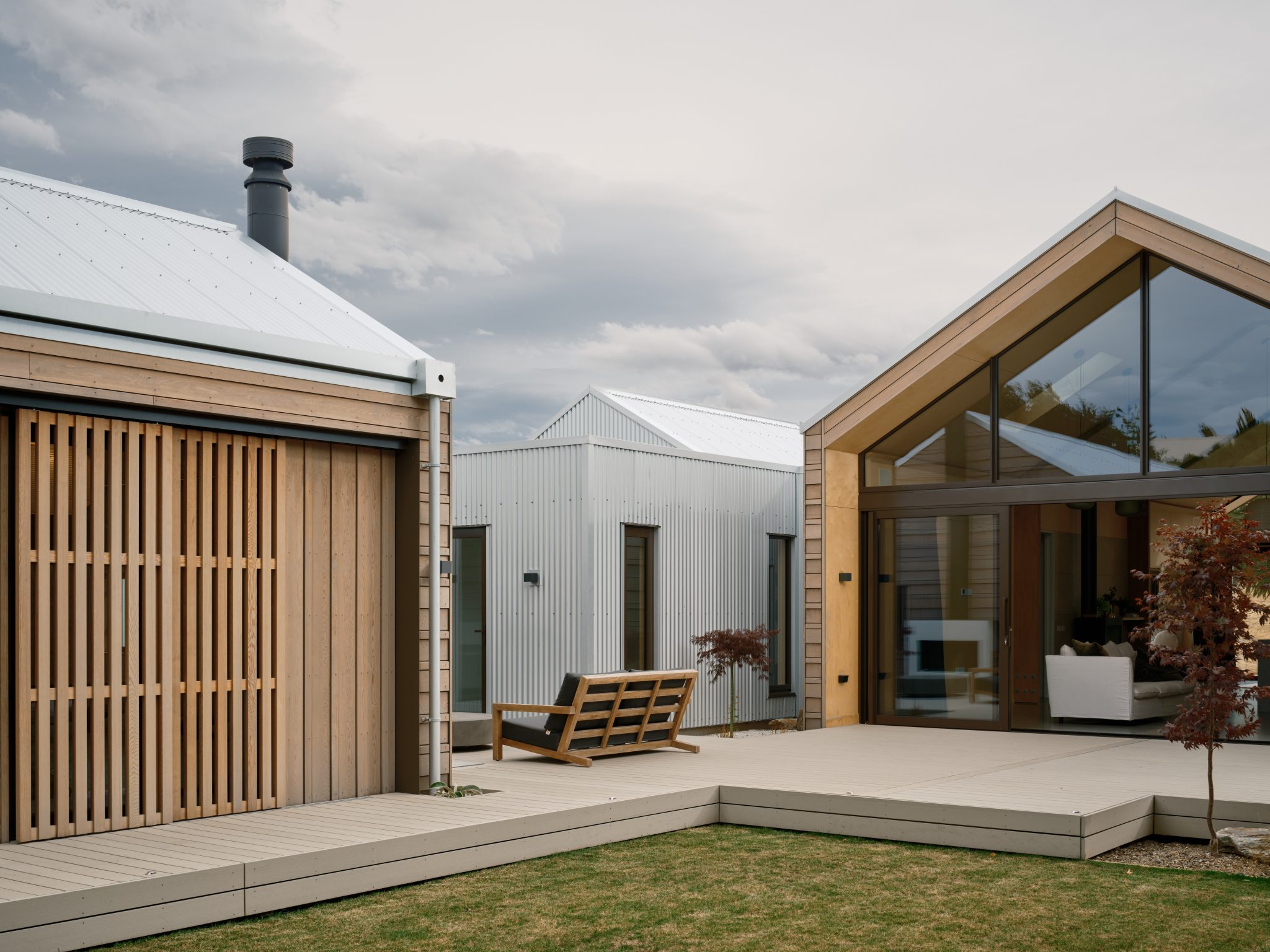 “The home is broken down into pavilions that reflect its three components, with a connecting gallery,” says Studio Pacific of the separate sleeping, living, and garage pavilions.