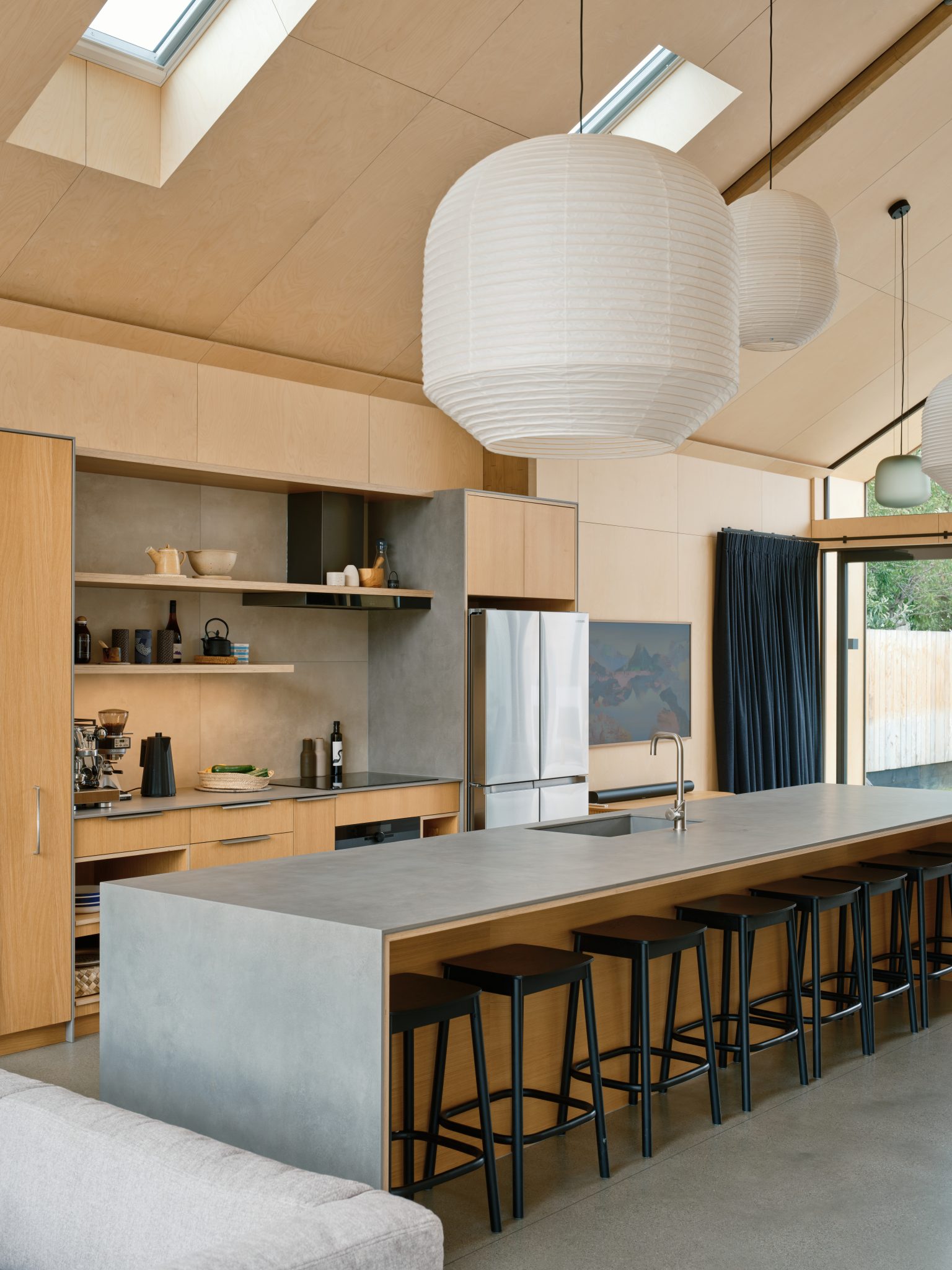 McDougall says, “[They give] this really beautiful, soft kind of glow to the ceiling. Because the curtains only go up to the lintels, the neighbours and anyone walking past can enjoy the ceiling without interfering with the privacy of the house.”