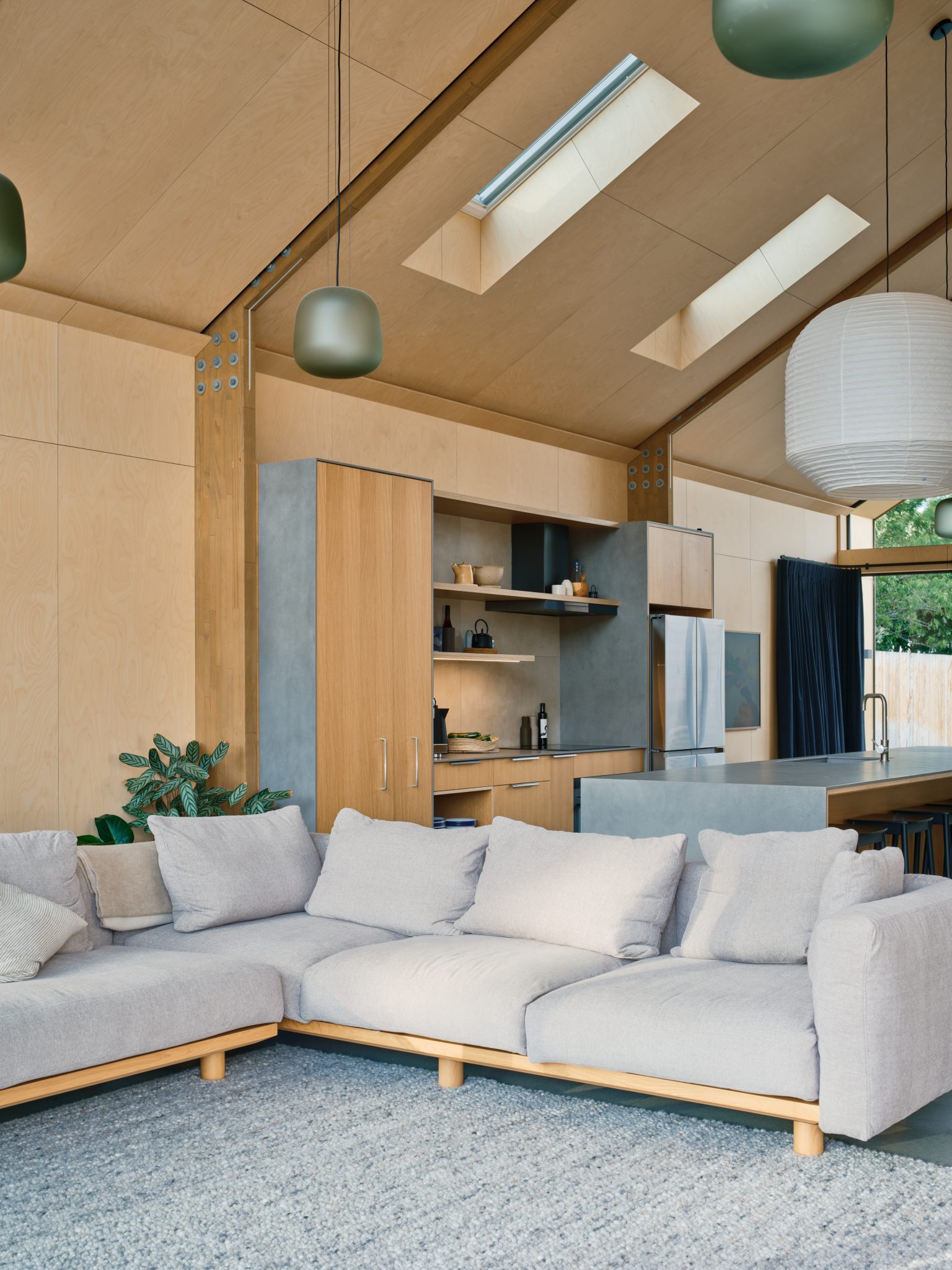 The living pavilion is the closest to the street and has been glazed on both sides, so views from the park are uninterrupted and light streams through it at various times of the day. There is a high ceiling here; its gable has been kept clear by the avoidance of structural rafters and the use of very well-selected light fittings (from Città and Simon James). “The living space is in two parts, you might say — a sitting area, which is more for the evening, and the other side, which is more daytime. The kitchen in the middle means that you can operate both sides,” McDougall explains.