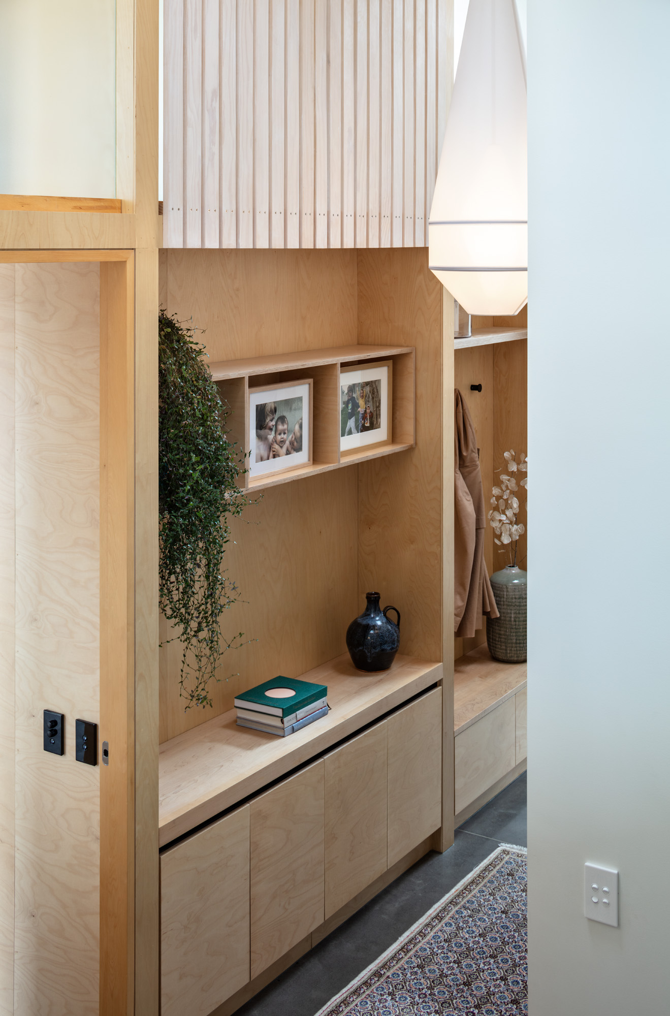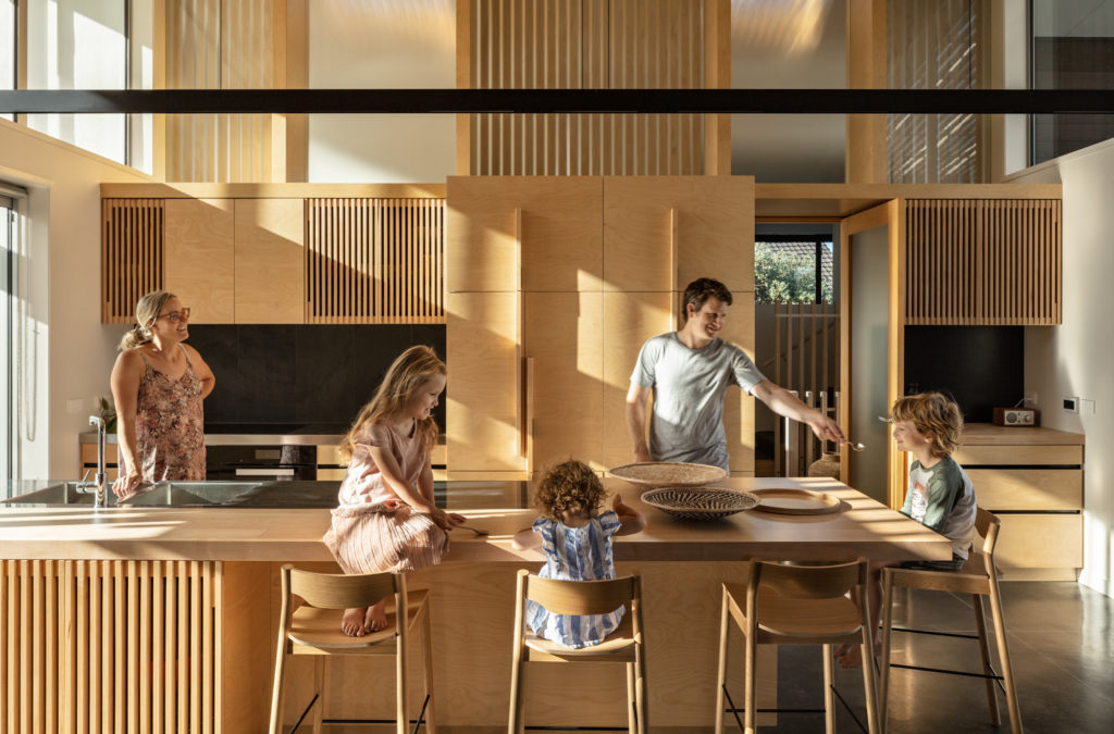 In the kitchen, that light falls, elongates, and dissipates across a palette of American maple, a birch ply ceiling, and birch veneer cabinetry, which moves between solid and vertically slatted to emulate the exterior. The combination is something to behold, with lines of light falling diagonally and horizontally across the space, creating a plethora of patterns as the sun moves throughout the day.