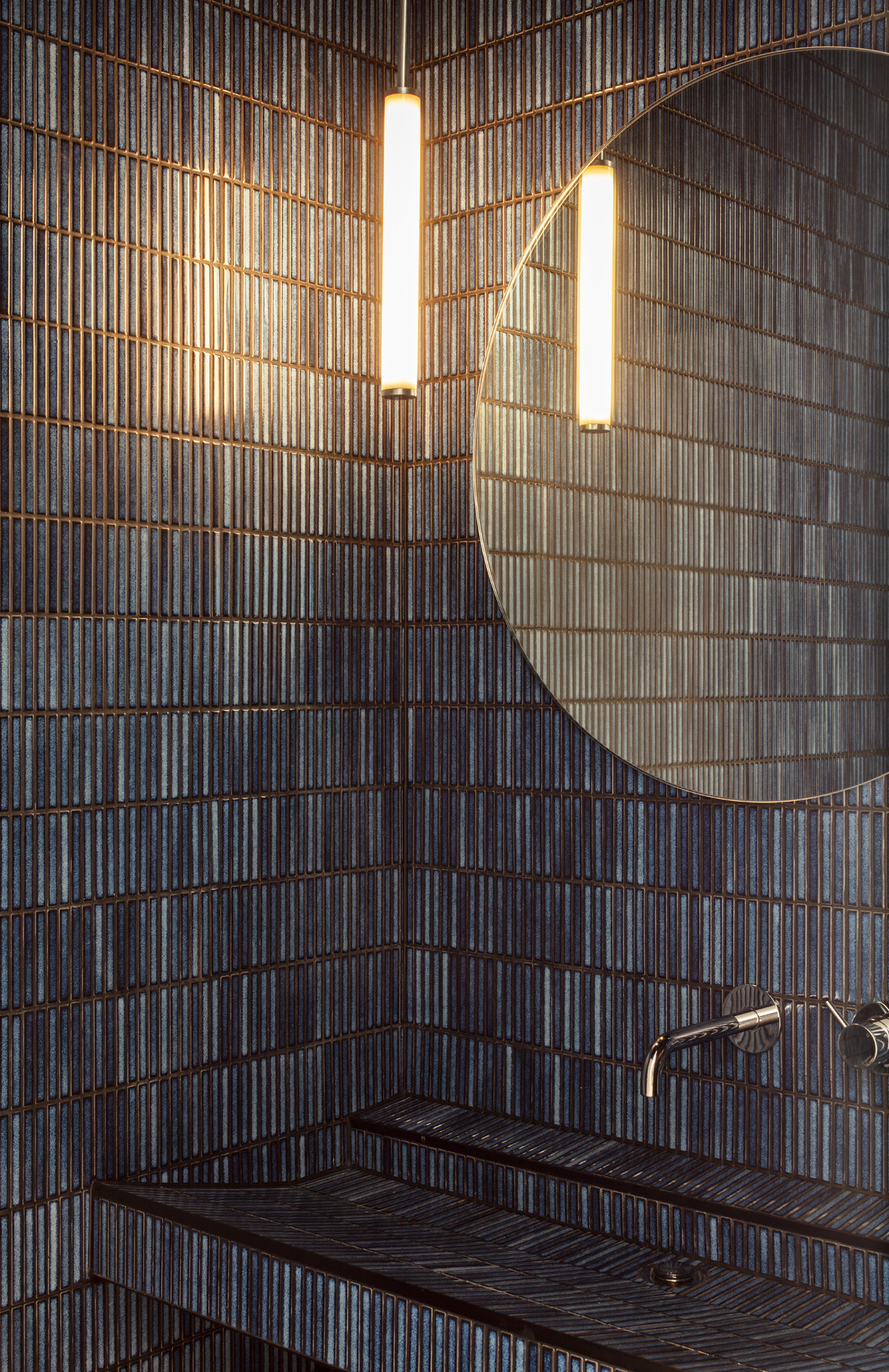 The usage of colour accents continues in this powder room with a deep blue. With dual-tone finger tiles across the walls and bespoke sink, the room is one of texture, geometric forms, and a divergence from the predominantly lighter palette elsewhere — it’s deep, moody, and devoid of the bright, warm light that defines the rest of this home.