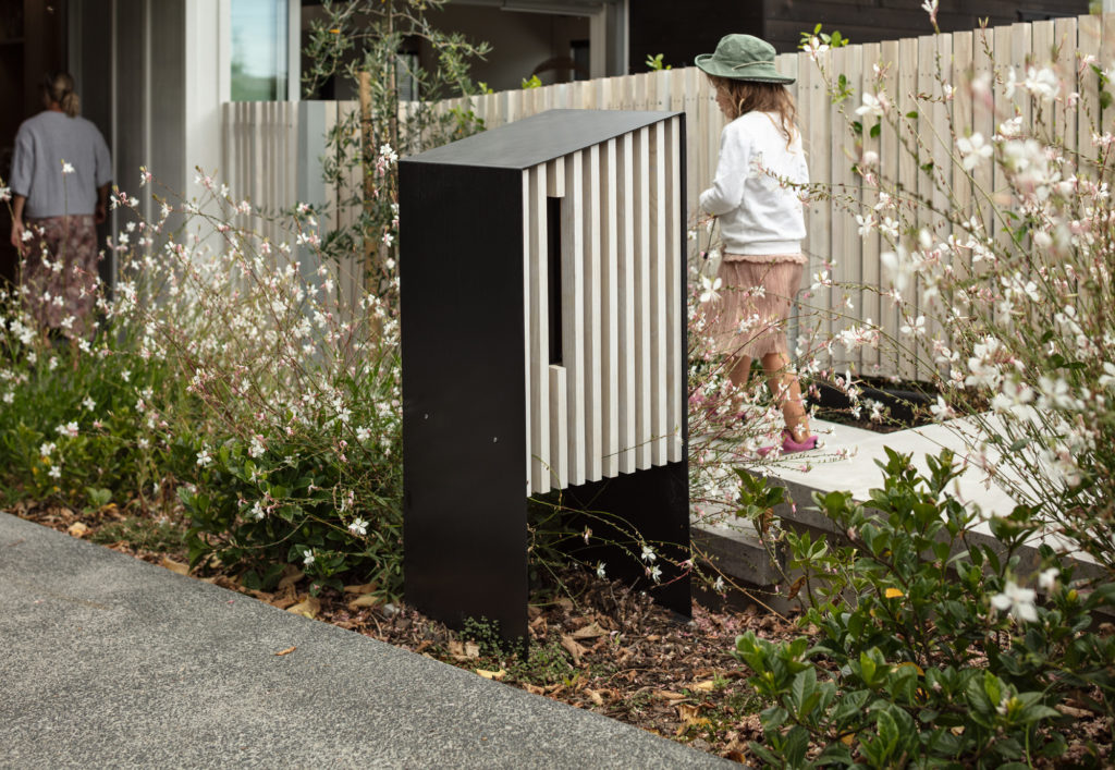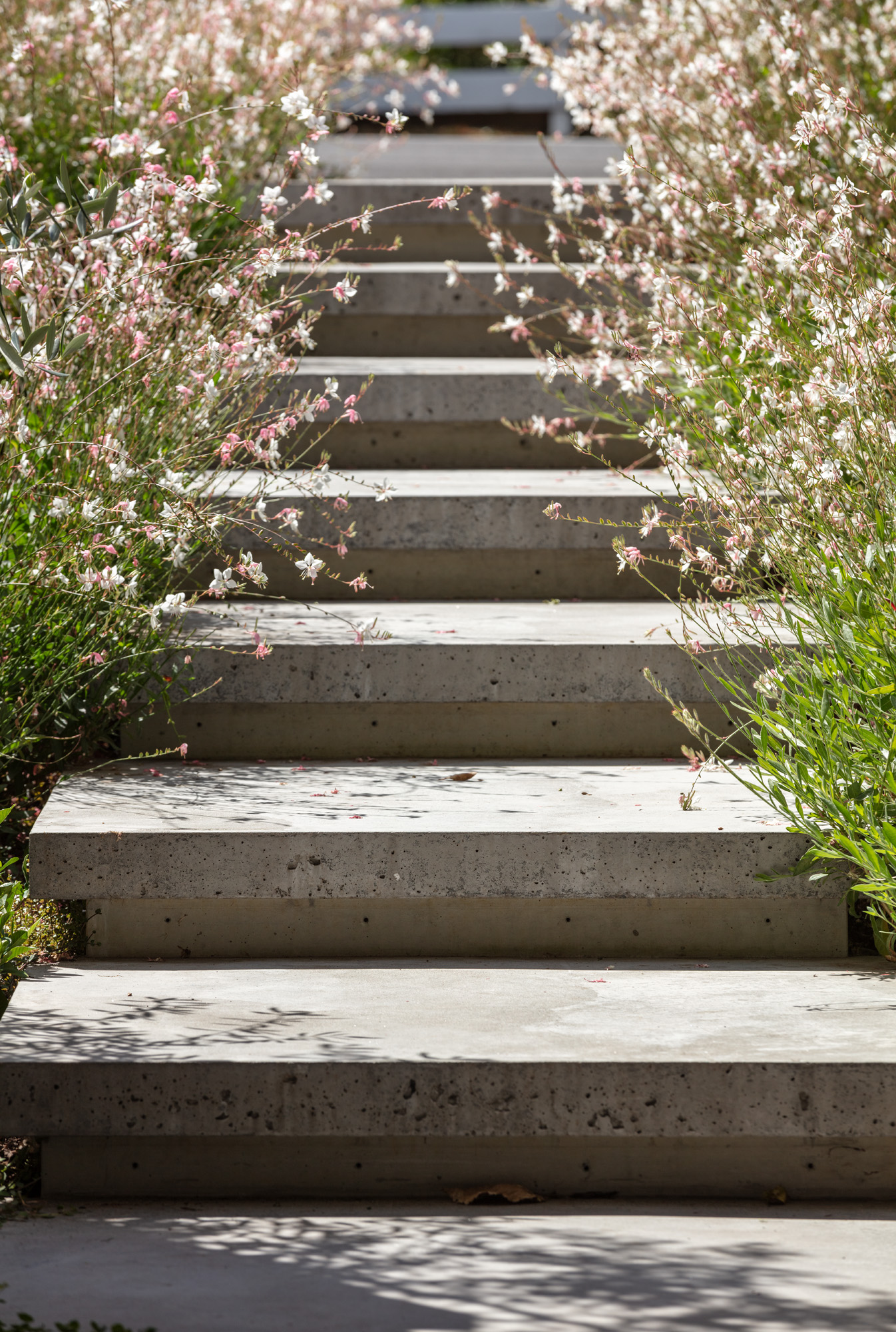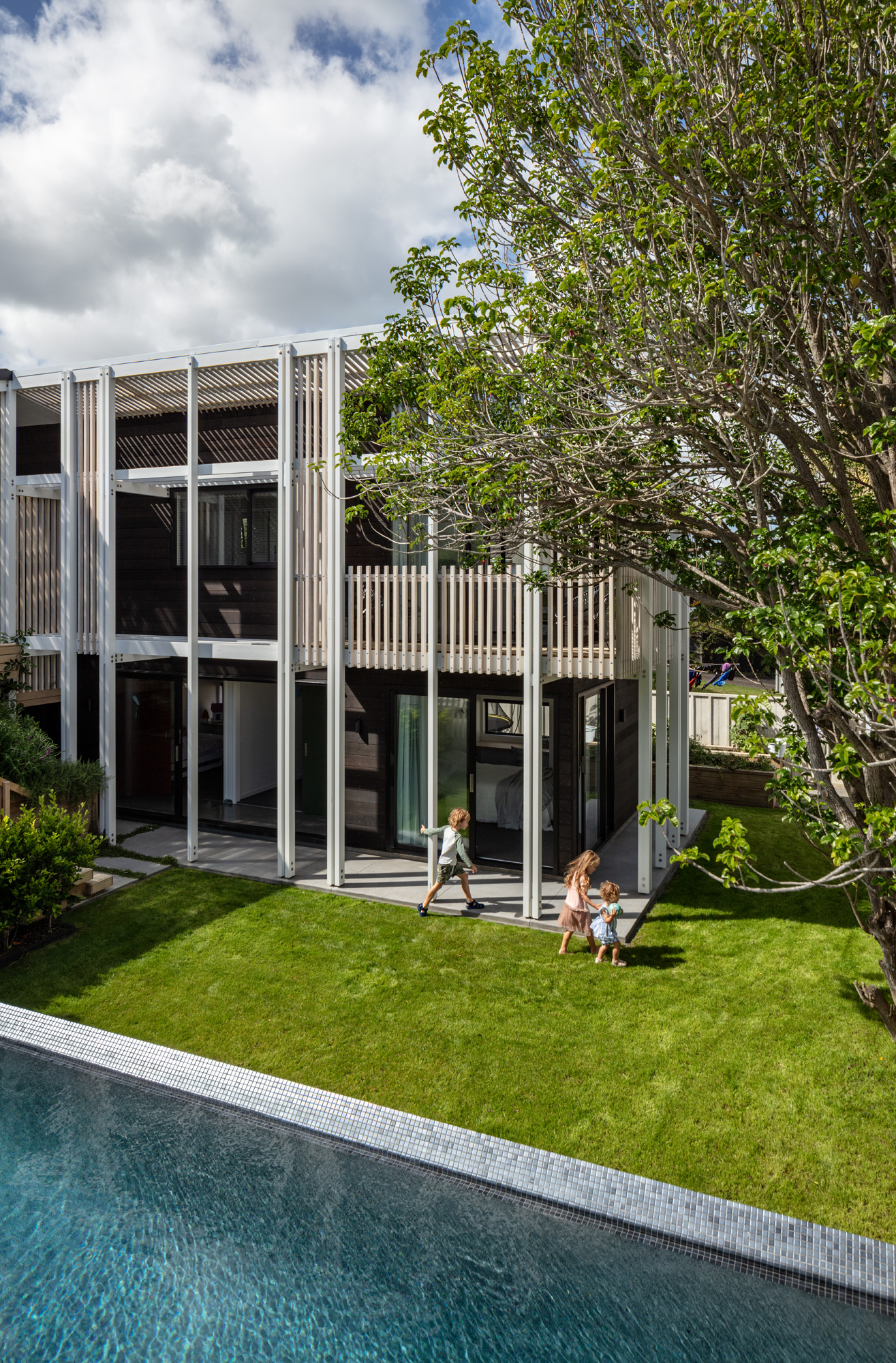 Located half a level down is access to the pool, which runs along the northern boundary, via a white linear fence. Due to its height, the southern edge of the concrete pool becomes a natural fence along the lawn.